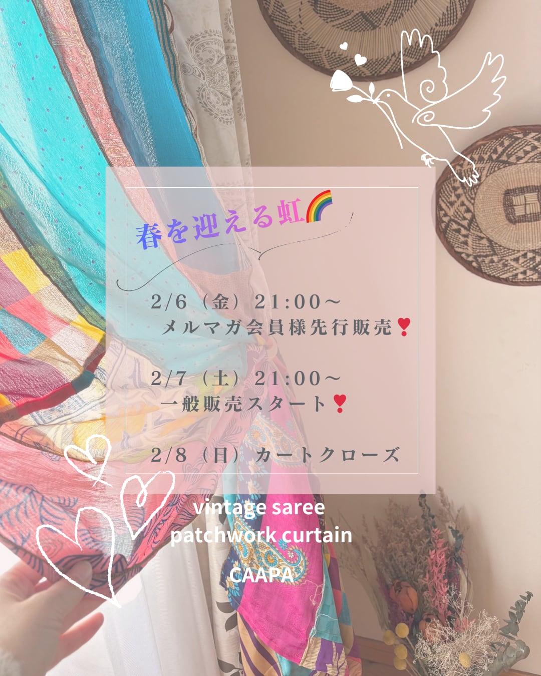 インド直輸入!! ヴィンテージサリーで出来たパッチワークシルクカーテン CAAPAで1番人気の《虹色カーテン》 【鳥たちの楽園】 オウムや南国にいるような鳥たちがたくさん⭐︎ 優しいピンクと美しいライトグリーンの組み合わせが絶妙で、とてもHappyな気持ちにしてくれます♬ ○2枚セット(1枚ずつでの使用も可能です) ○素材 シルク(他素材も含まれています) ○サイズ:縦約212cm✖️横約115cm ↑1枚のサイズです。 (左右差が多少ある場合もあります。) ○上部は筒状になっており、突っ張り棒がありましたらどこでも使えます。 また既存のカーテンレールにカーテンフック、カーテンクリップ等で挟んで使うことも可能です。 上部を折り曲げてクリップで挟めば、長さ調節もできます。 (カーテンフックは含まれません) *************** インドから直接お取り寄せいたしました。 インドの女性が大切に扱っていたシルクのサリーを 1枚1枚丁寧に繋ぎ合わせ、大変カラフルできれいなパッチワークカーテンにアップサイクルされました!! 布、色の組み合わせ、配置など... 世界に同じものは1枚もありません。 程よい透け感で太陽の光が入るとお部屋に虹がかかったかのように明るく華やかになります♡ ※カーテンとしては新品未使用ですが、布はヴィンテージサリーを使っております。 小さな穴やほつれ、汚れ、シミ、色褪せ等があることもございますが、それもヴィンテージの良さと捉えていただけると幸いです。 ※ご使用のモニターや日光によりお色味の違いが見られる場合がございます。 ※シルク製品の為、手洗いがおすすめです。 また、海外製であり、1枚ずつ手作業で作っているため、サイズの多少の誤差がございますのでご了承ください。
