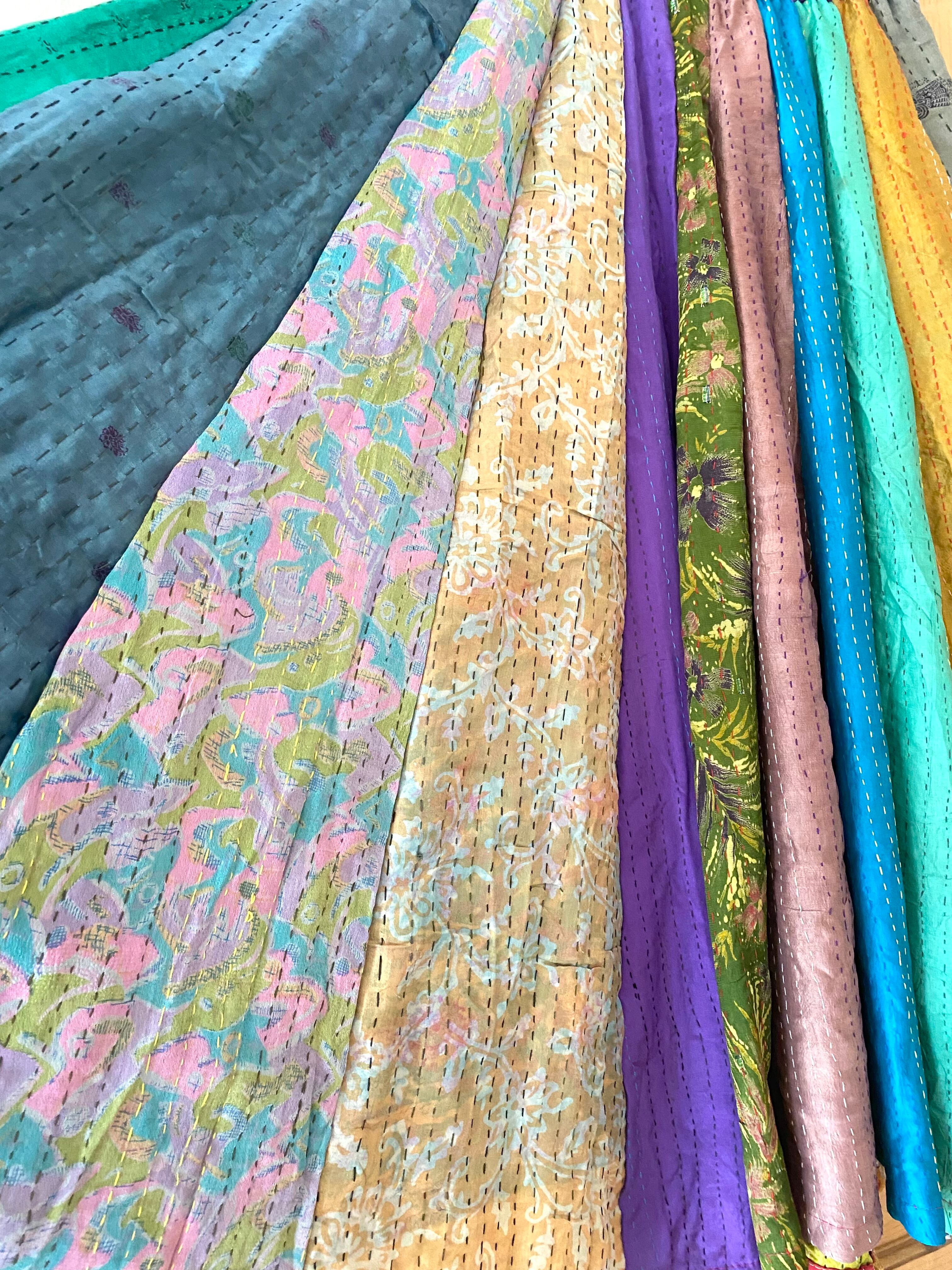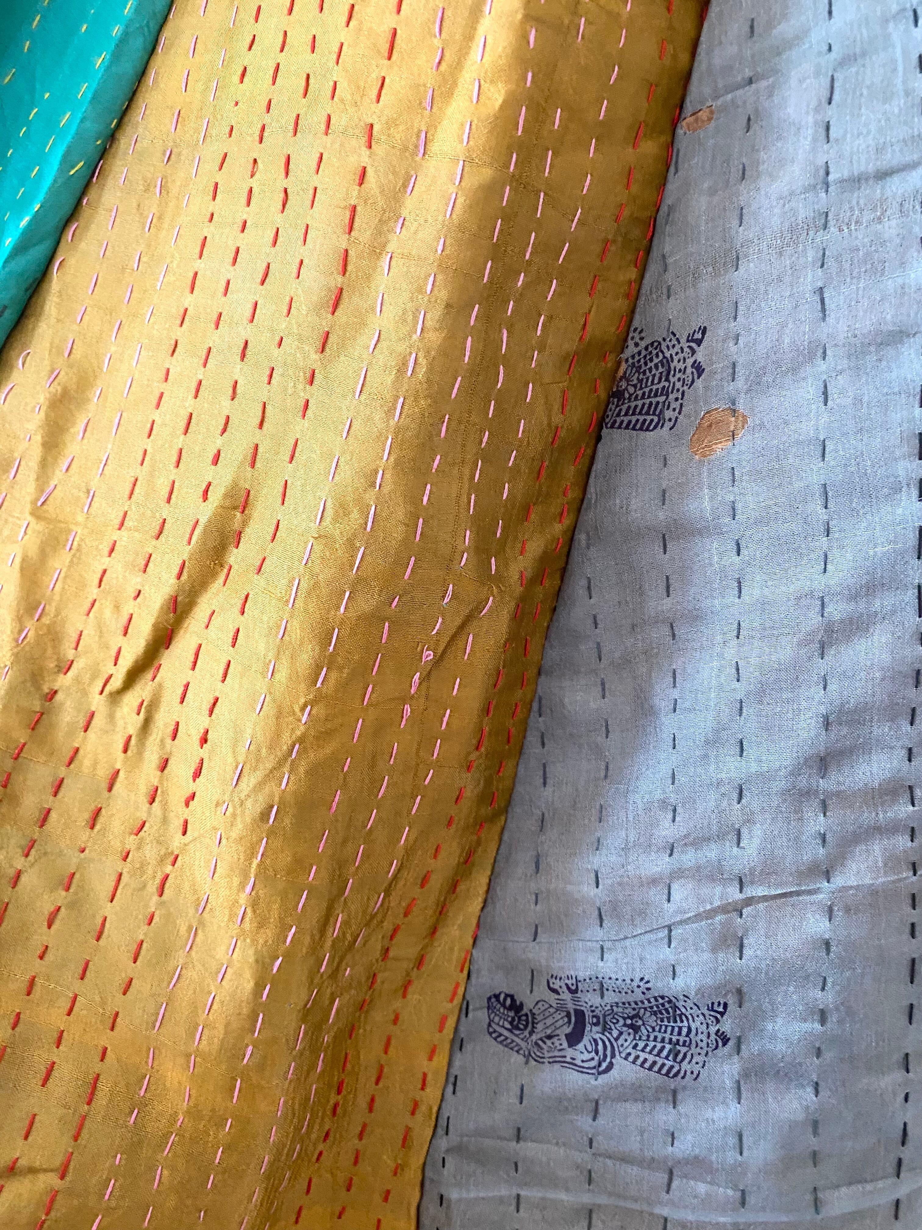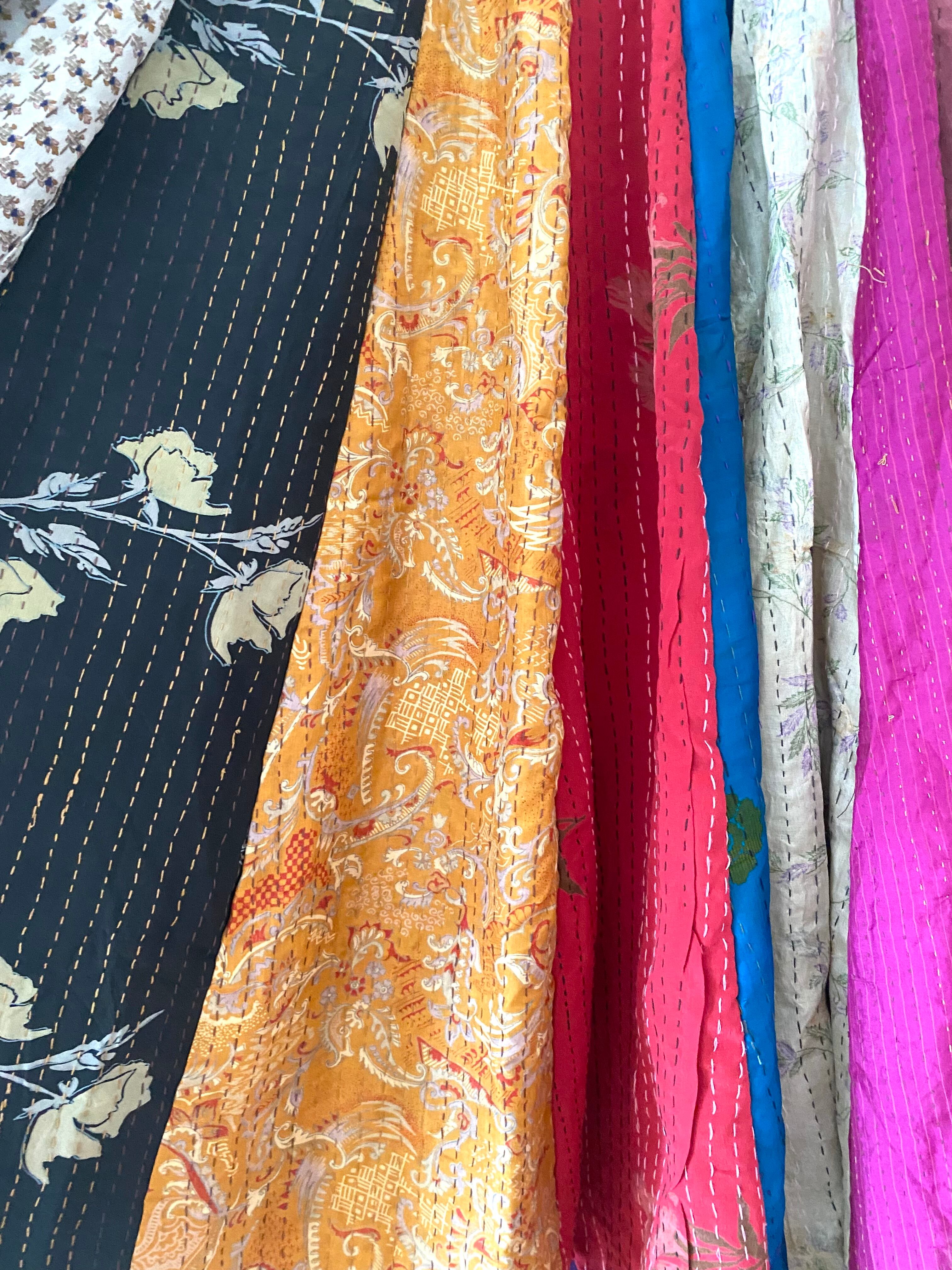 それぞれ異なる色柄のサリーを組み合わせ、カンタ特有の細やかなステッチが布と布を優しくつなぎ合わせています。