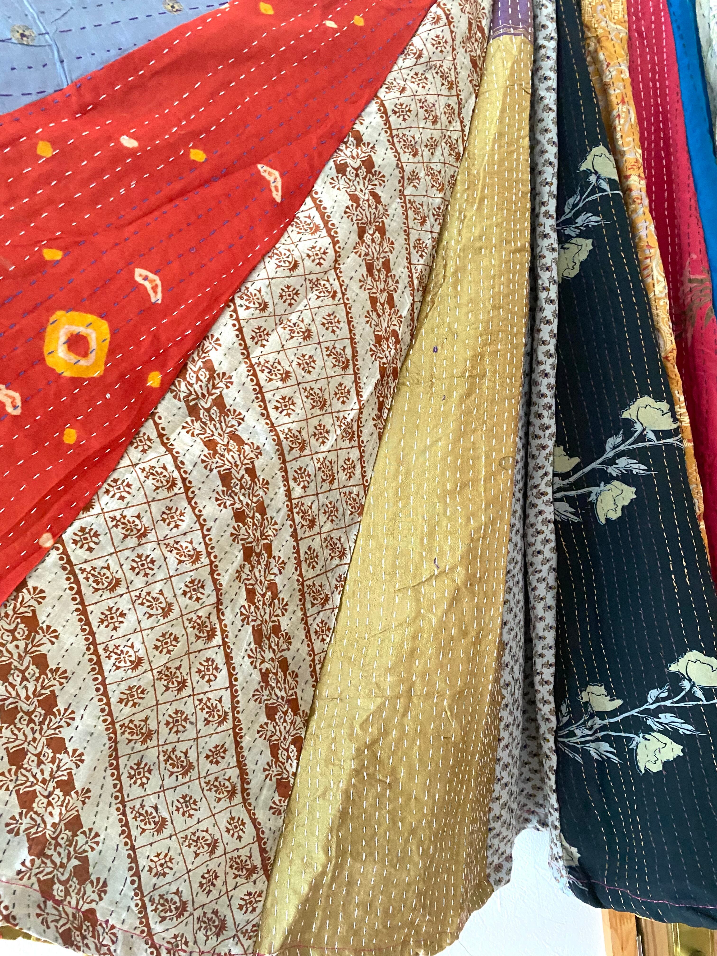 インドのヴィンテージサリーを丁寧に重ね、手仕事の温もりが詰まった「カンタ刺繍」の布を贅沢に使用した、一点もののパッチワークスカートです。