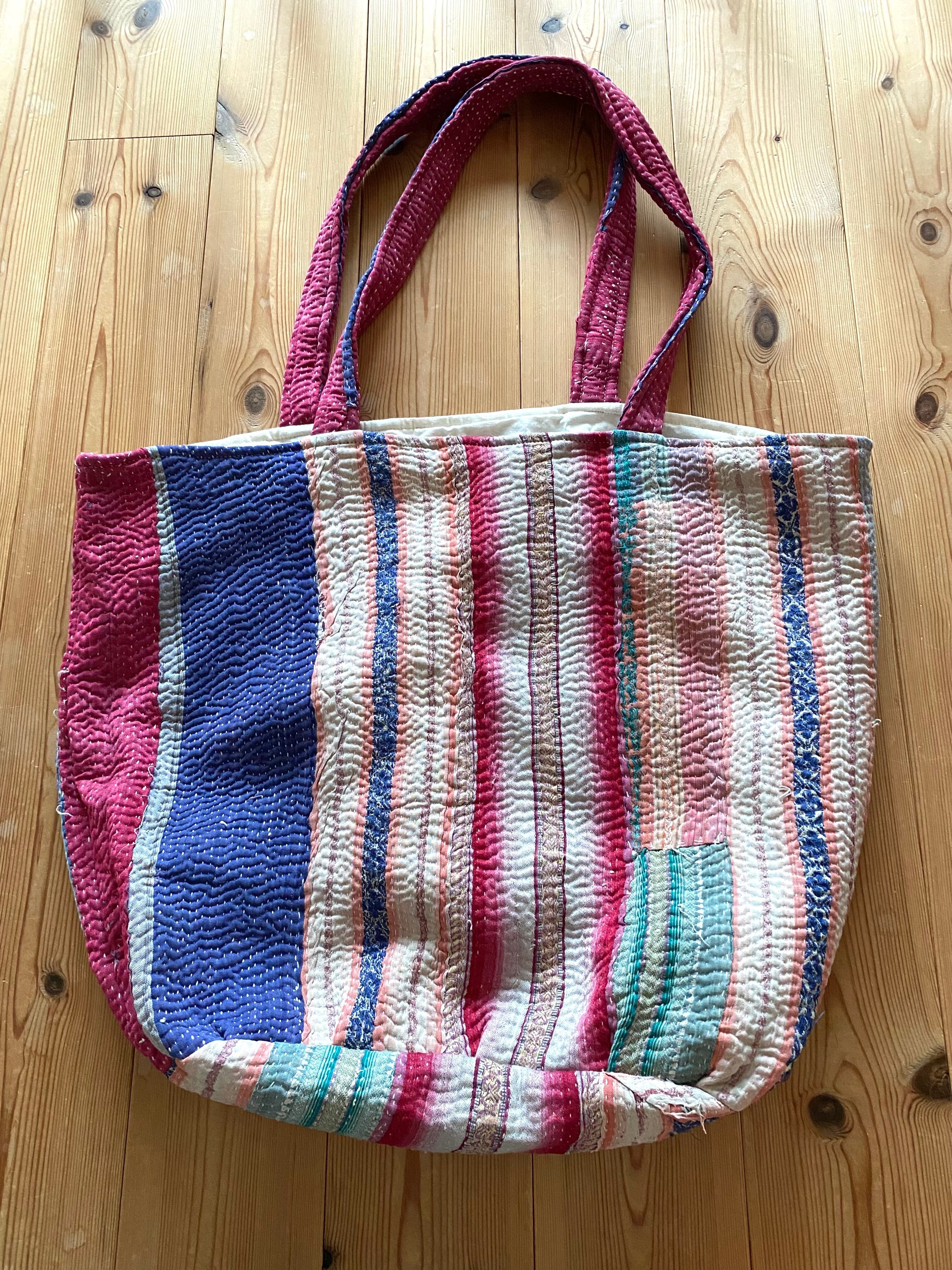 インドの伝統カンタ刺繍を施した、カンタ刺繍キルトをパッチワークにした、程よい大きさのトートバッグです!!
