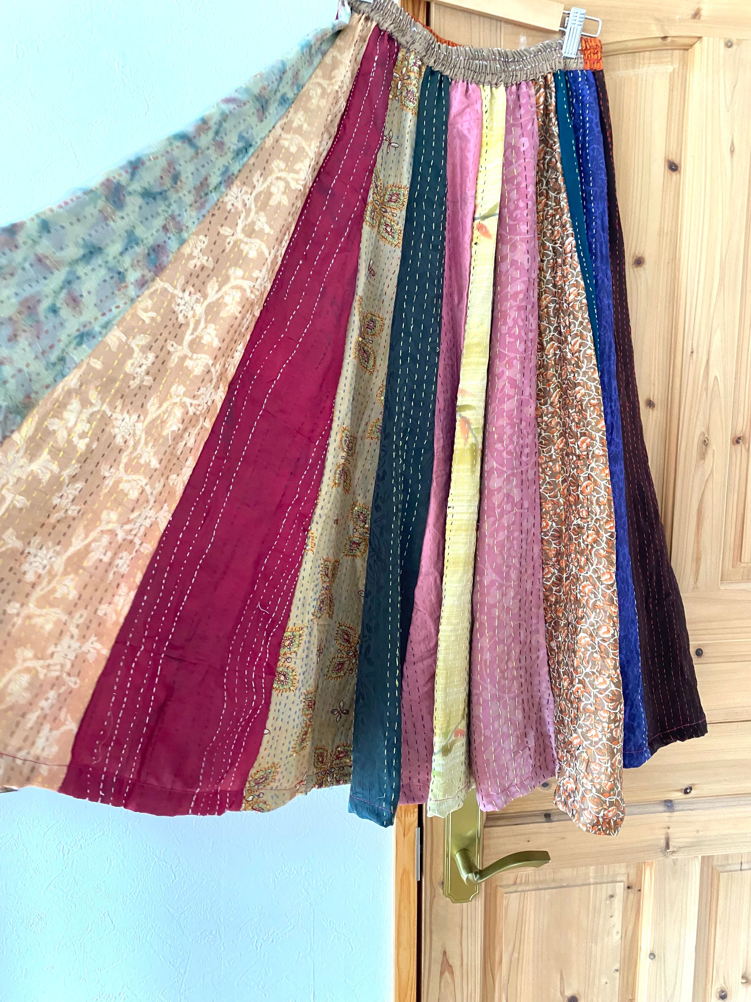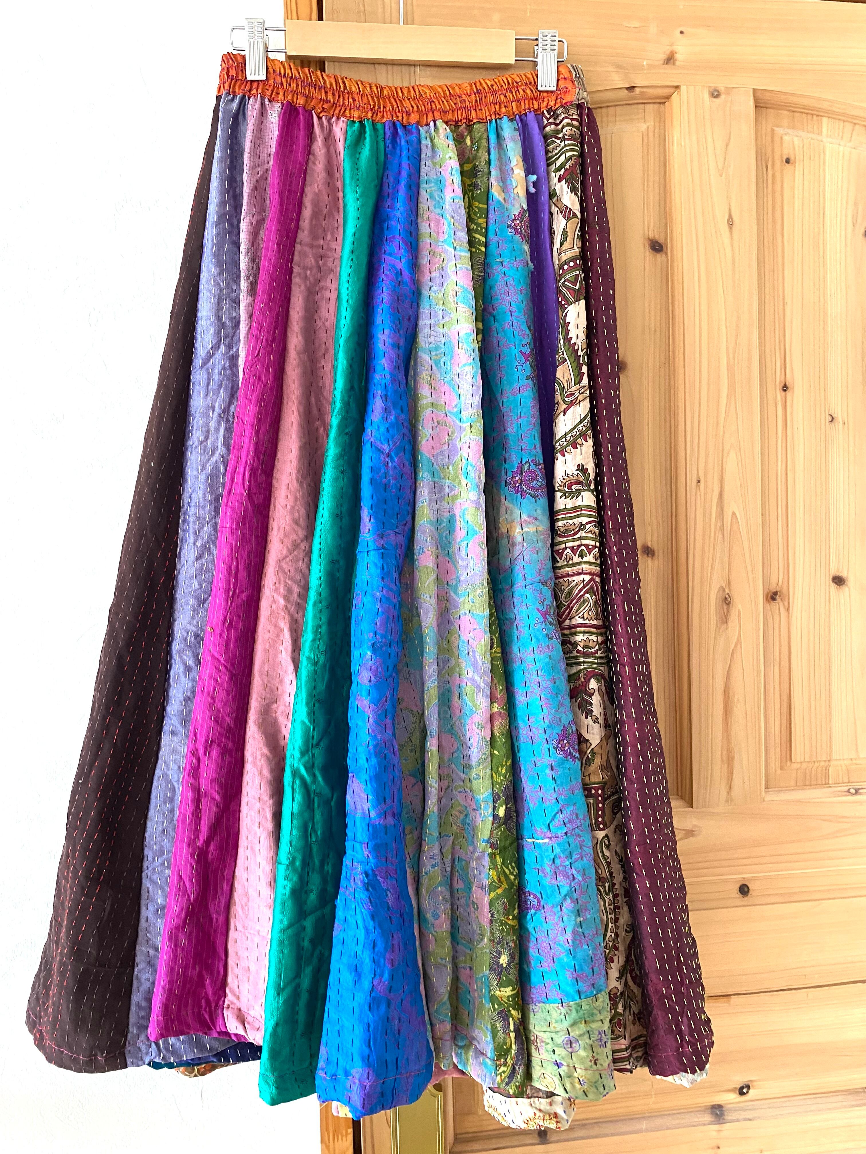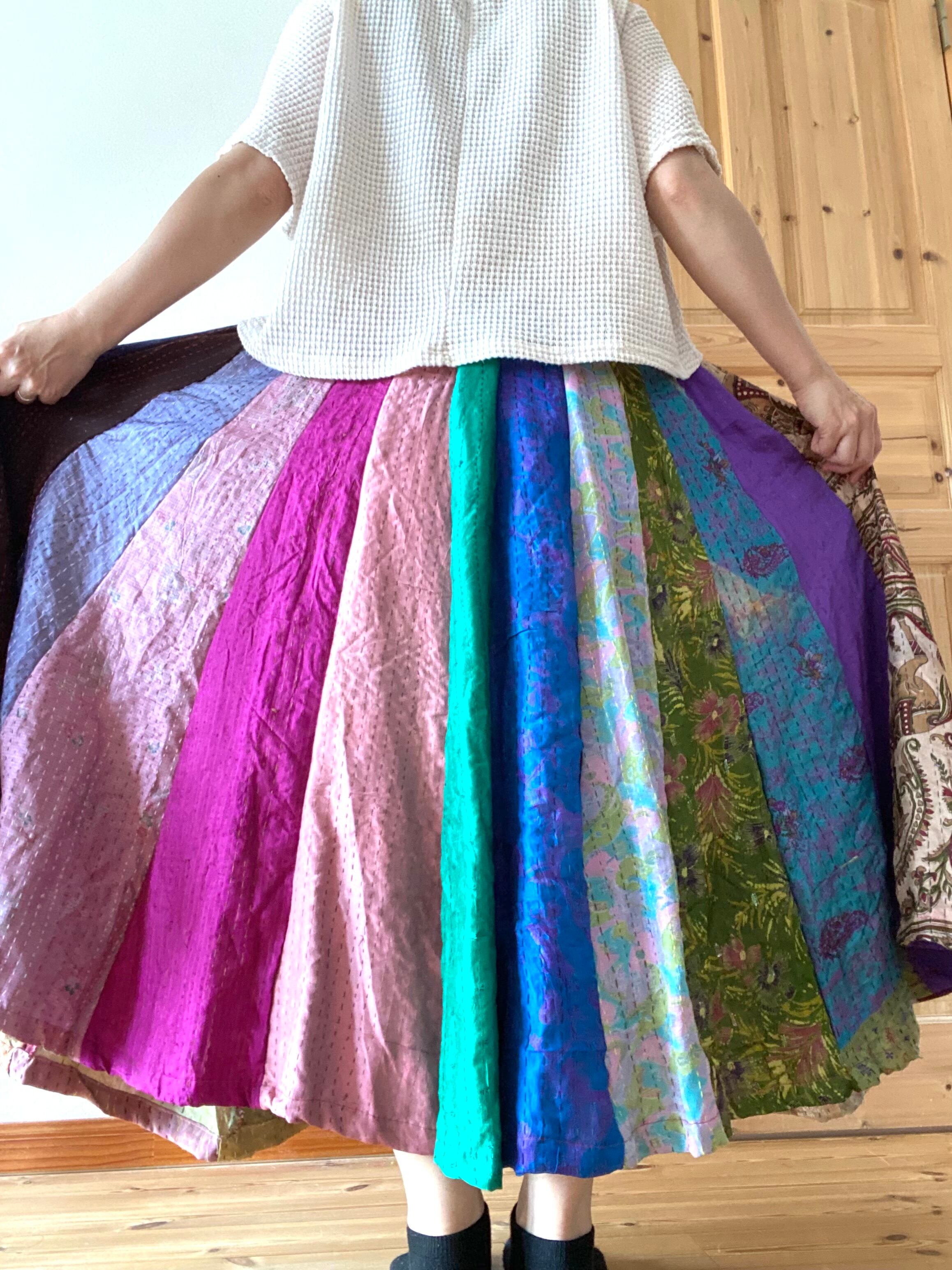 インドのヴィンテージサリーを丁寧に重ね、手仕事の温もりが詰まった「カンタ刺繍」の布を贅沢に使用した、一点もののパッチワークスカートです。