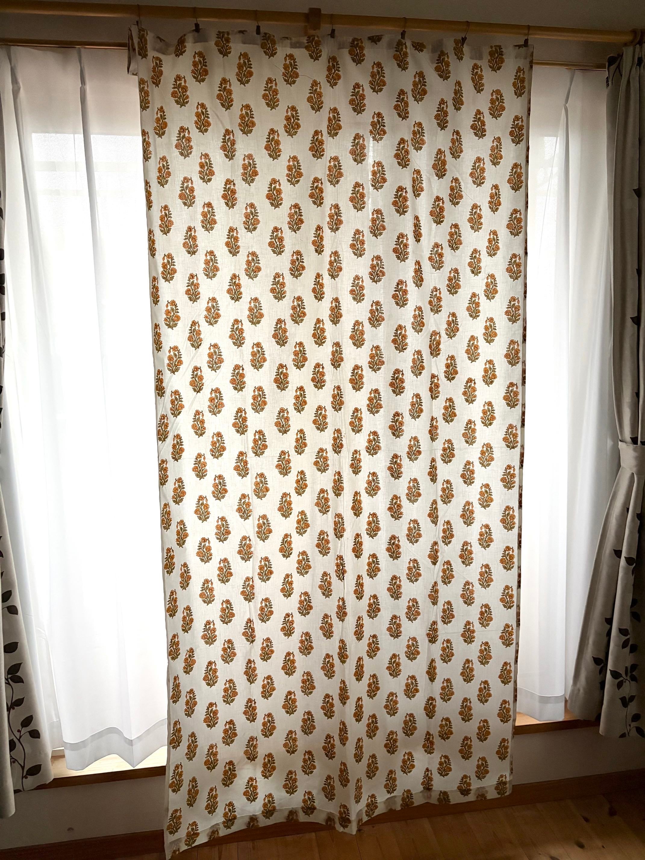 インドの職人さんによる伝統的な「ブロックプリント(木版染め)」で、ひとつひとつ丁寧に手刷りされた布を使ったカーテンです。