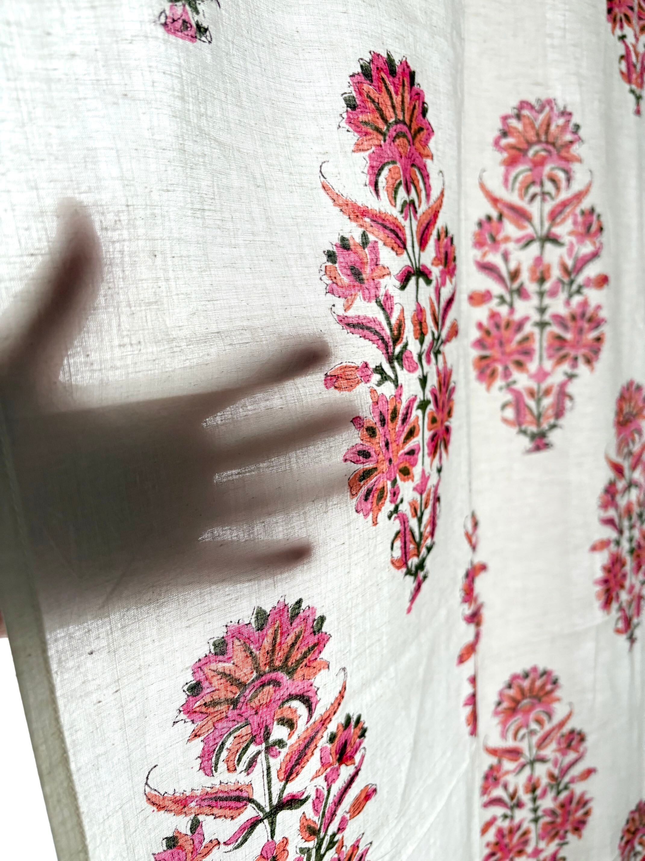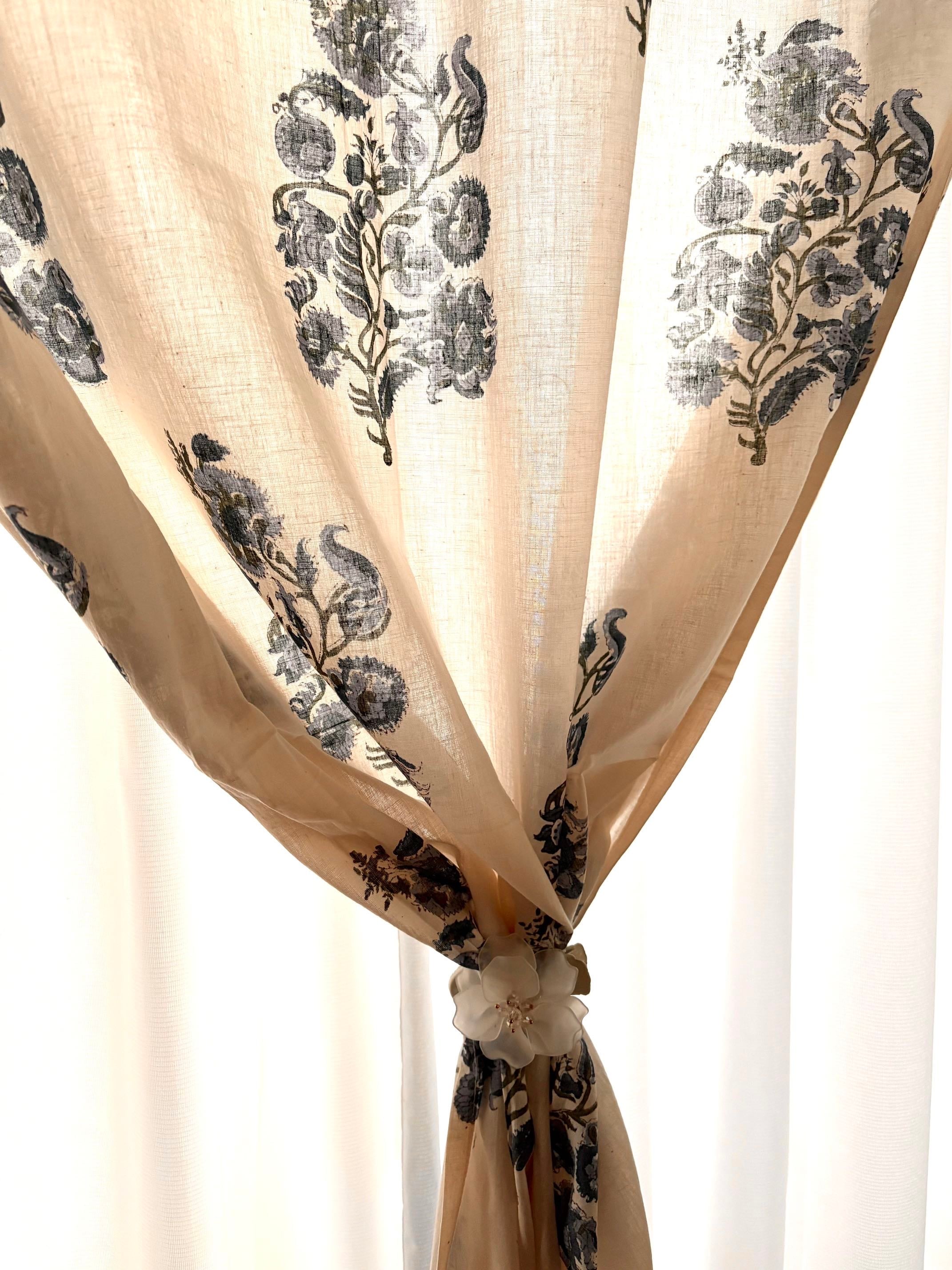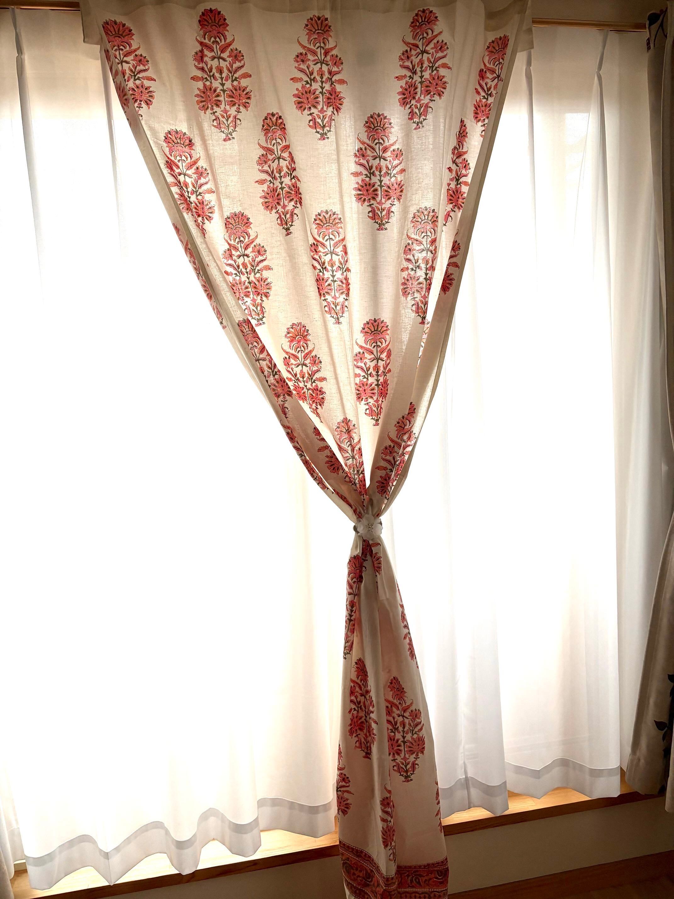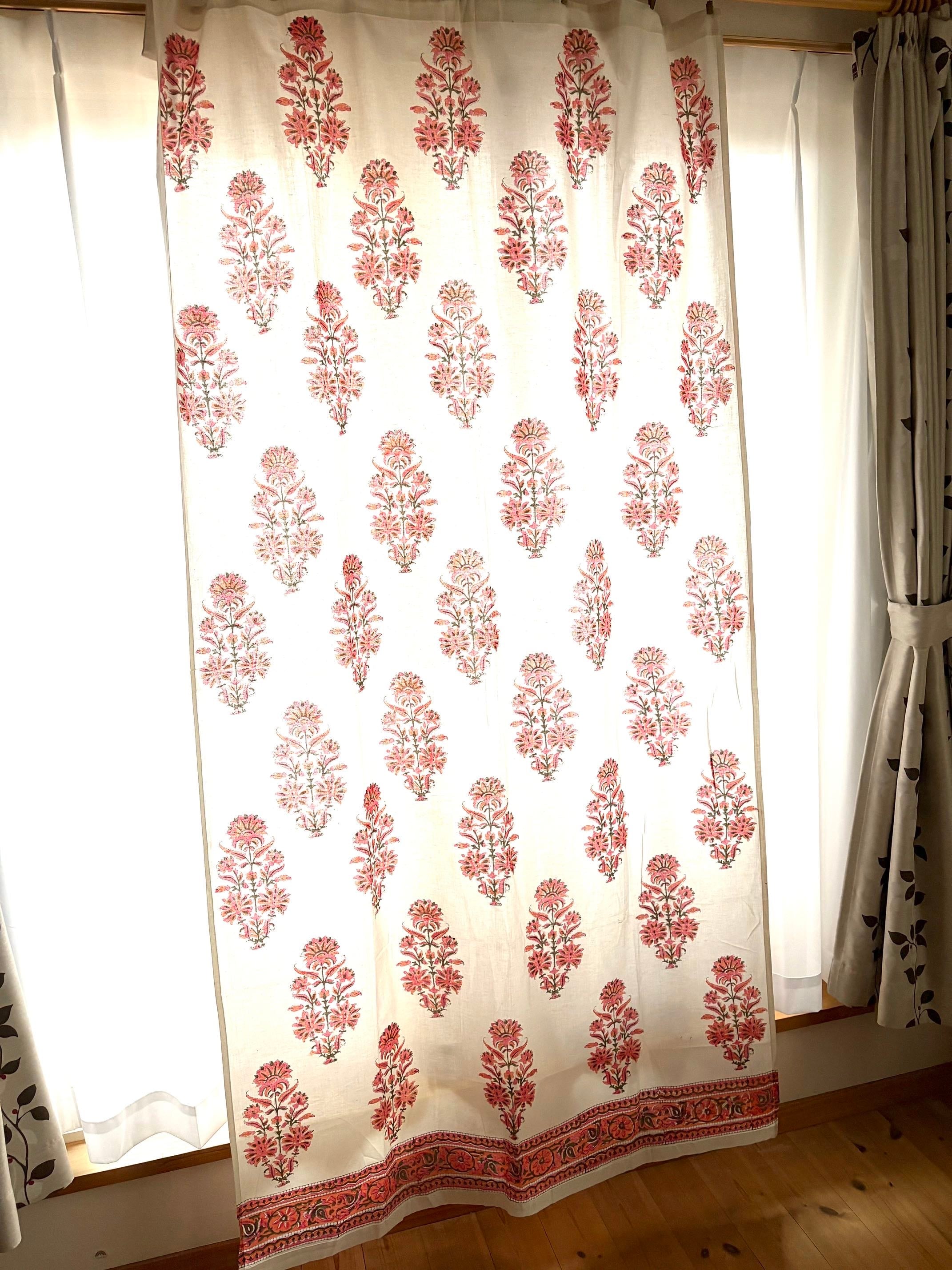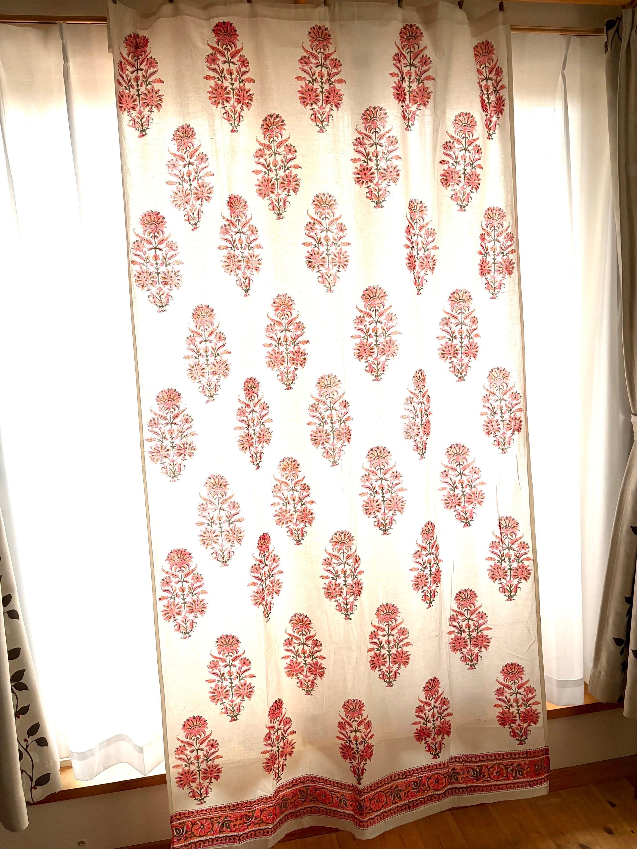 インドの職人さんによる伝統的な「ブロックプリント(木版染め)」で、ひとつひとつ丁寧に手刷りされた布を使ったカーテンです。