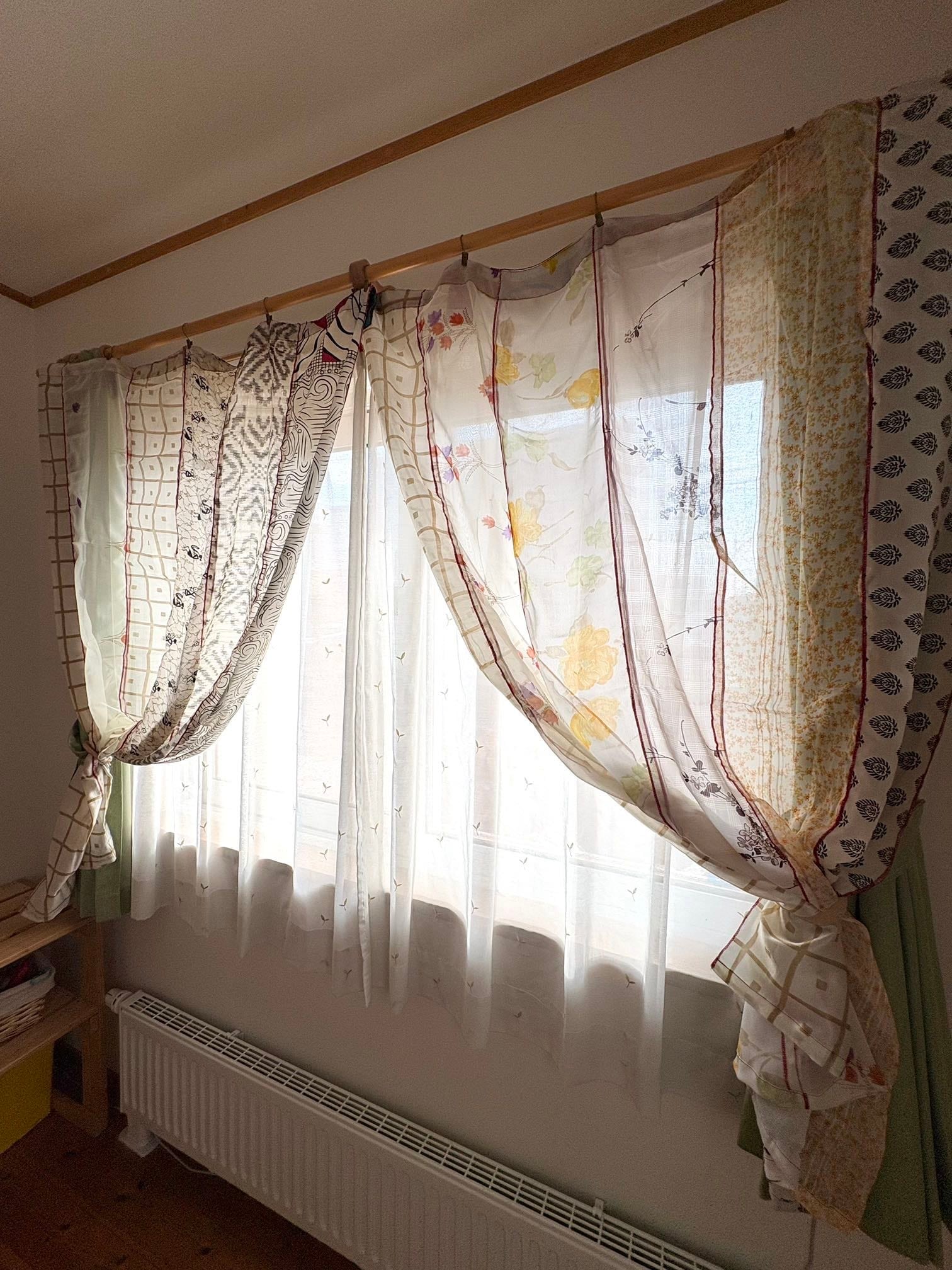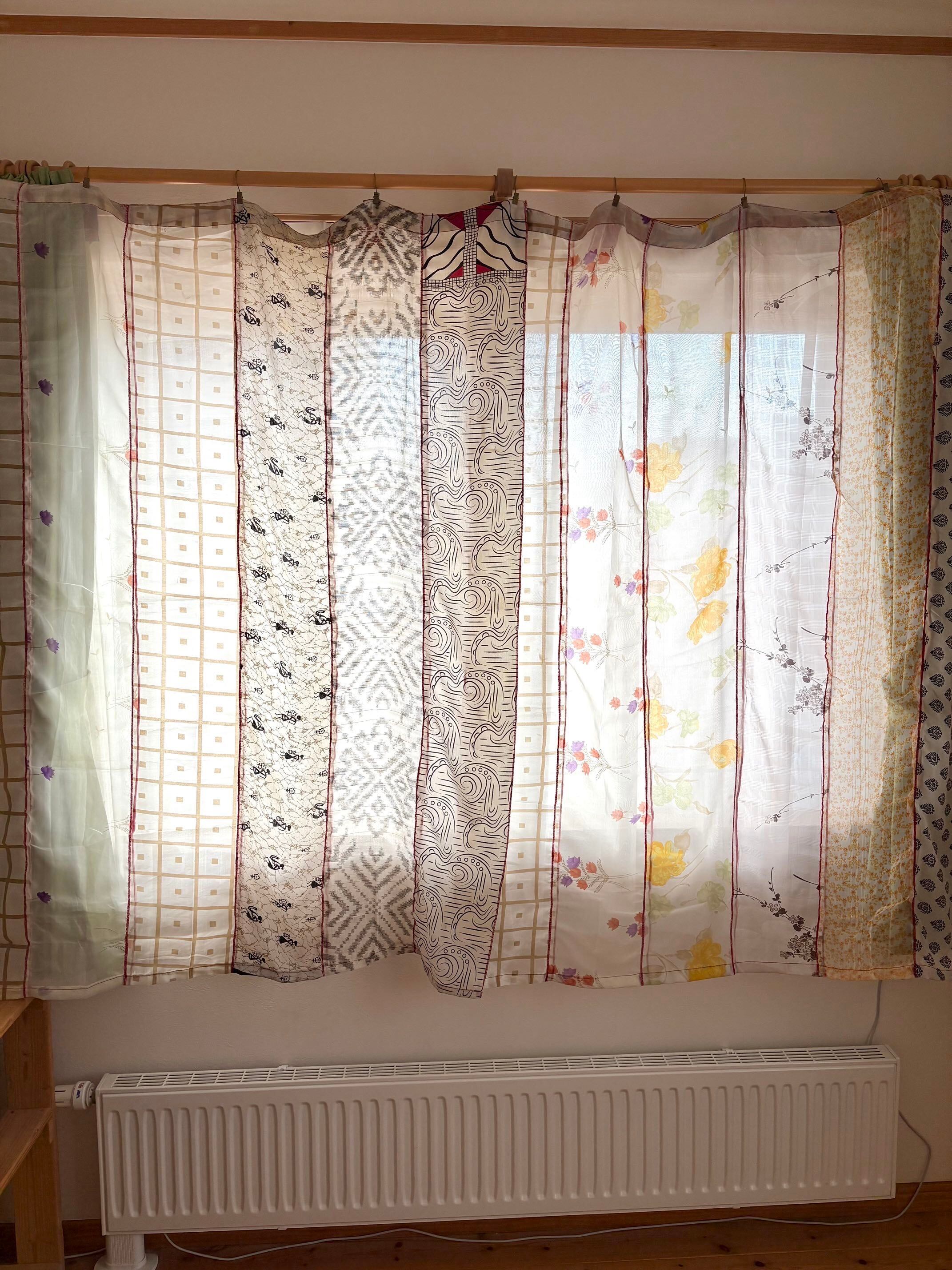 1枚1枚丁寧に繋ぎ合わせ、大変カラフルできれいなパッチワークカーテンにアップサイクルされました!!