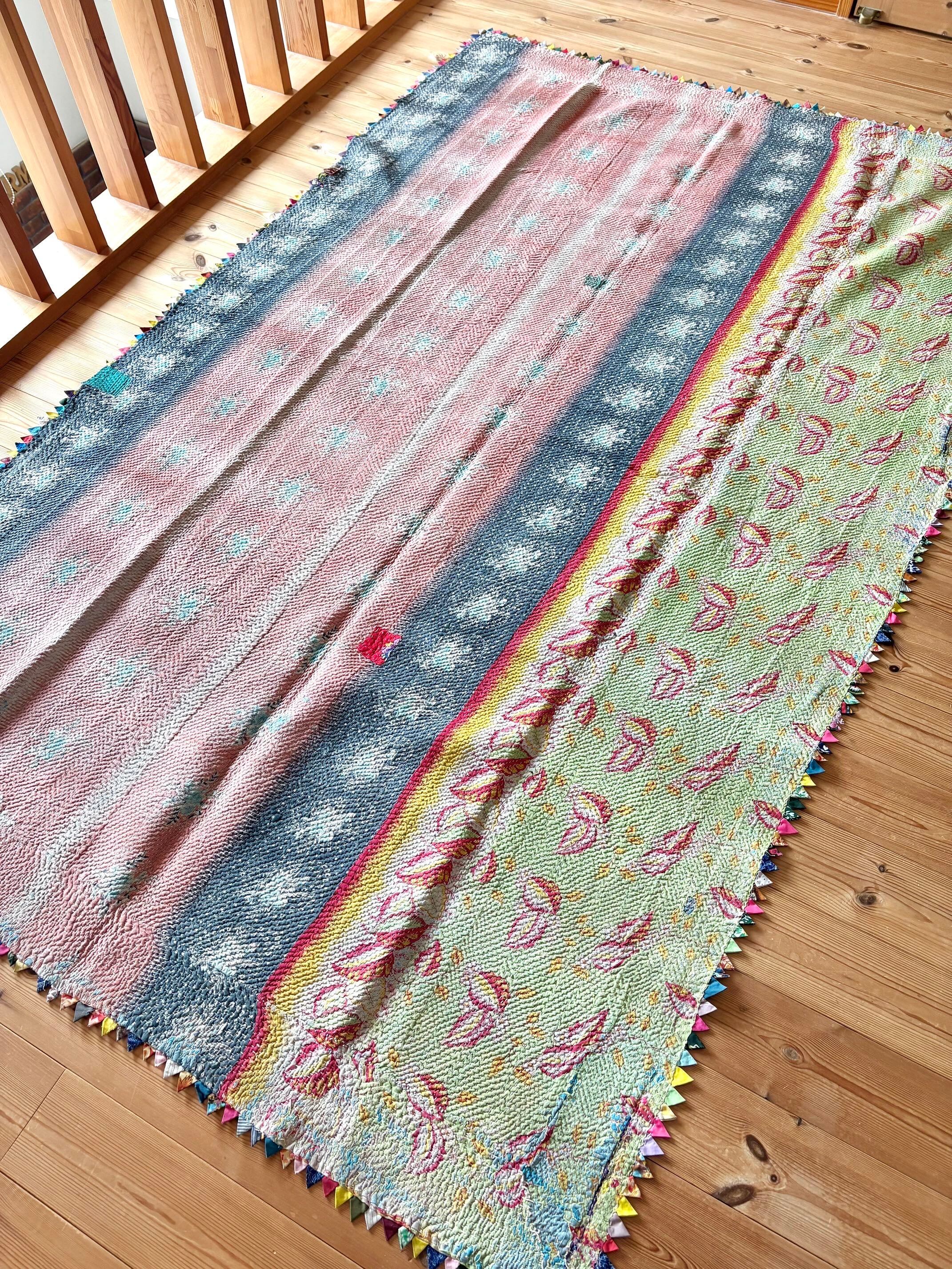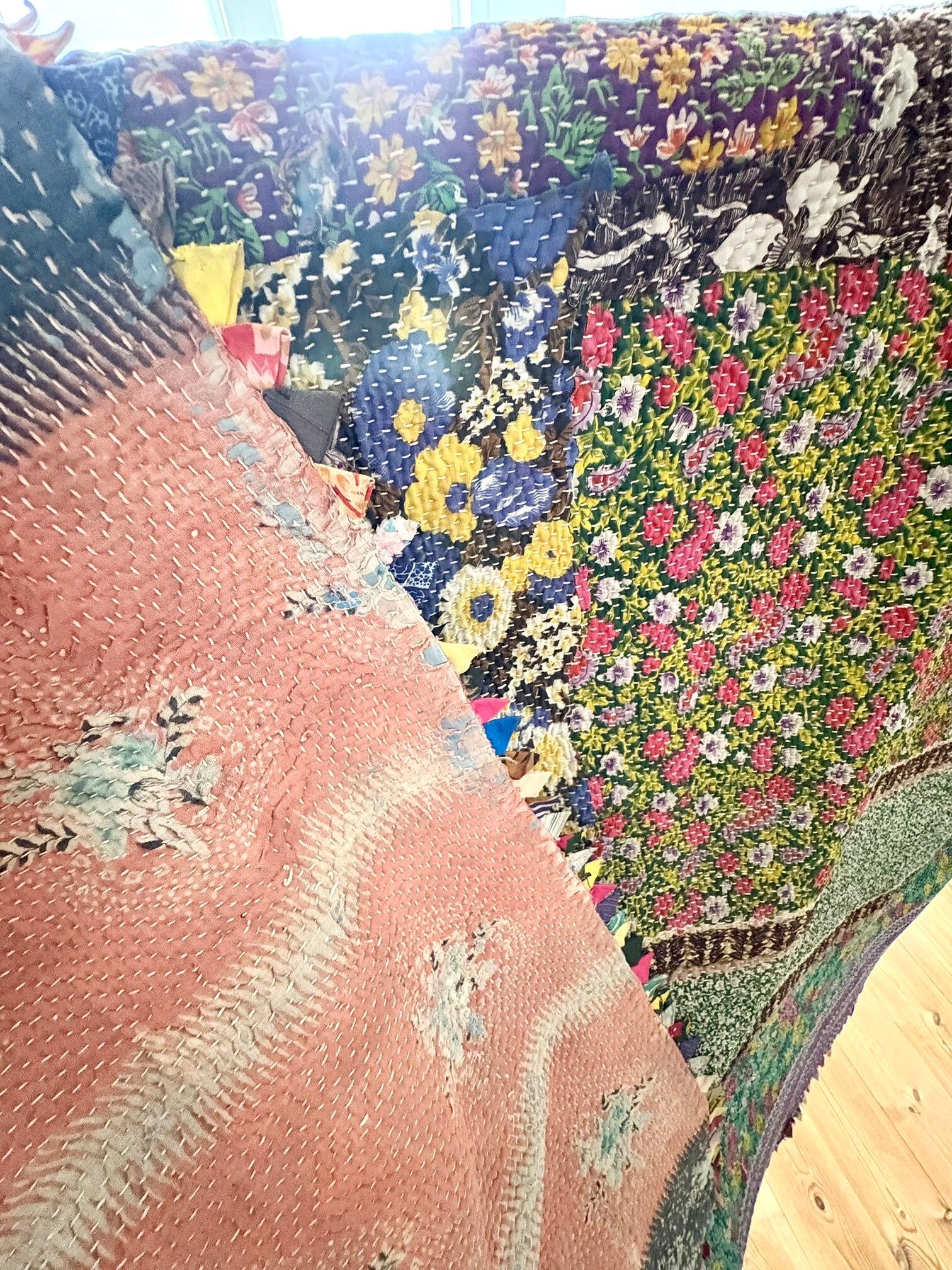 インドの女性たちが、古くなったサリー(布)を丁寧に重ね、ひと針ひと針刺し子を施して仕立てた「カンタキルト」。
