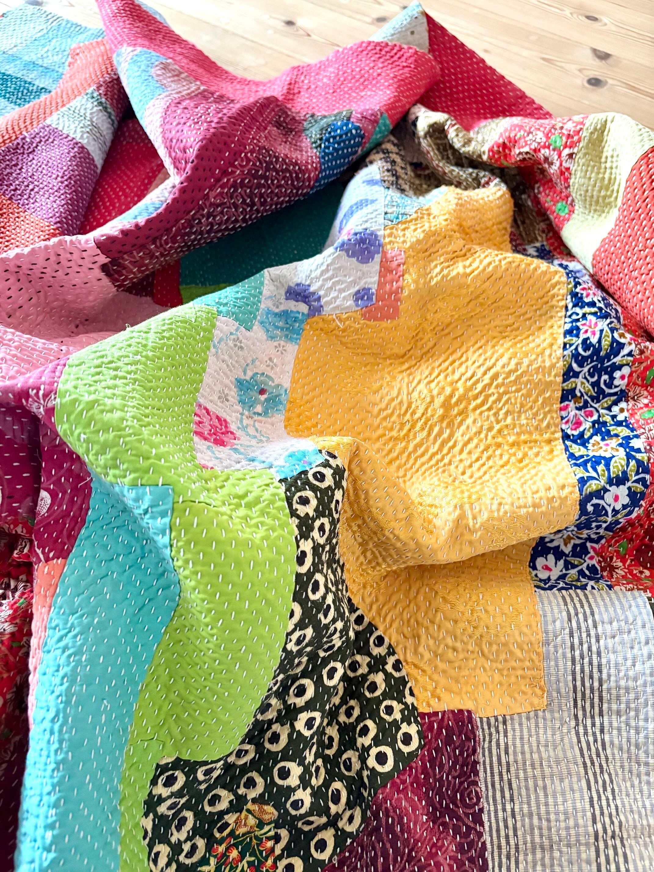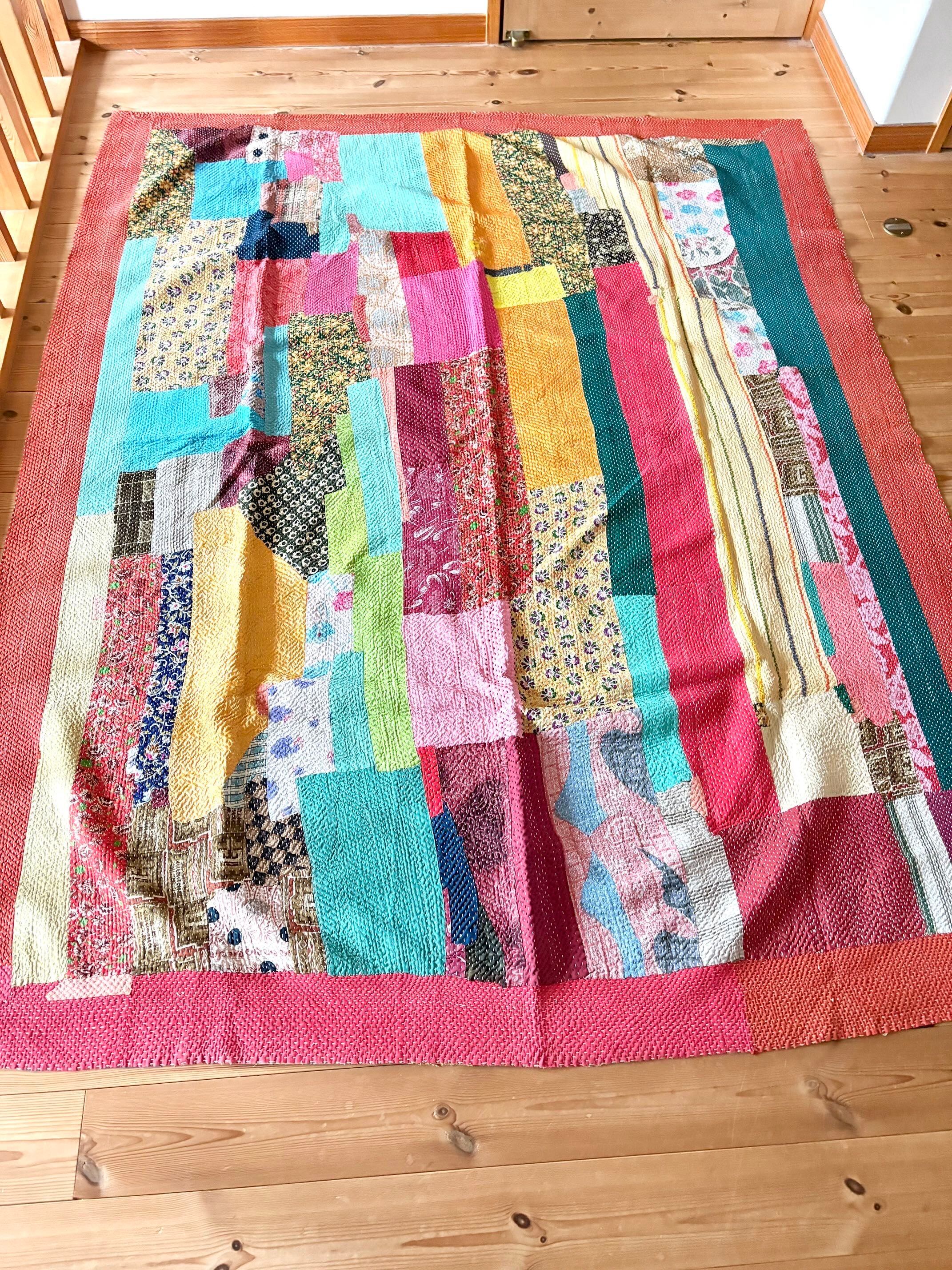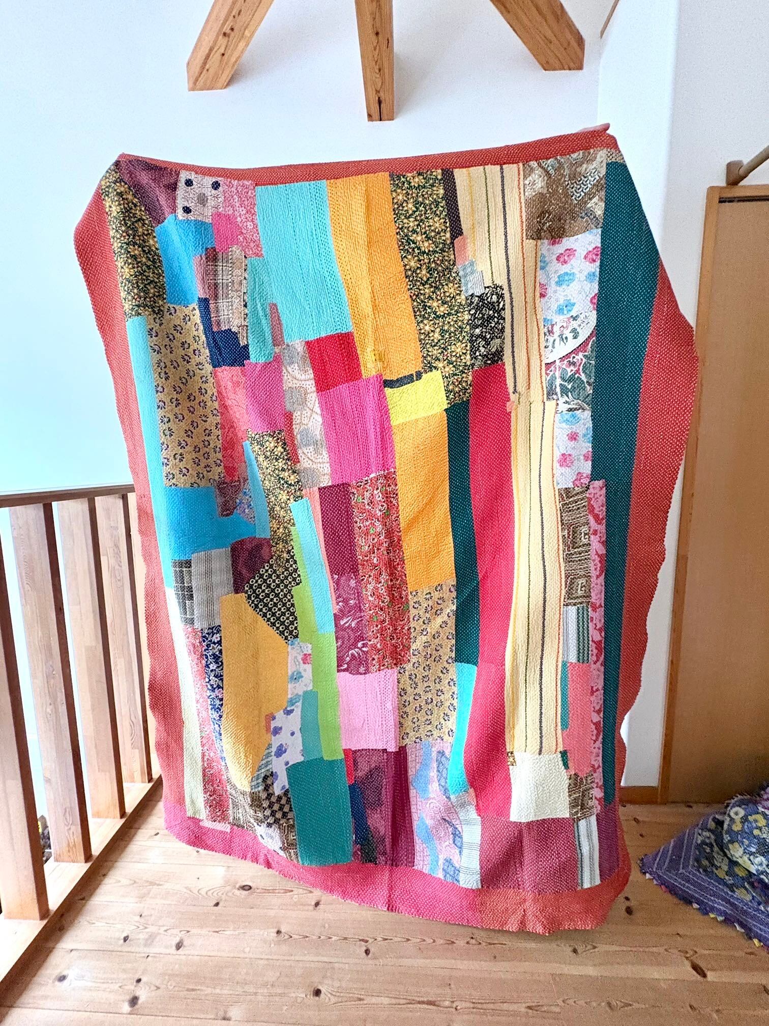 インドの女性たちが、古くなったサリー(布)を丁寧に重ね、ひと針ひと針刺し子を施して仕立てた「カンタキルト」。