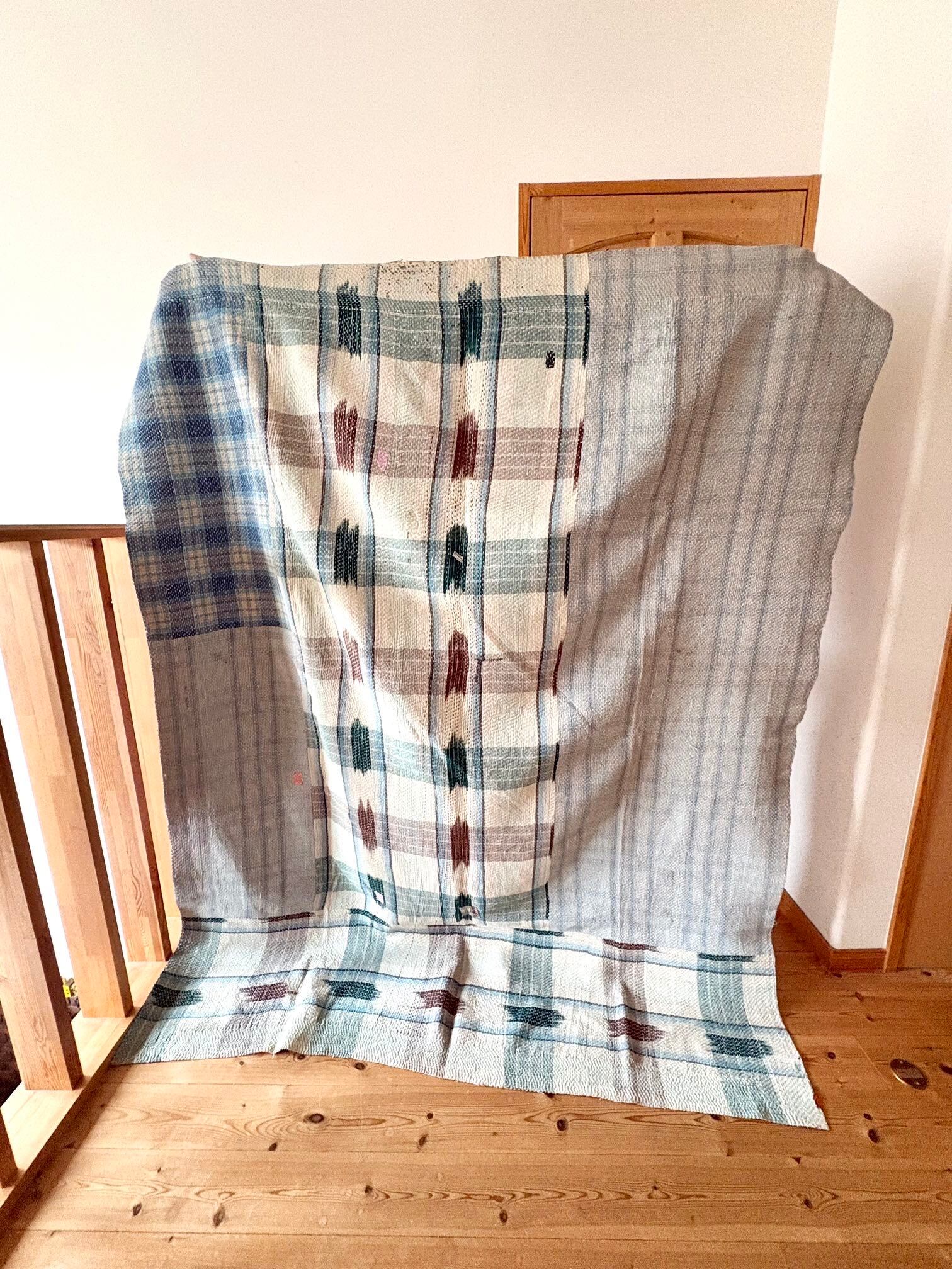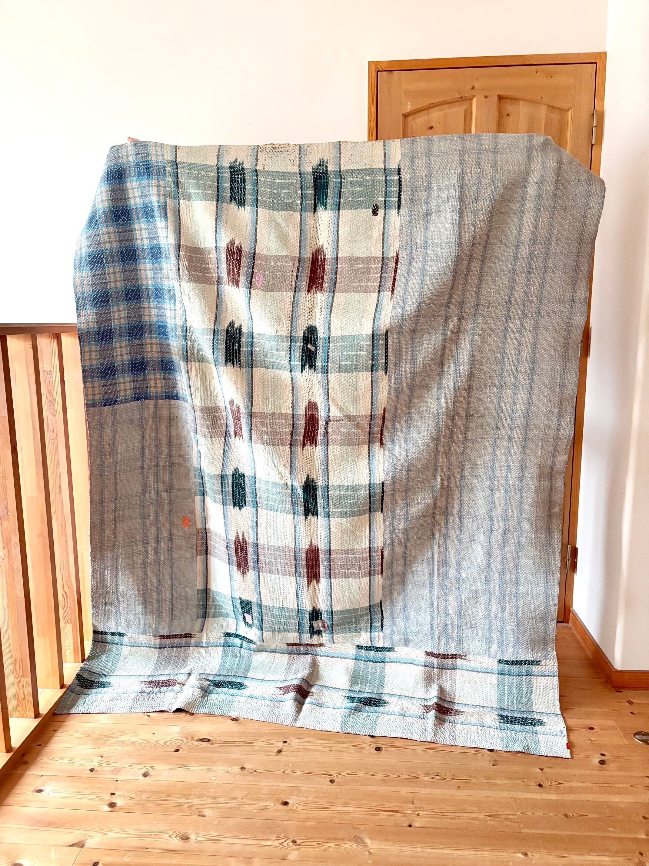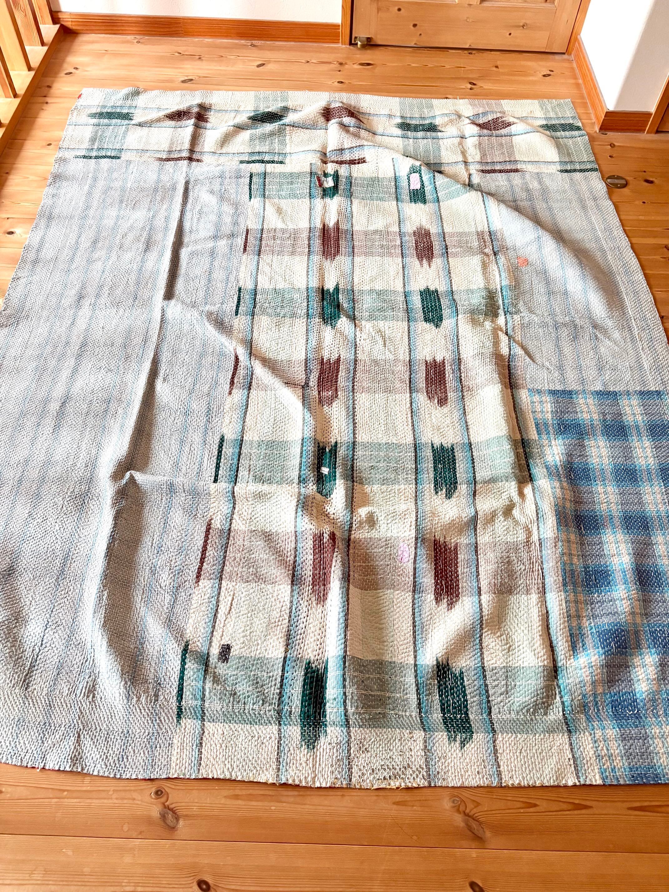 インドの女性たちが、古くなったサリー(布)を丁寧に重ね、ひと針ひと針刺し子を施して仕立てた「カンタキルト」。
