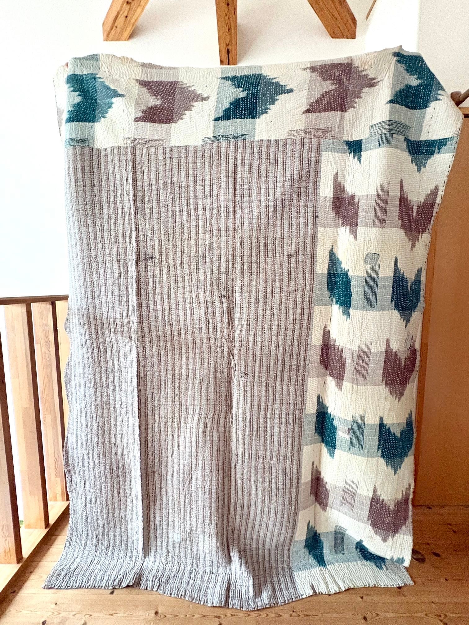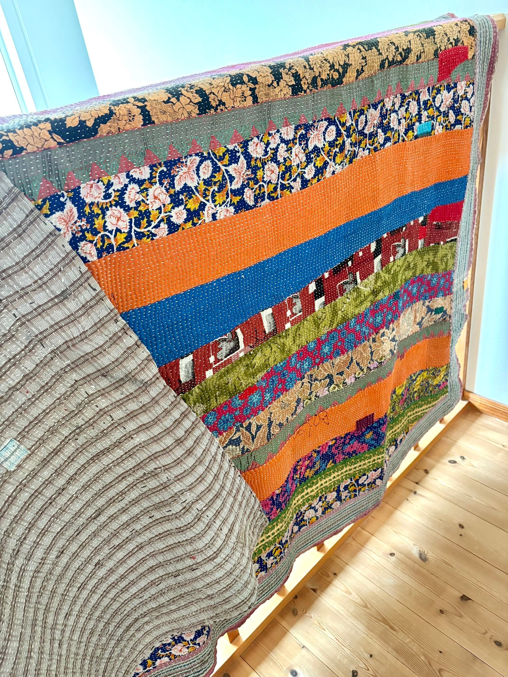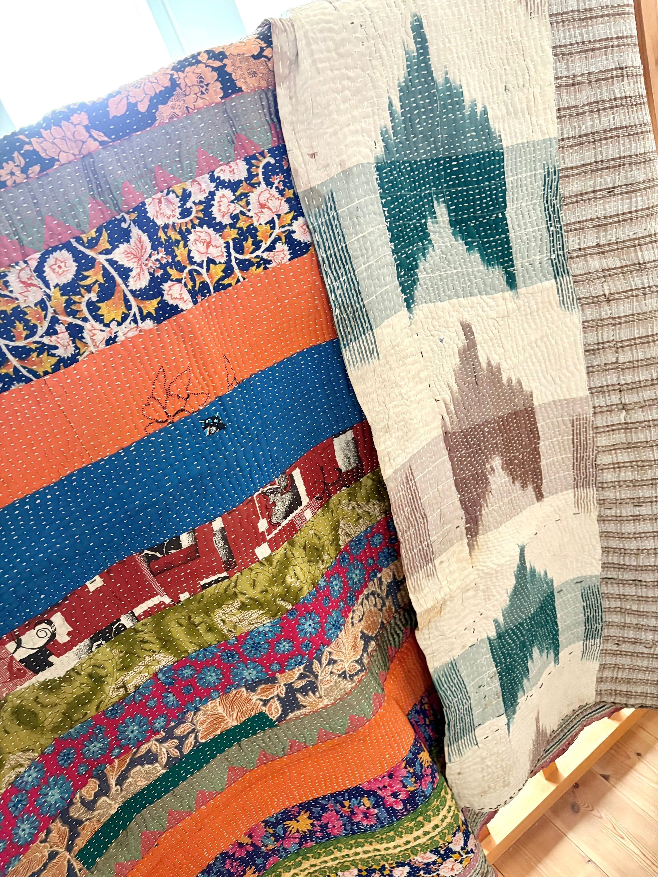 インドの女性たちが、古くなったサリー(布)を丁寧に重ね、ひと針ひと針刺し子を施して仕立てた「カンタキルト」。