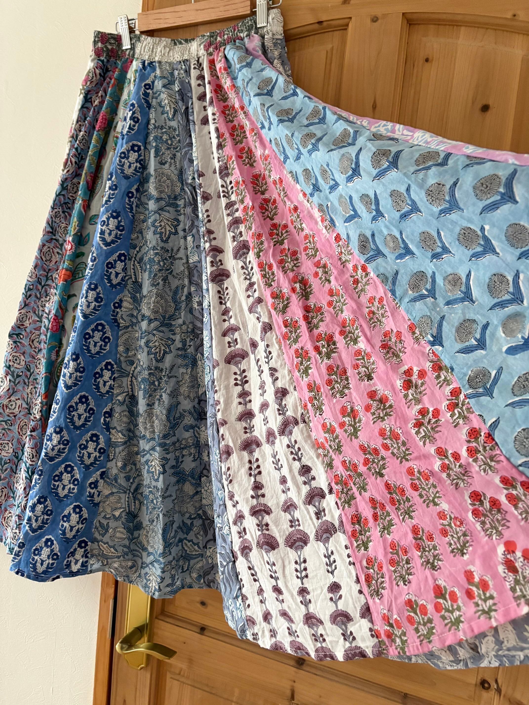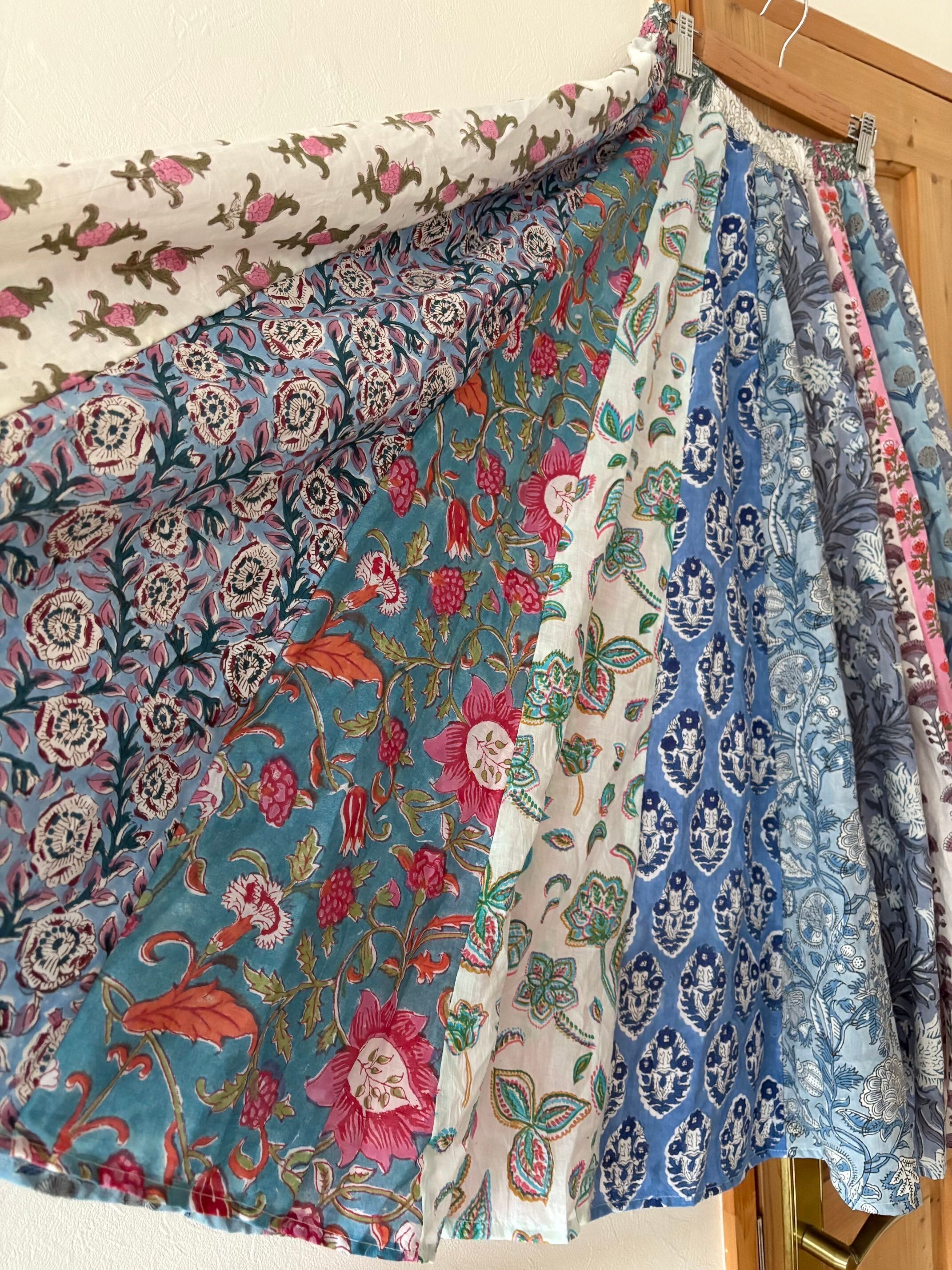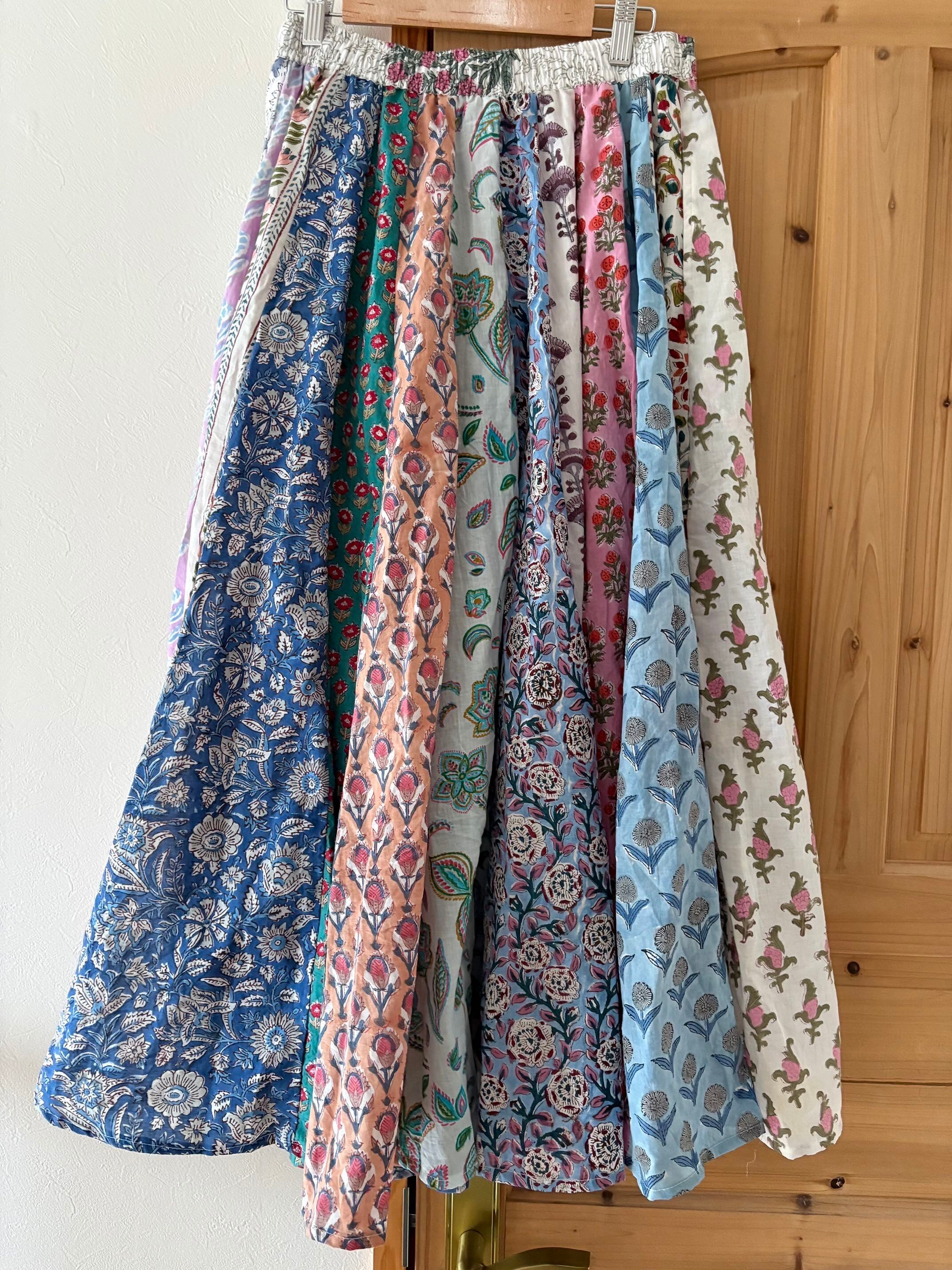 インドの職人さんによる伝統的な「ブロックプリント(木版染め)」で、ひとつひとつ丁寧に手刷りされた布を使った世界でたった一つのパッチワークスカートです。