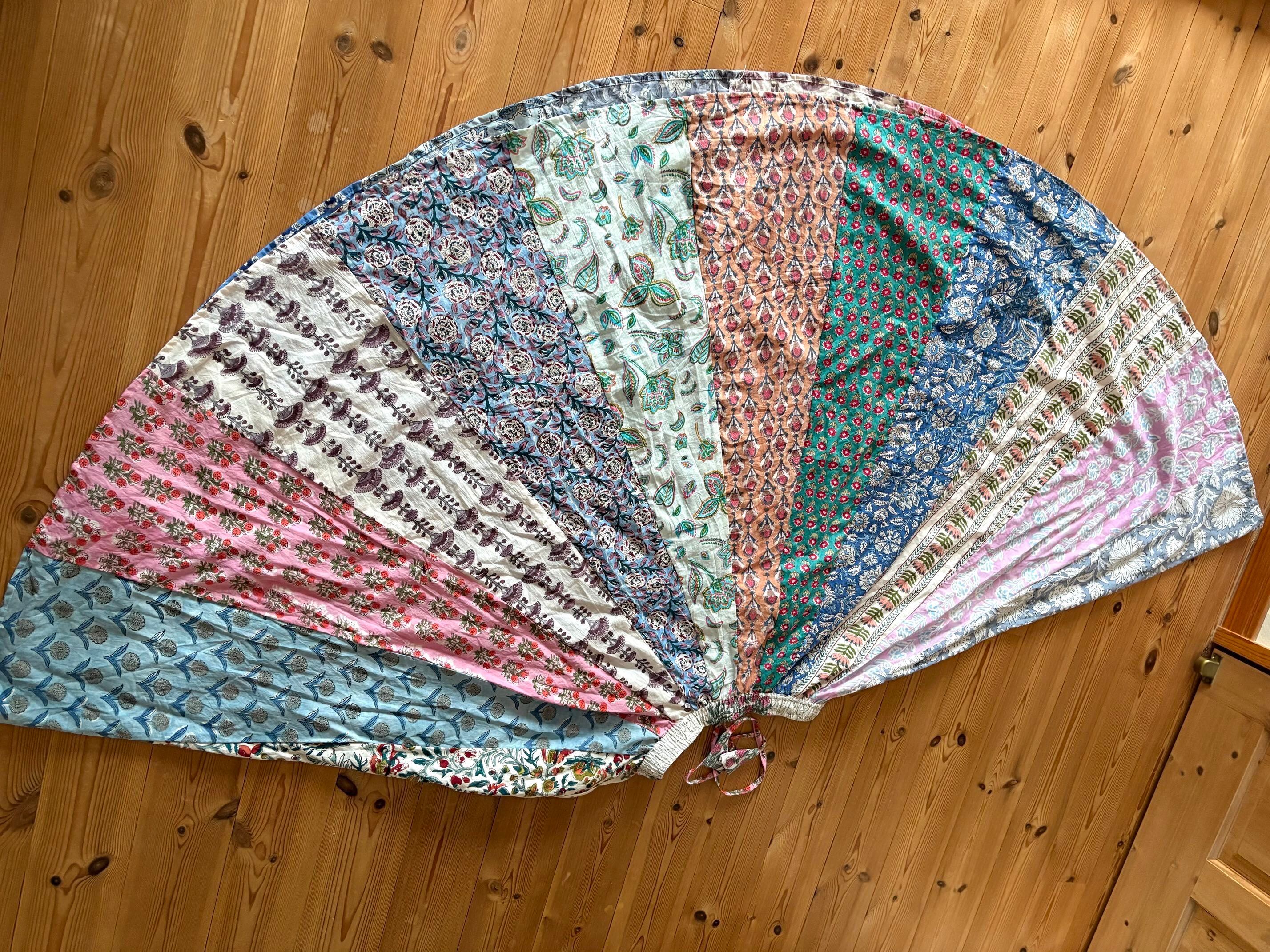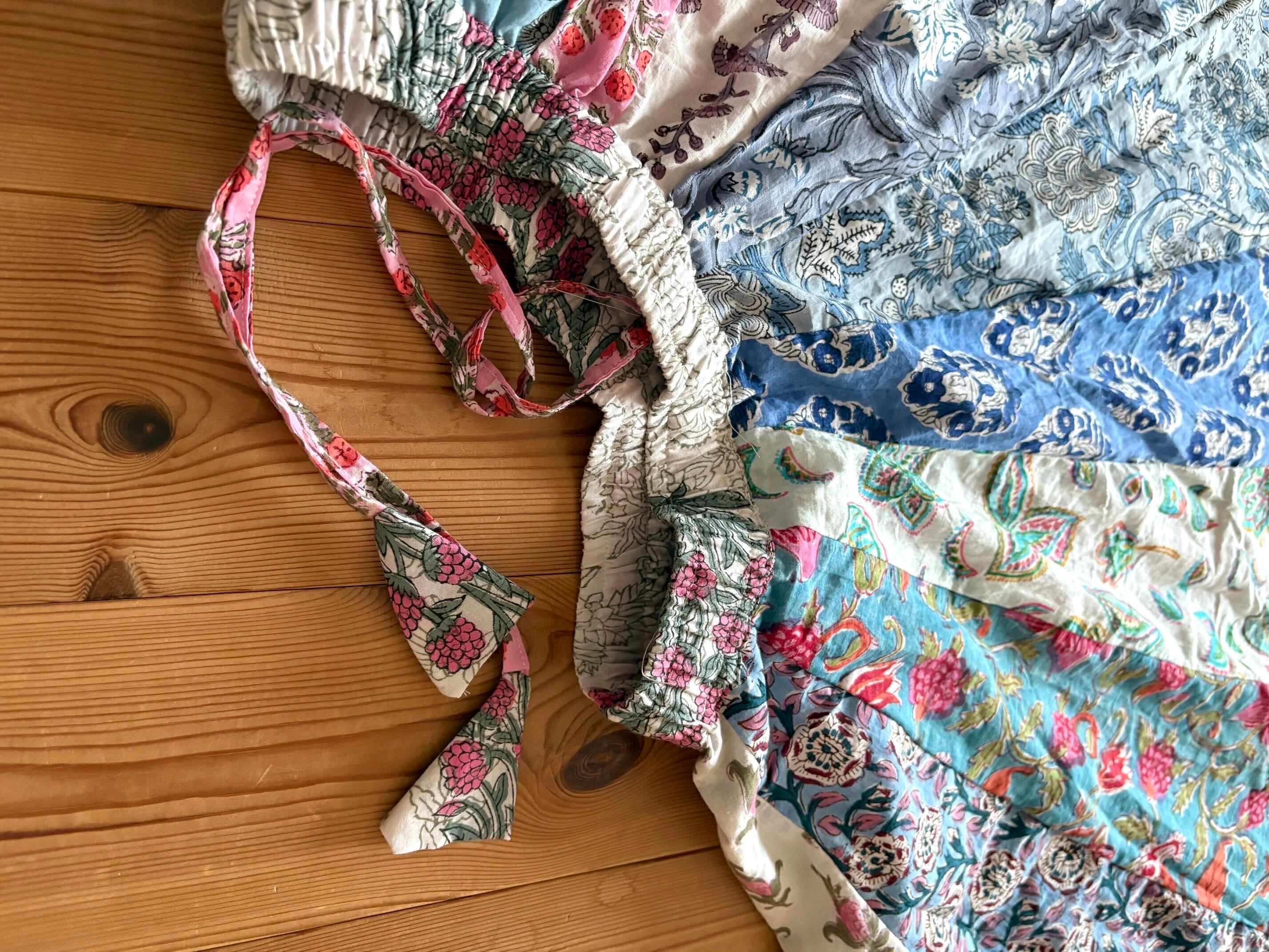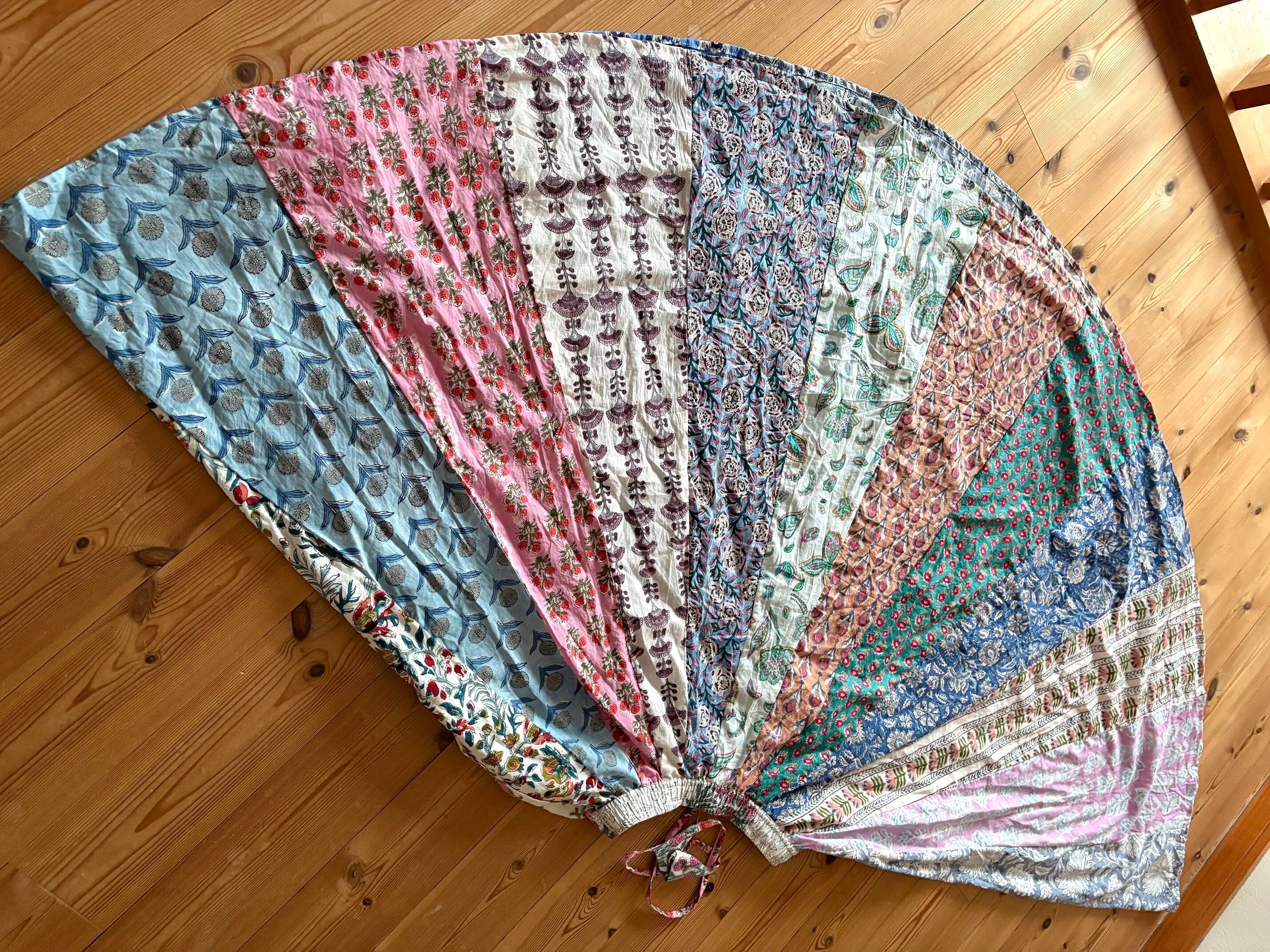 インドの職人さんによる伝統的な「ブロックプリント(木版染め)」で、ひとつひとつ丁寧に手刷りされた布を使った世界でたった一つのパッチワークスカートです。