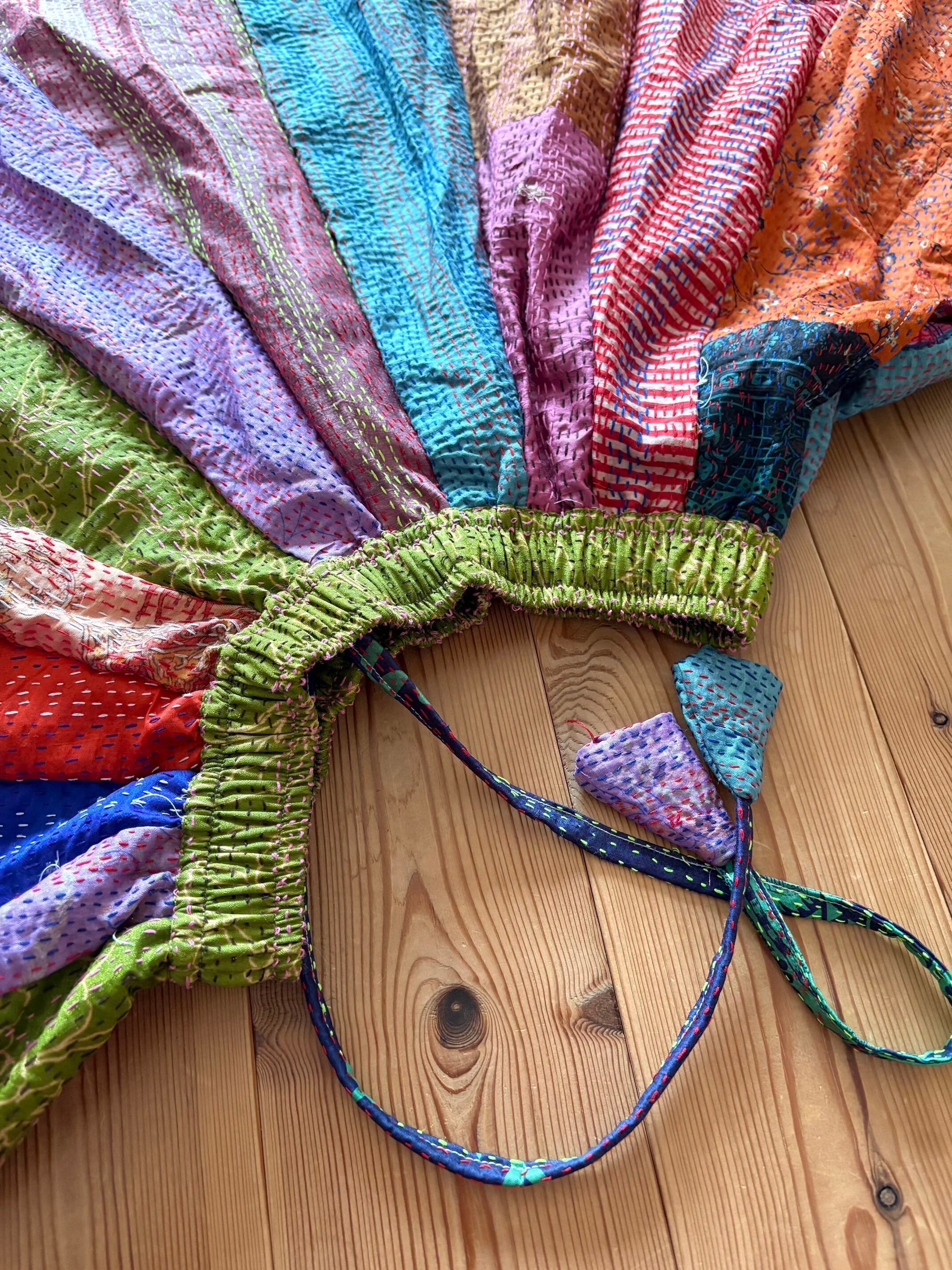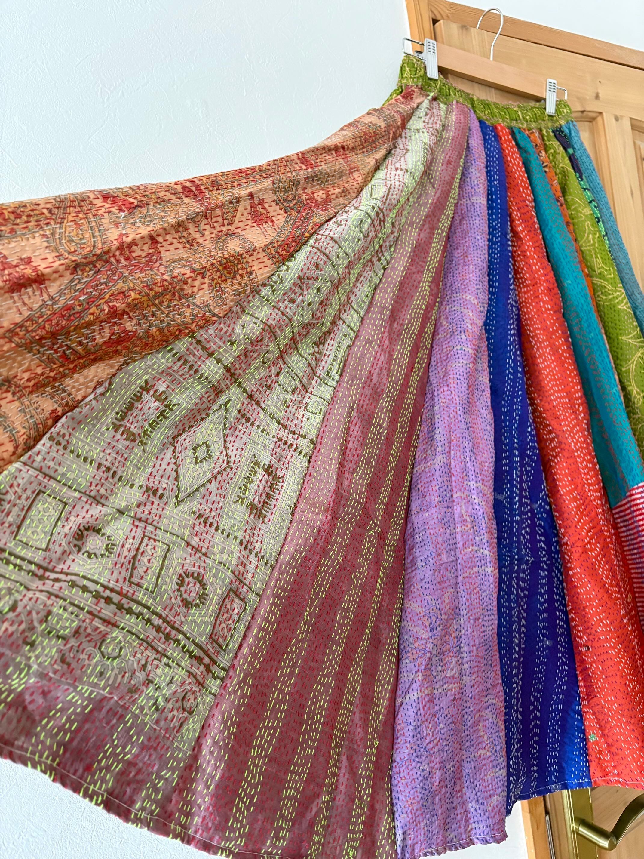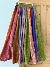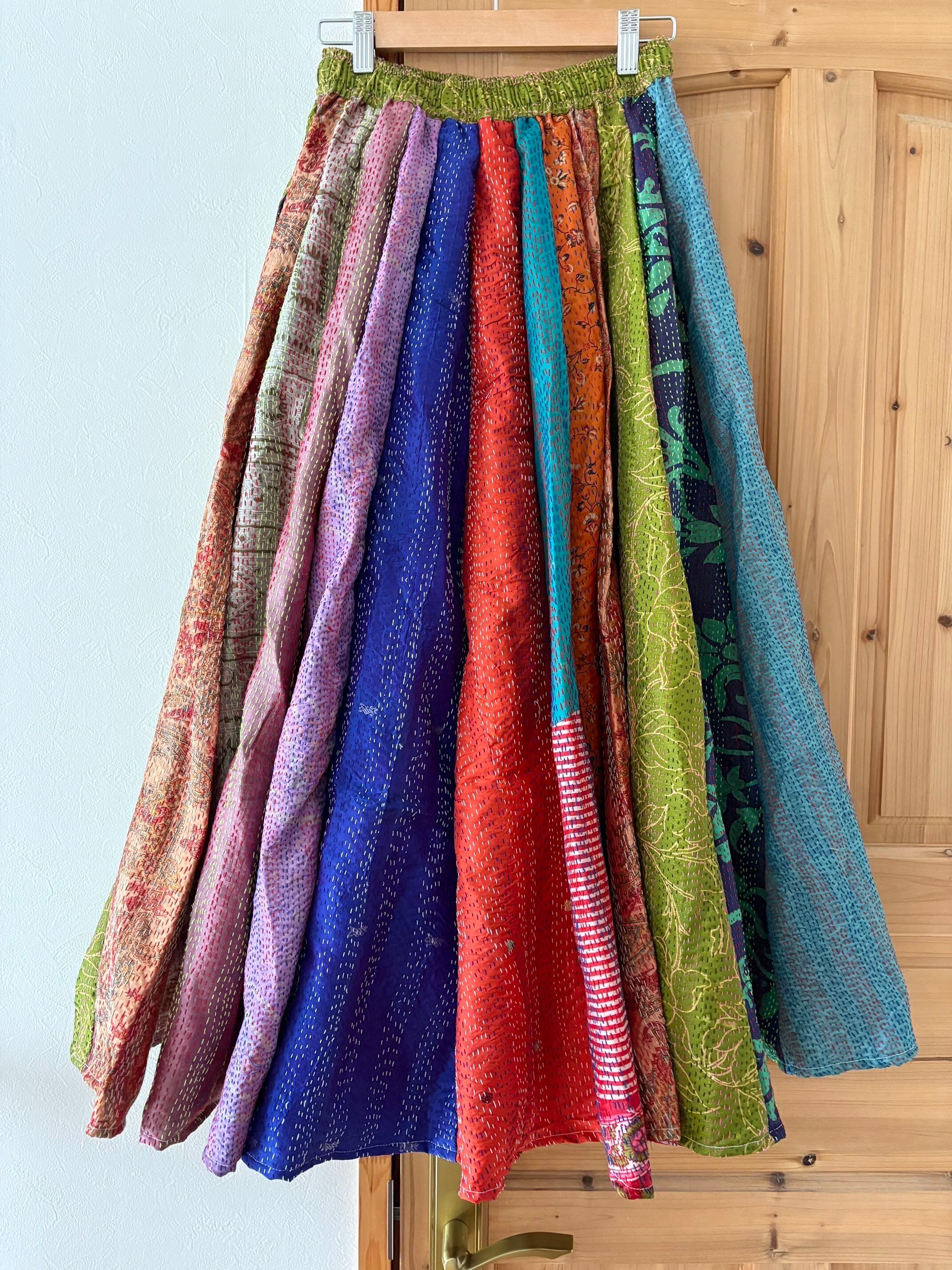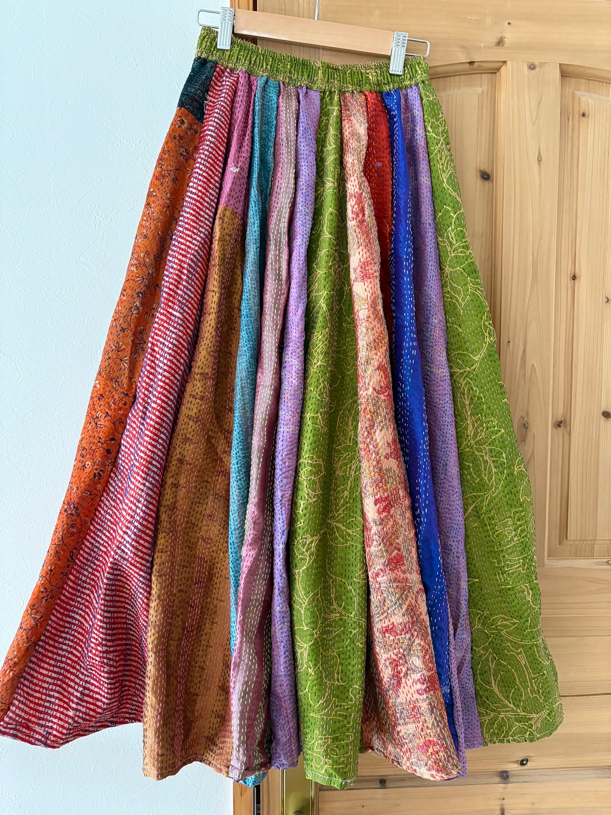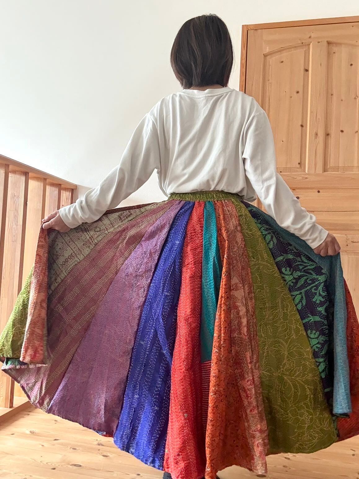 村の女性たちが一針一針カンタ刺繍をしたシルク生地をパッチワークで繋ぎ合わせた唯一無二のスカートです!!