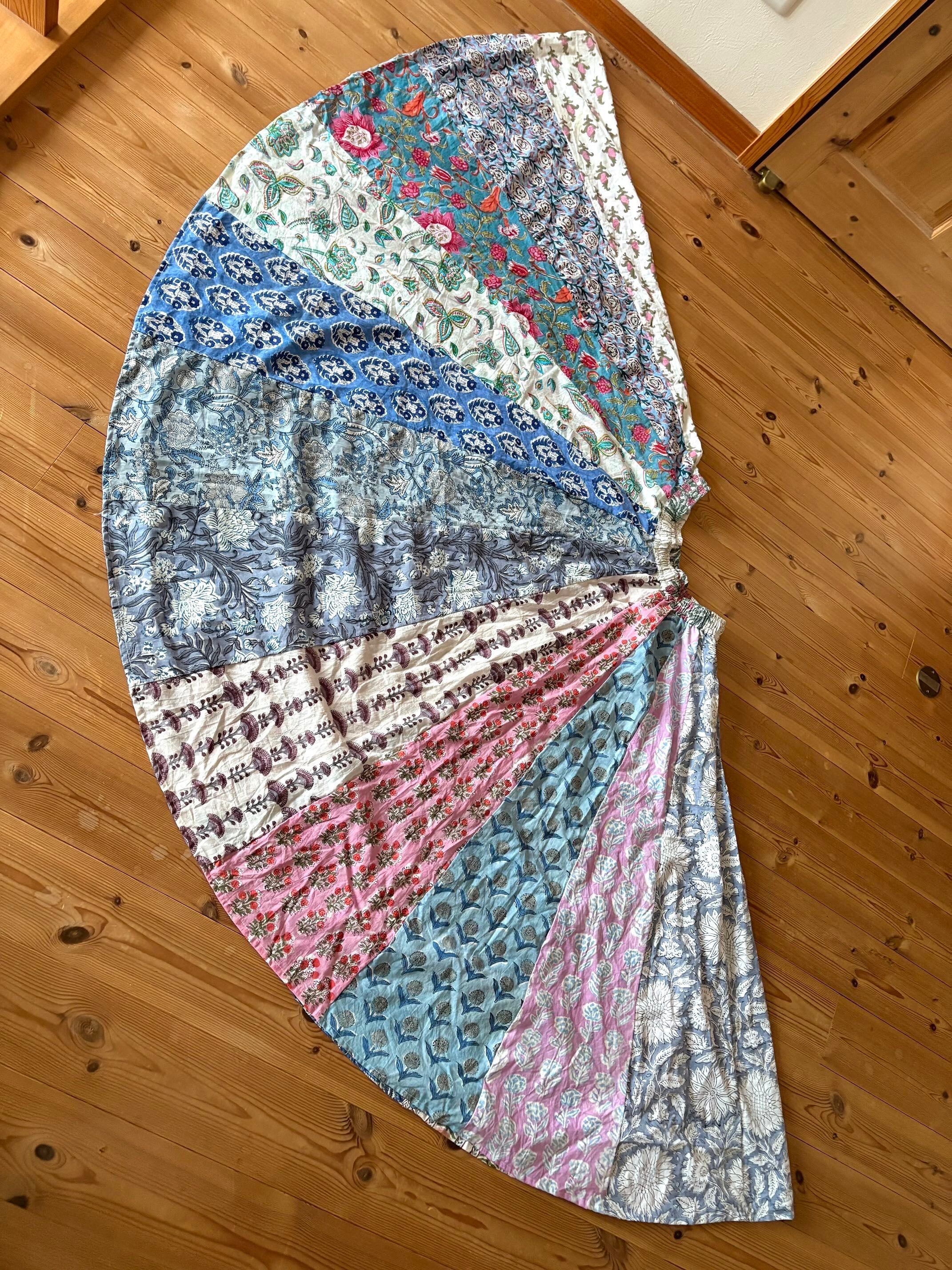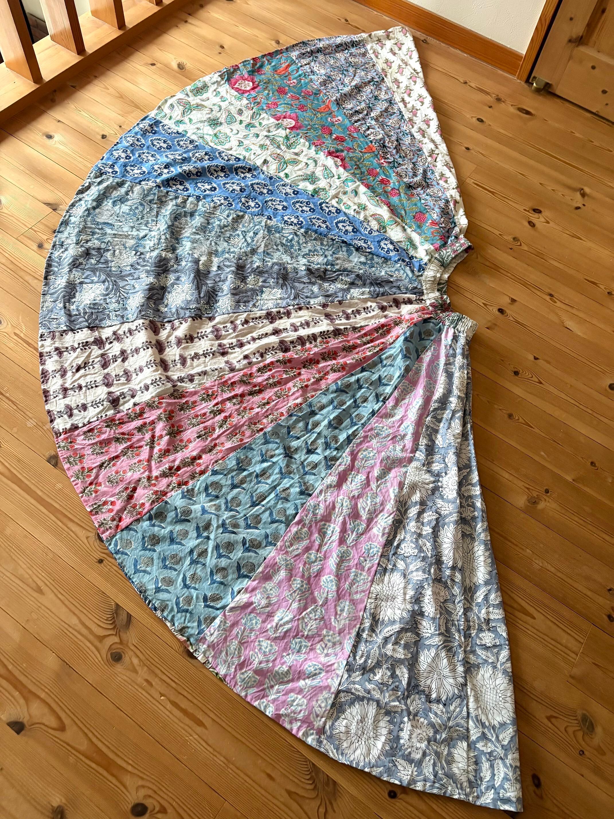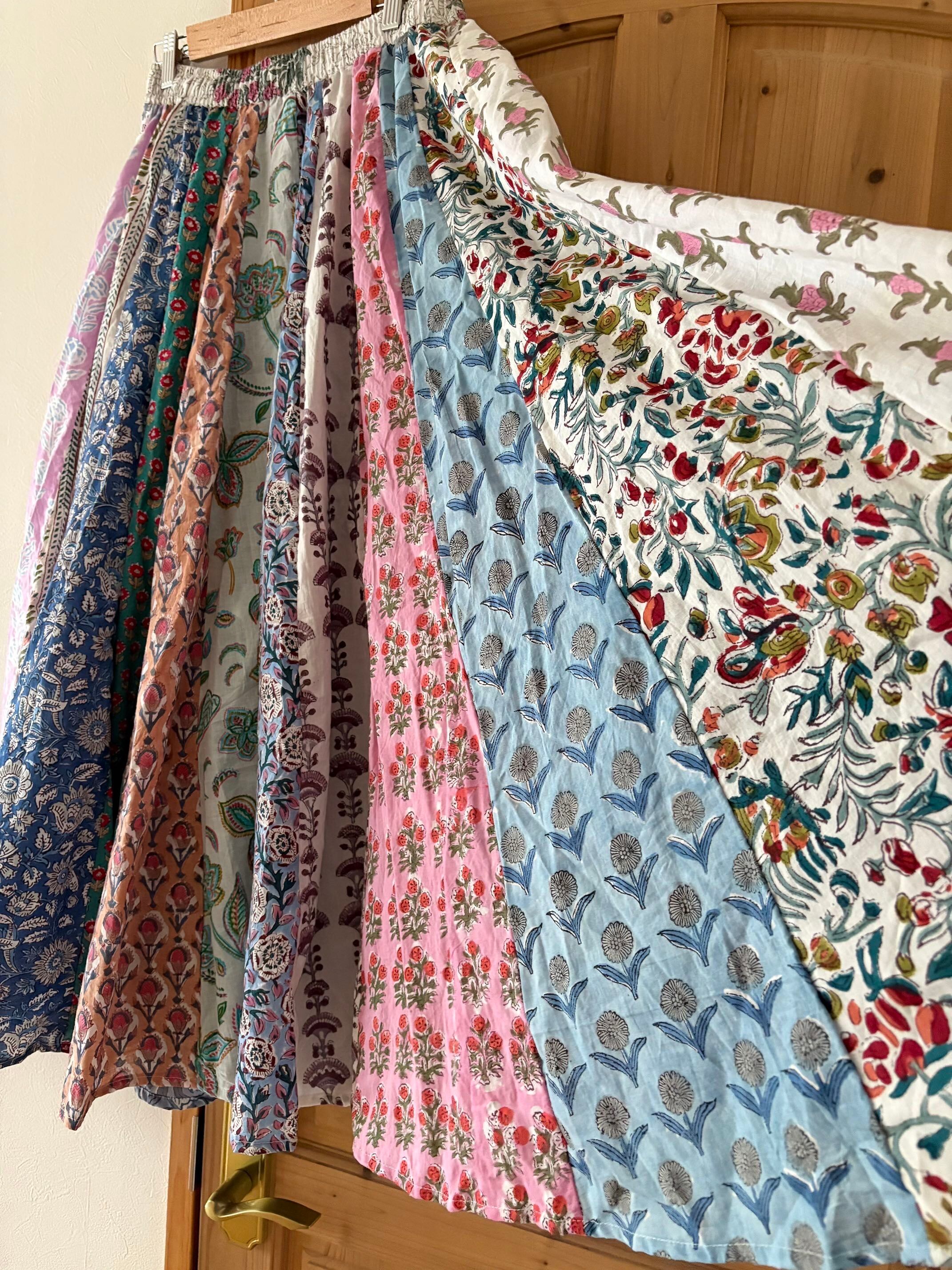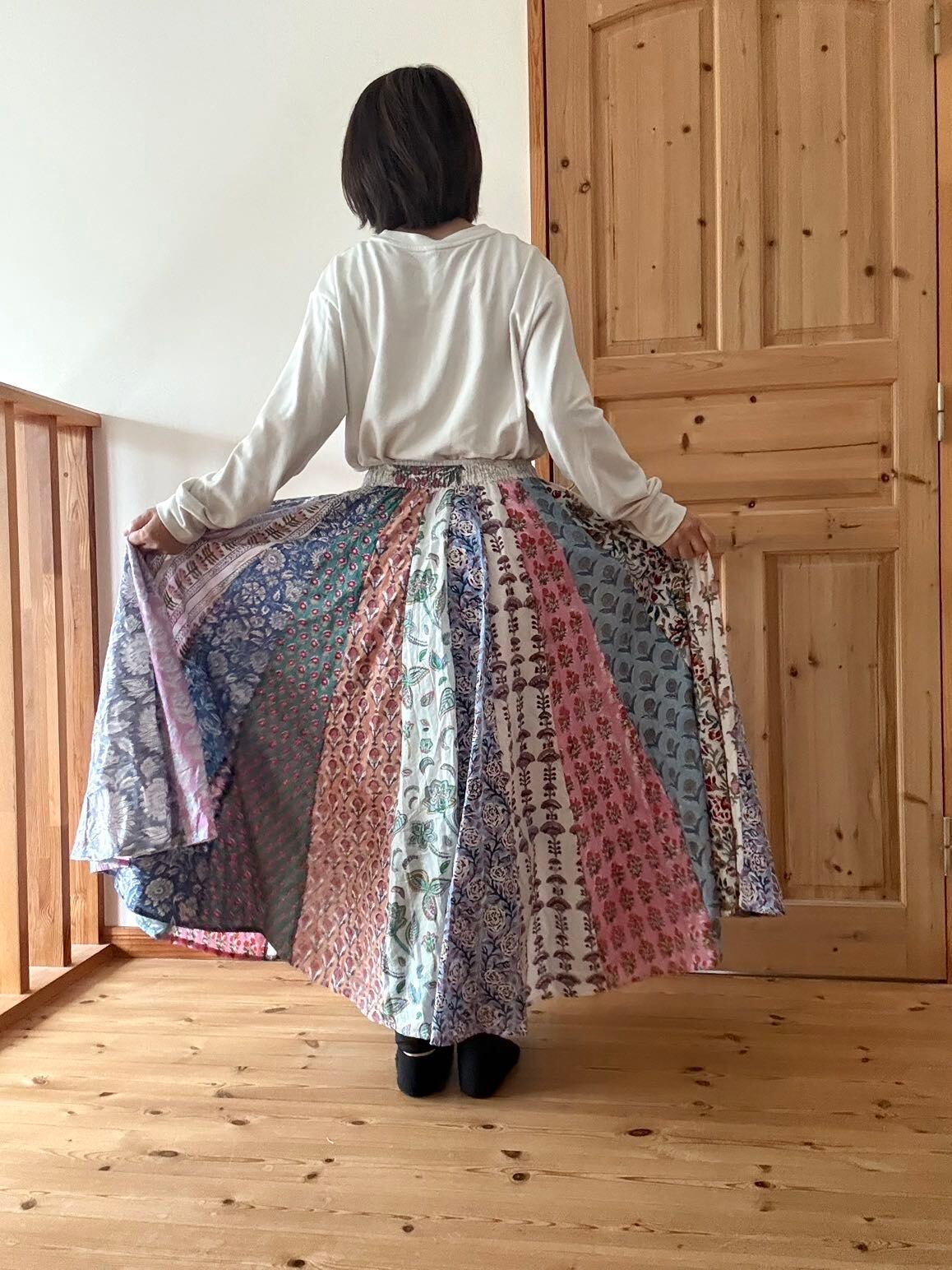 インドの職人さんによる伝統的な「ブロックプリント(木版染め)」で、ひとつひとつ丁寧に手刷りされた布を使った世界でたった一つのパッチワークスカートです。