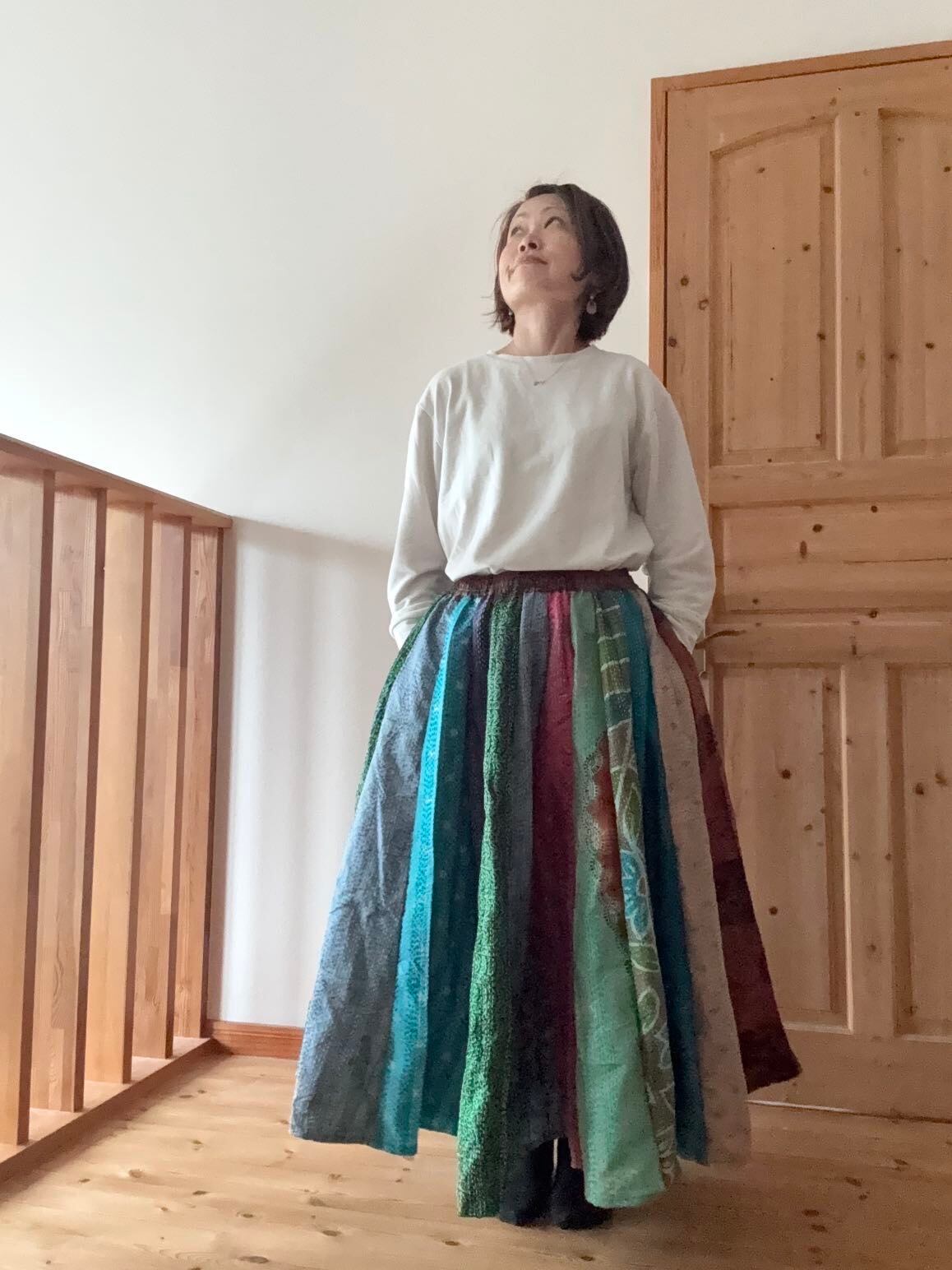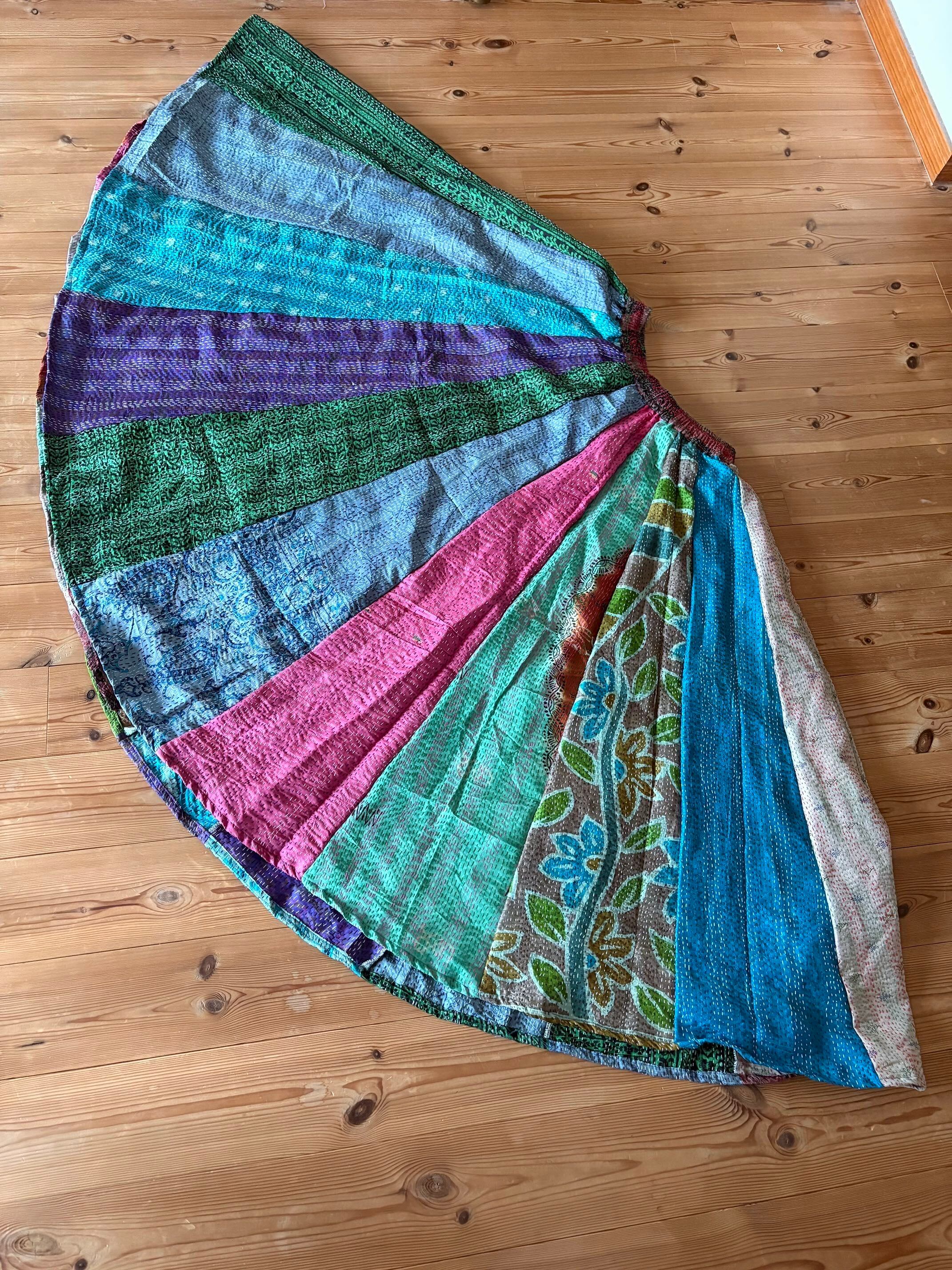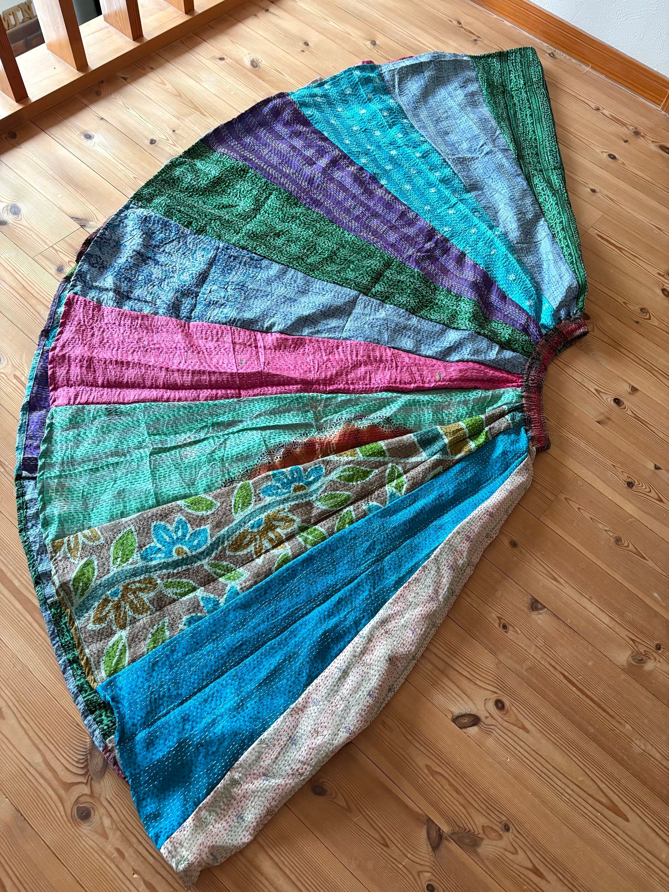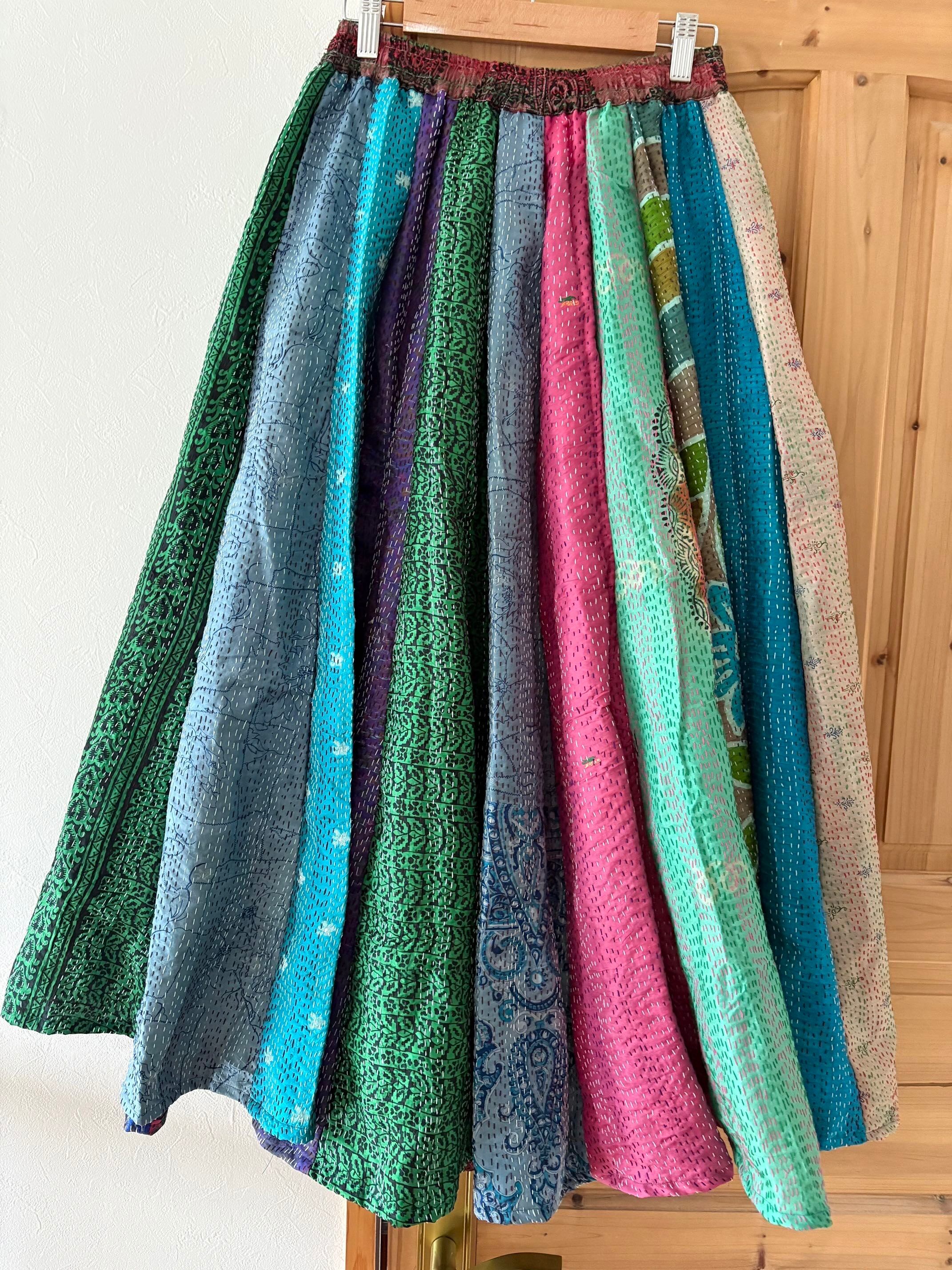 村の女性たちが一針一針カンタ刺繍をしたシルク生地をパッチワークで繋ぎ合わせた唯一無二のスカートです!!