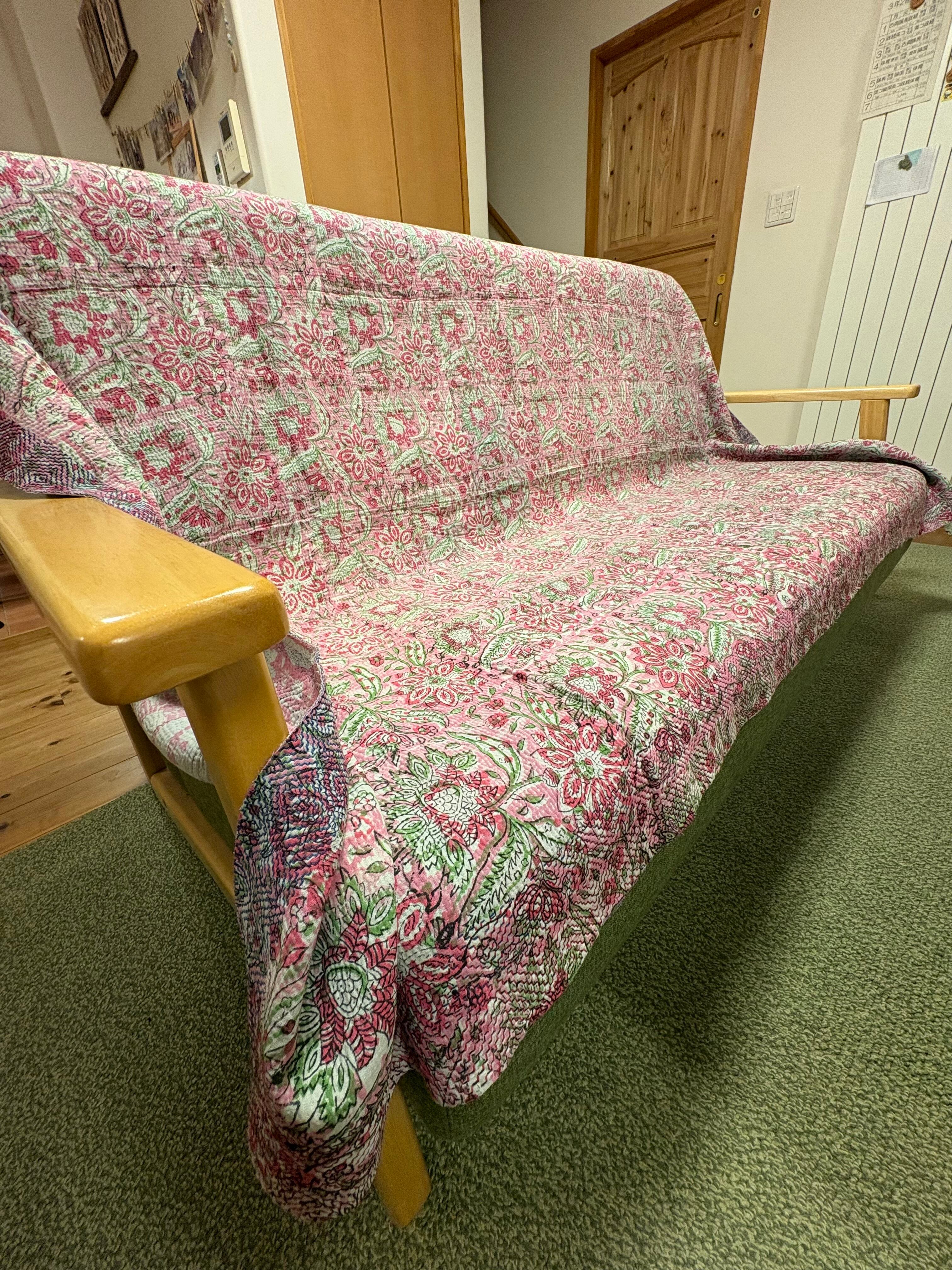 こちらは、インドの伝統的な「カンタ刺繍」と「ブロックプリント」がひとつになった、特別なミックスキルトです。