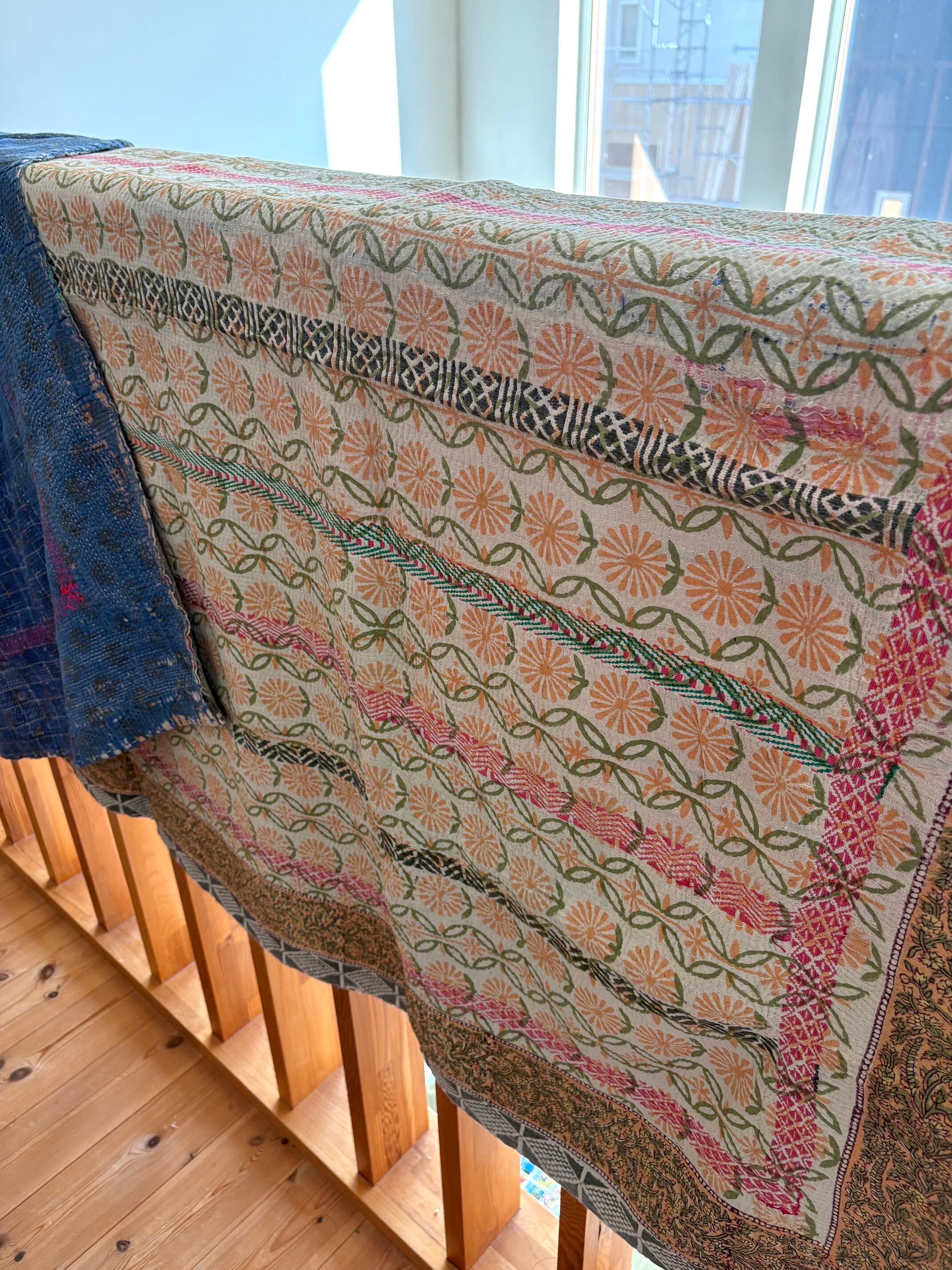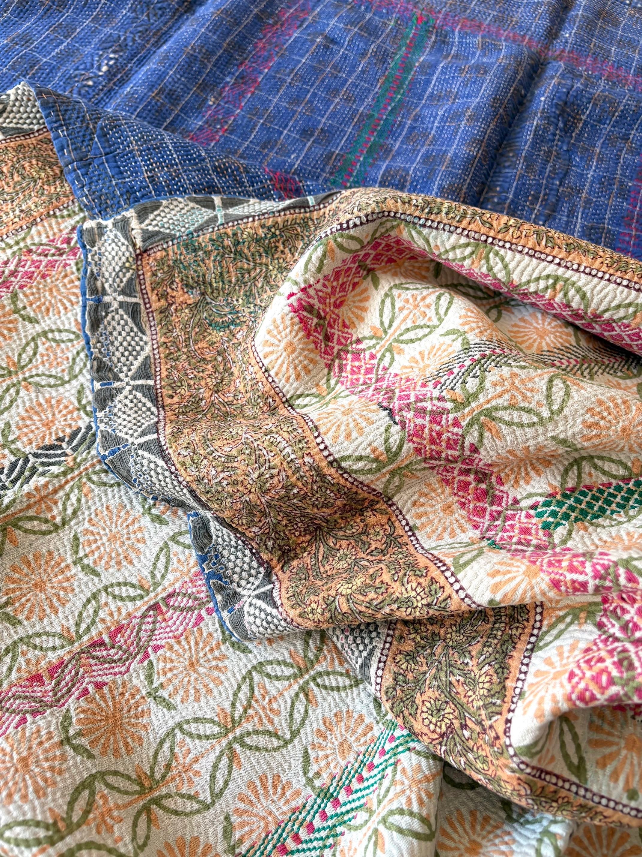 こちらは、インドの伝統的な「カンタ刺繍」と「ブロックプリント」がひとつになった、特別なミックスキルトです。