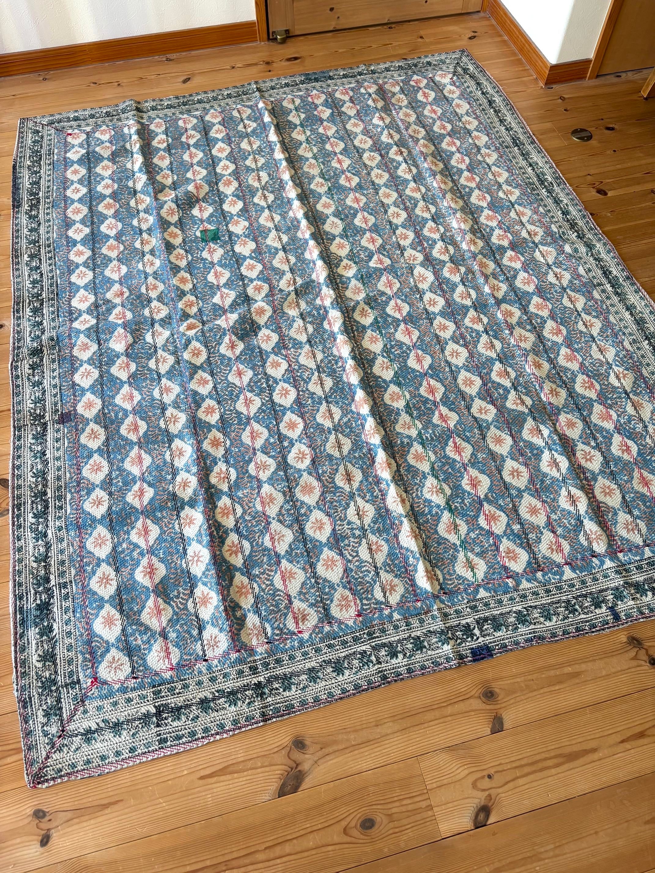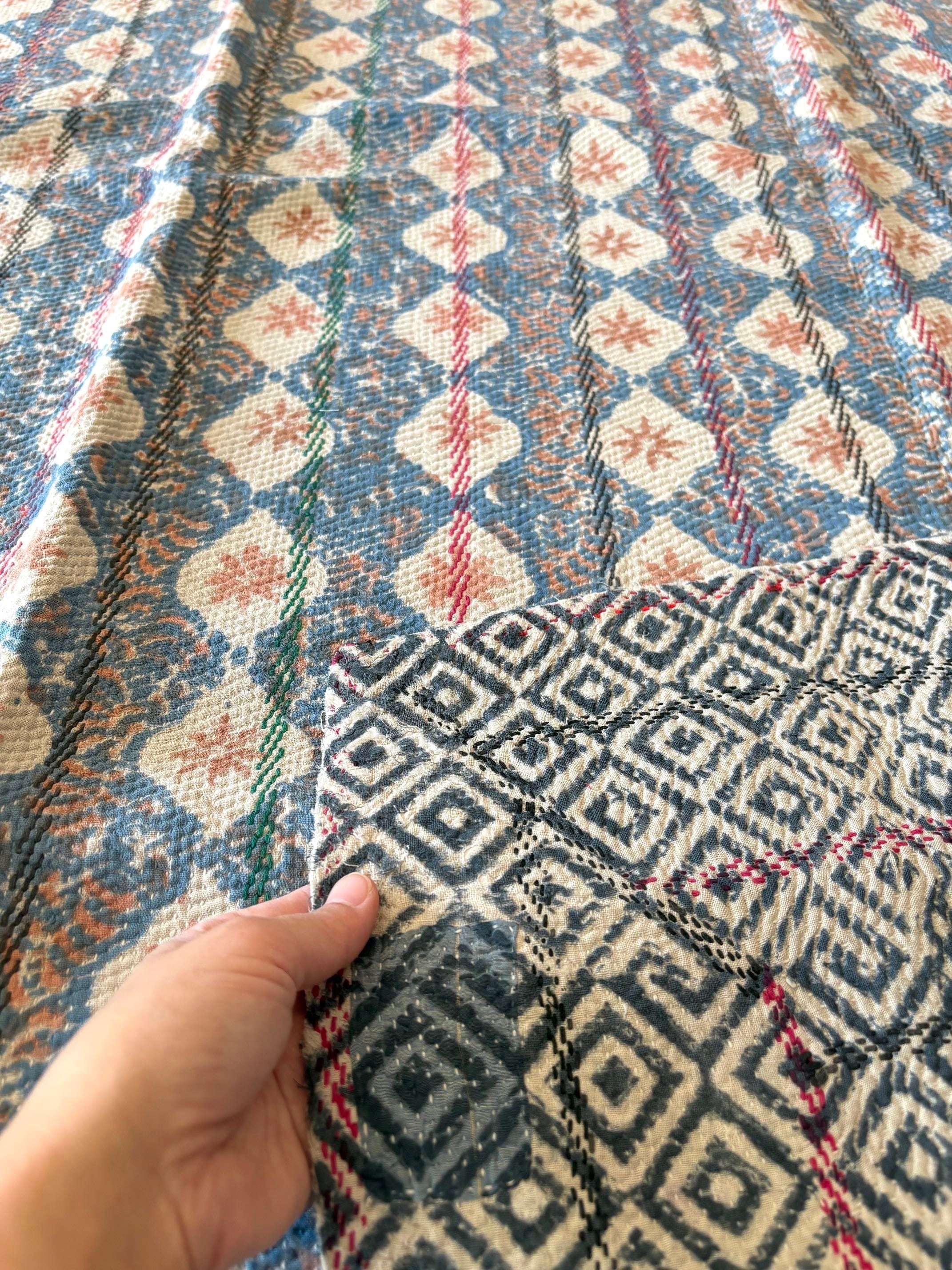 こちらは、インドの伝統的な「カンタ刺繍」と「ブロックプリント」がひとつになった、特別なミックスキルトです。