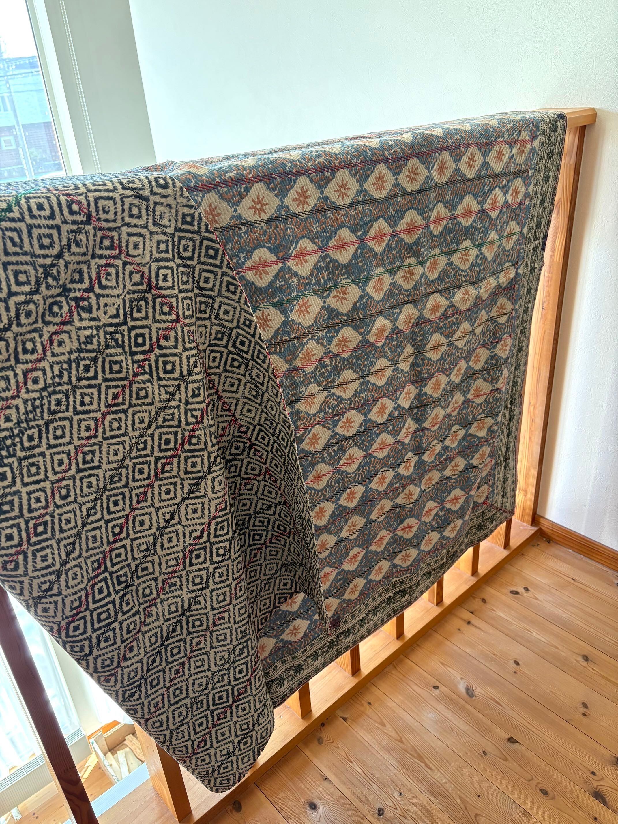 「これは絶対にお客様に届けたい」と感じた一枚。インドの風景や、作り手さんの手の動きが目に浮かぶような、味わい深いキルトです。