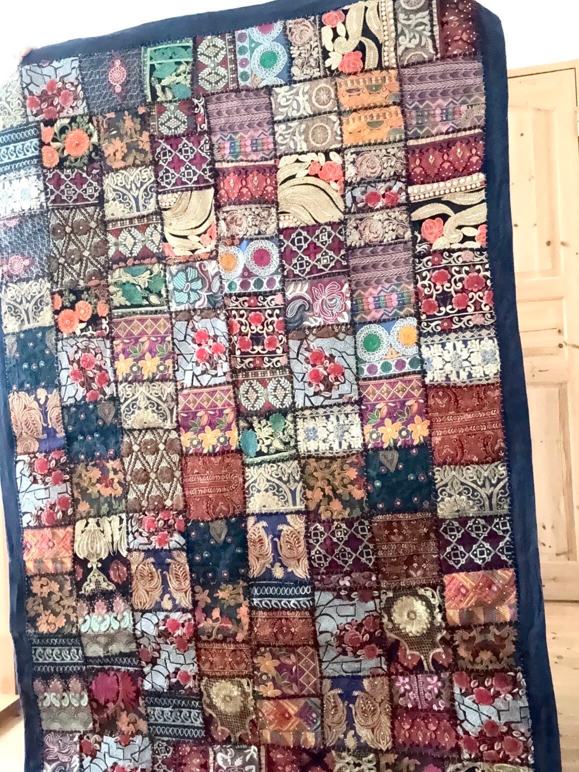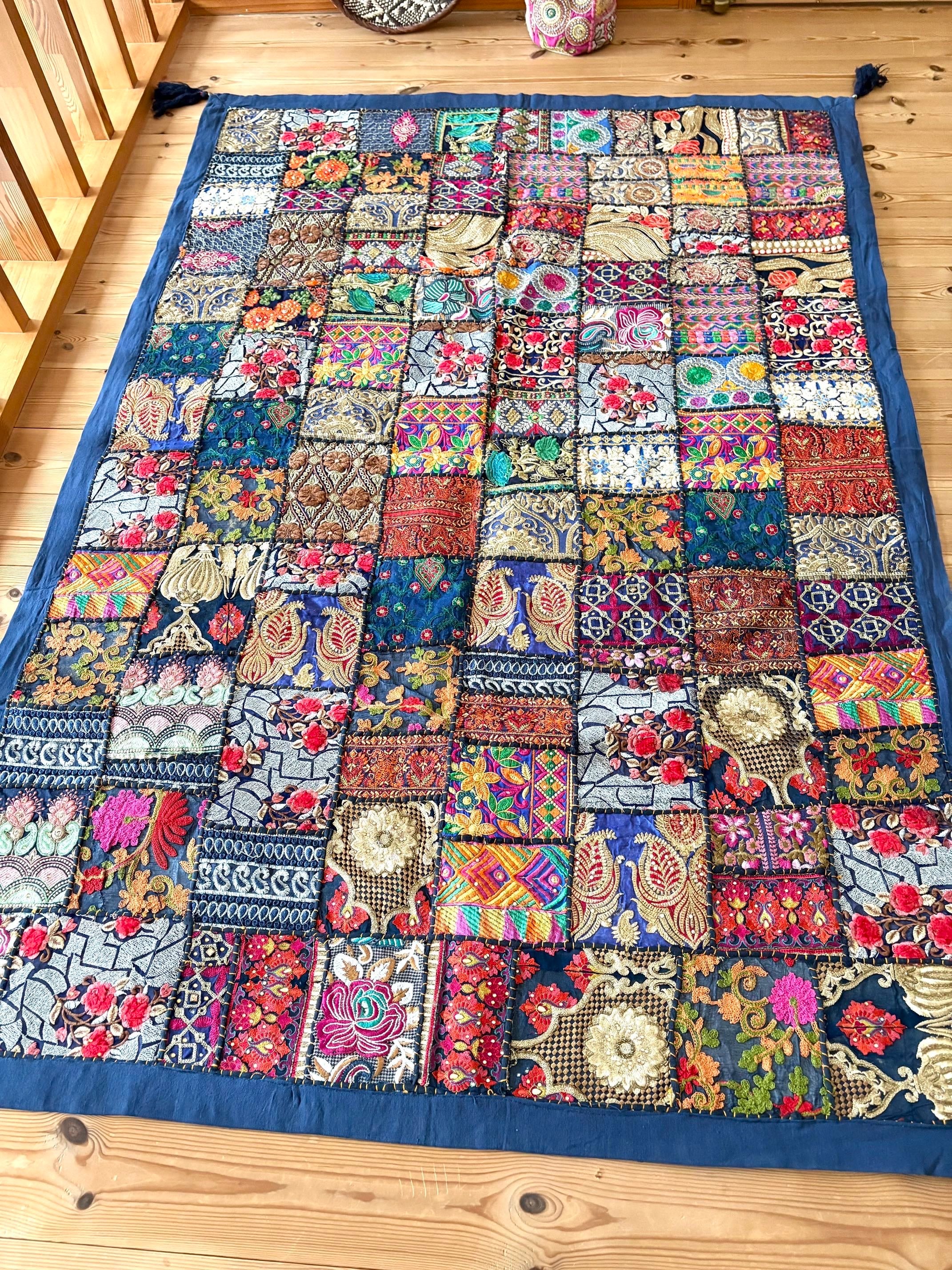 ブルーフレーム中の色鮮やかな刺繍が際立つ、とてもゴージャスでオシャレなザリ刺繍タペストリーラグです。