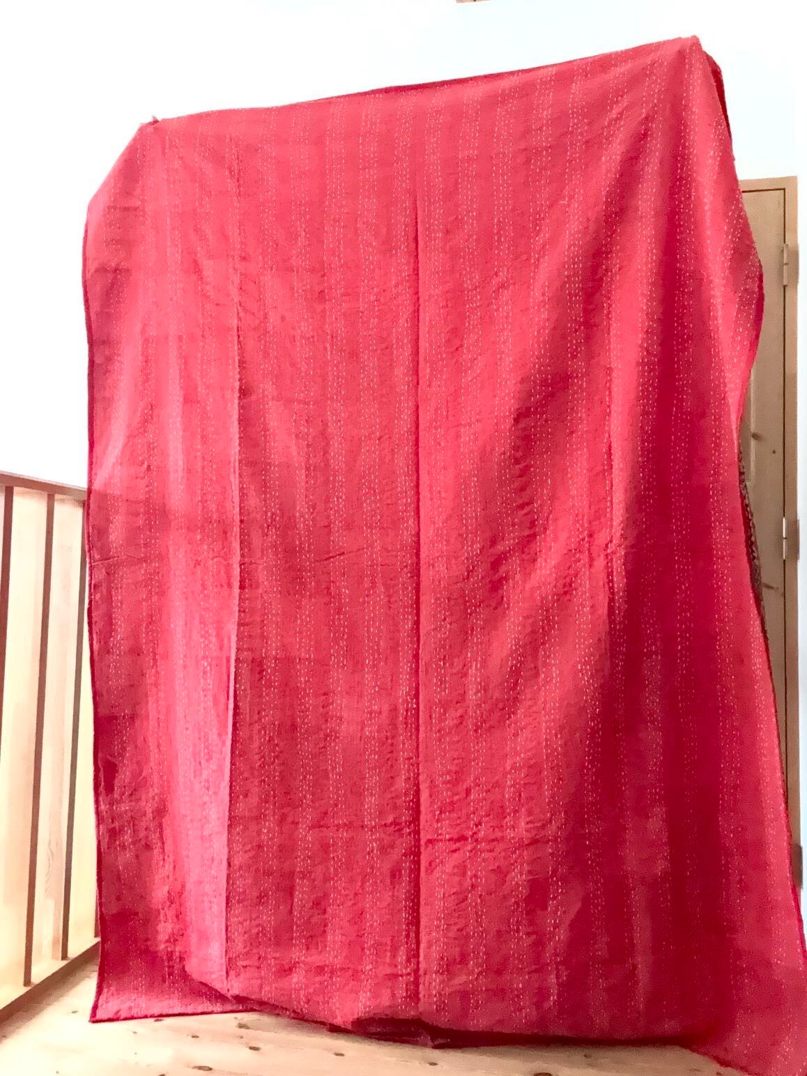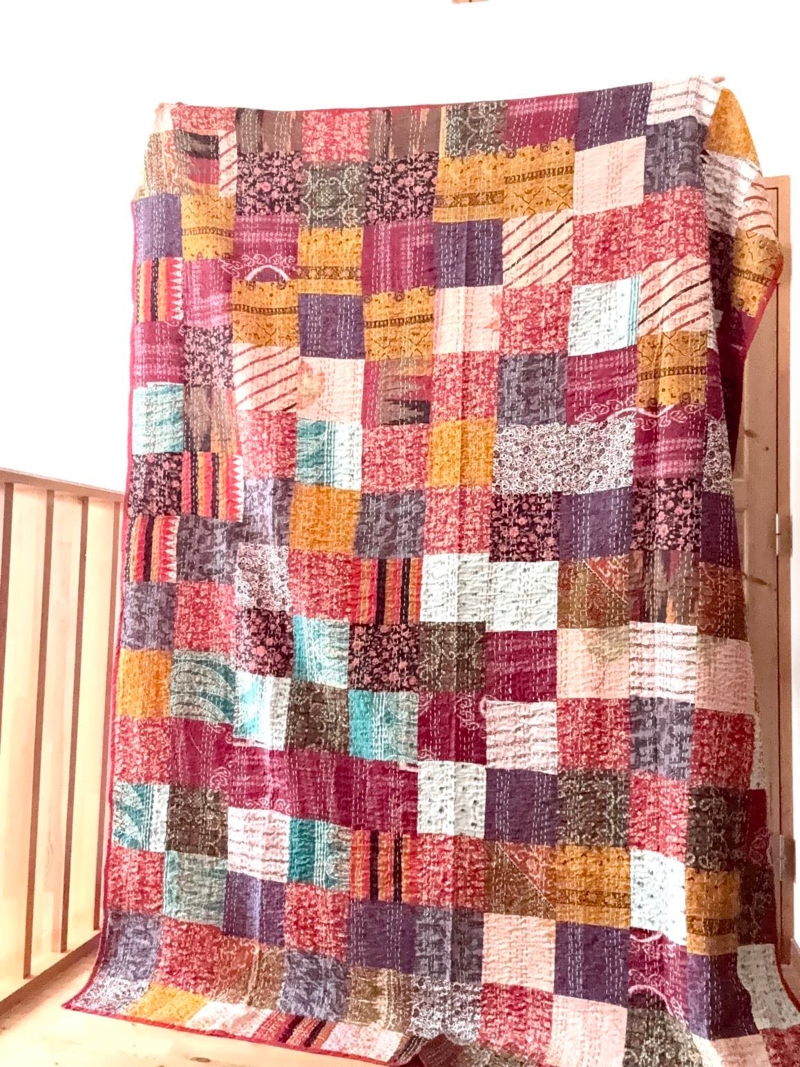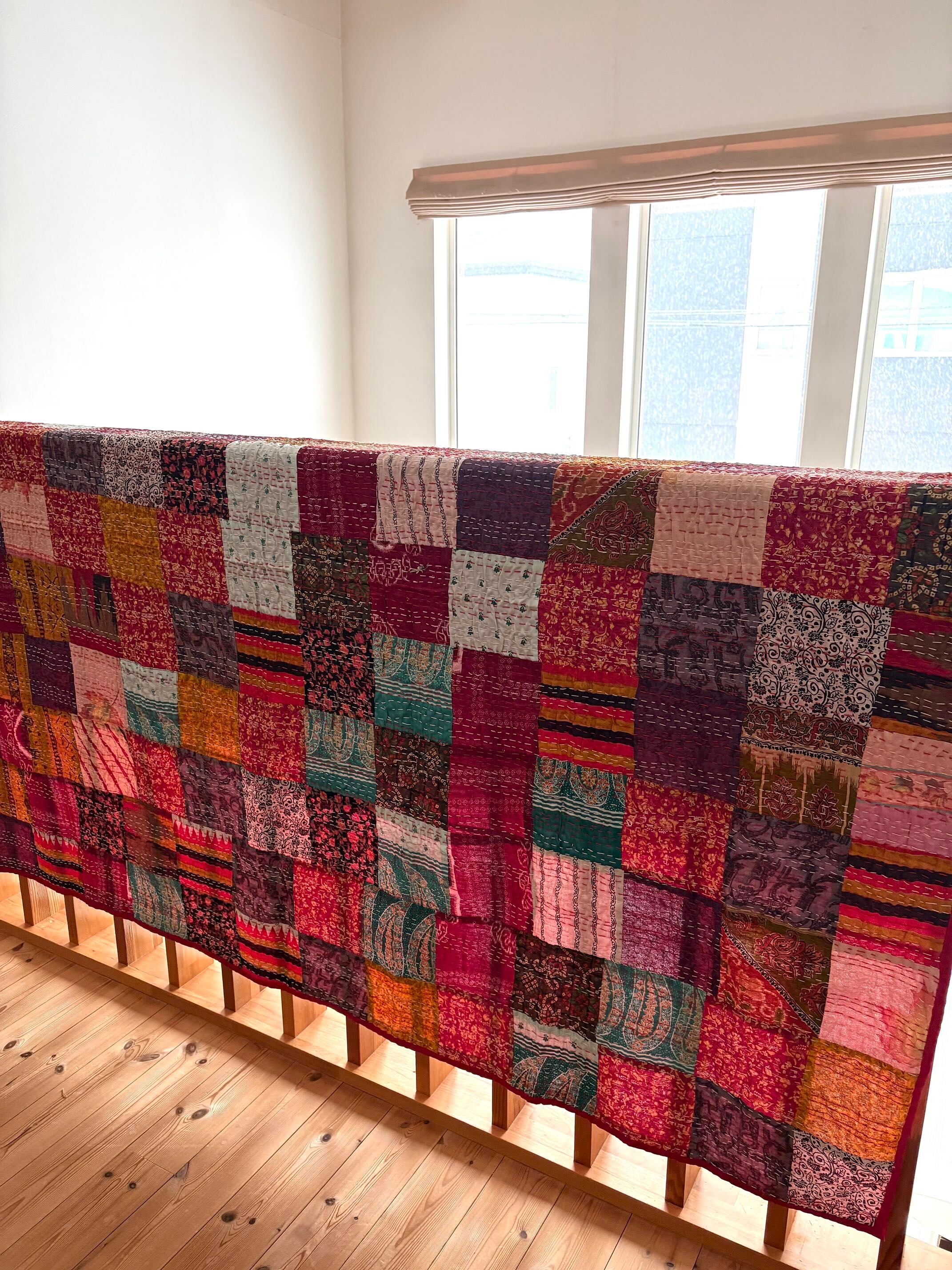 ・こちらは、ヴィンテージサリーをつないで作られた一点もののキルトです。