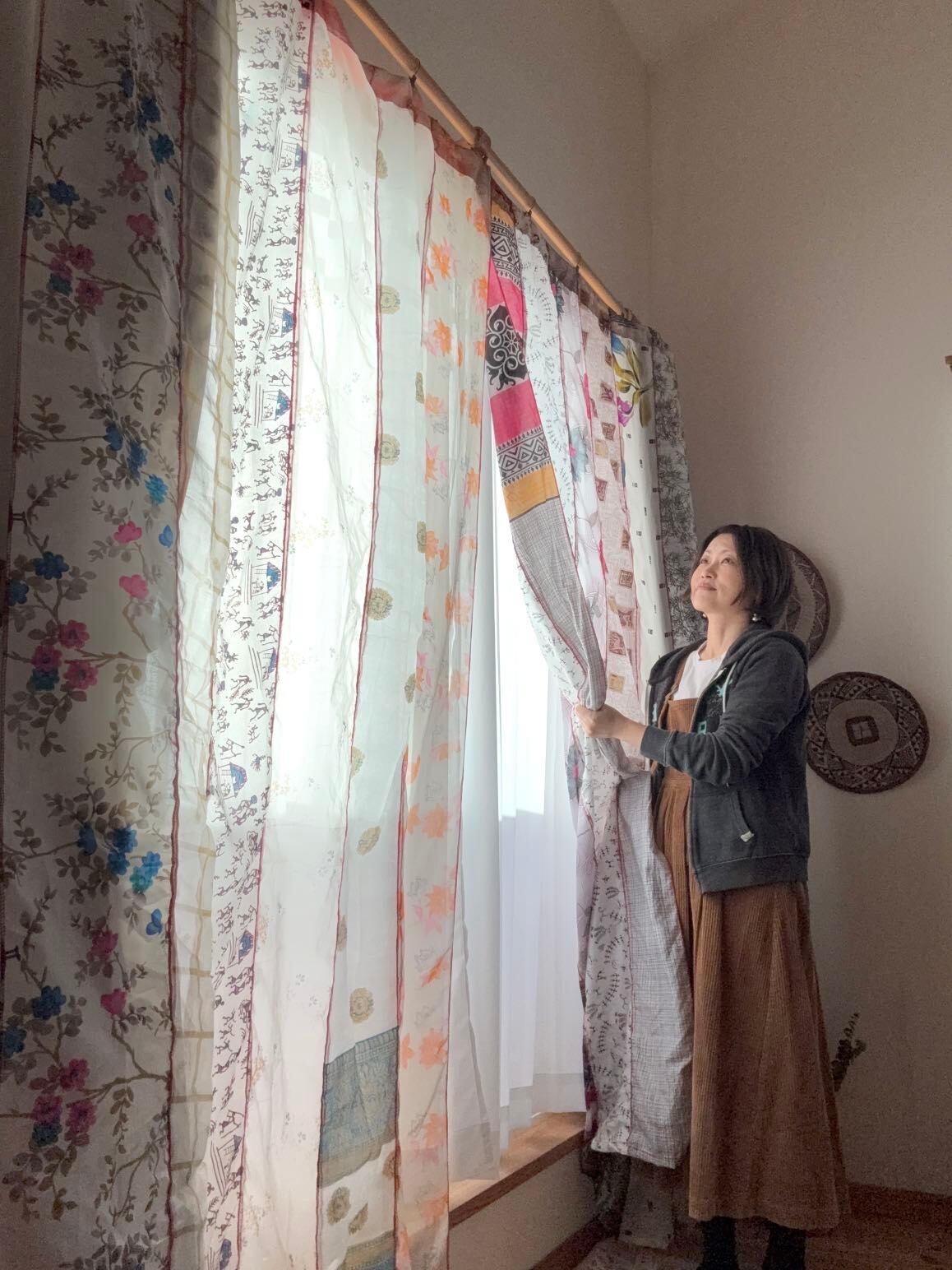 1枚1枚丁寧に繋ぎ合わせ、大変カラフルできれいなパッチワークカーテンにアップサイクルされました!!