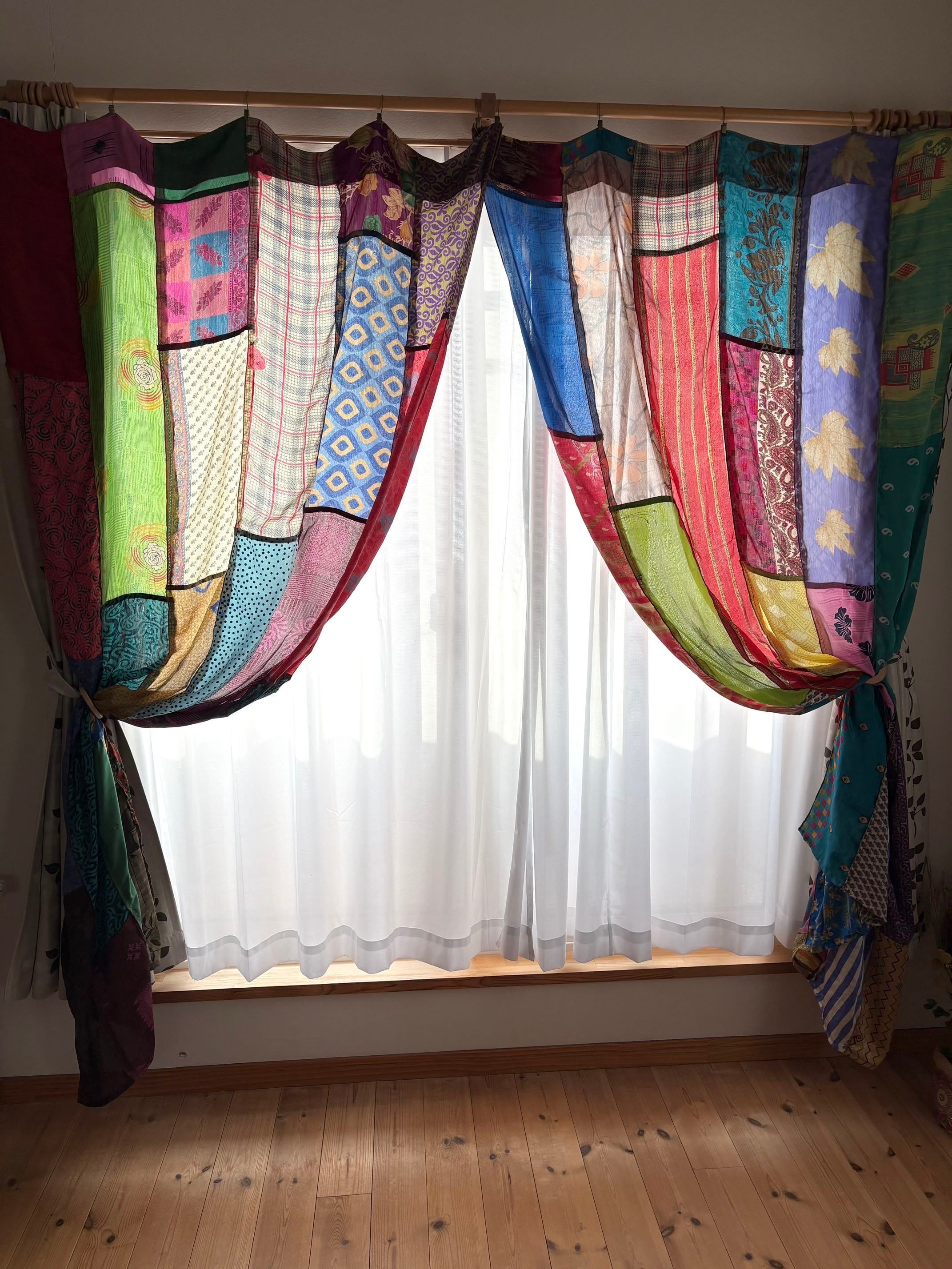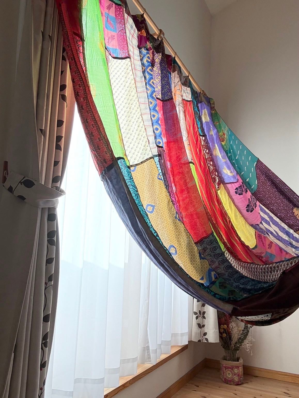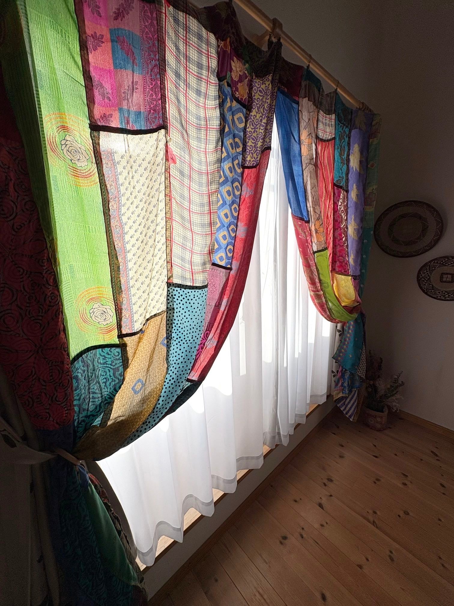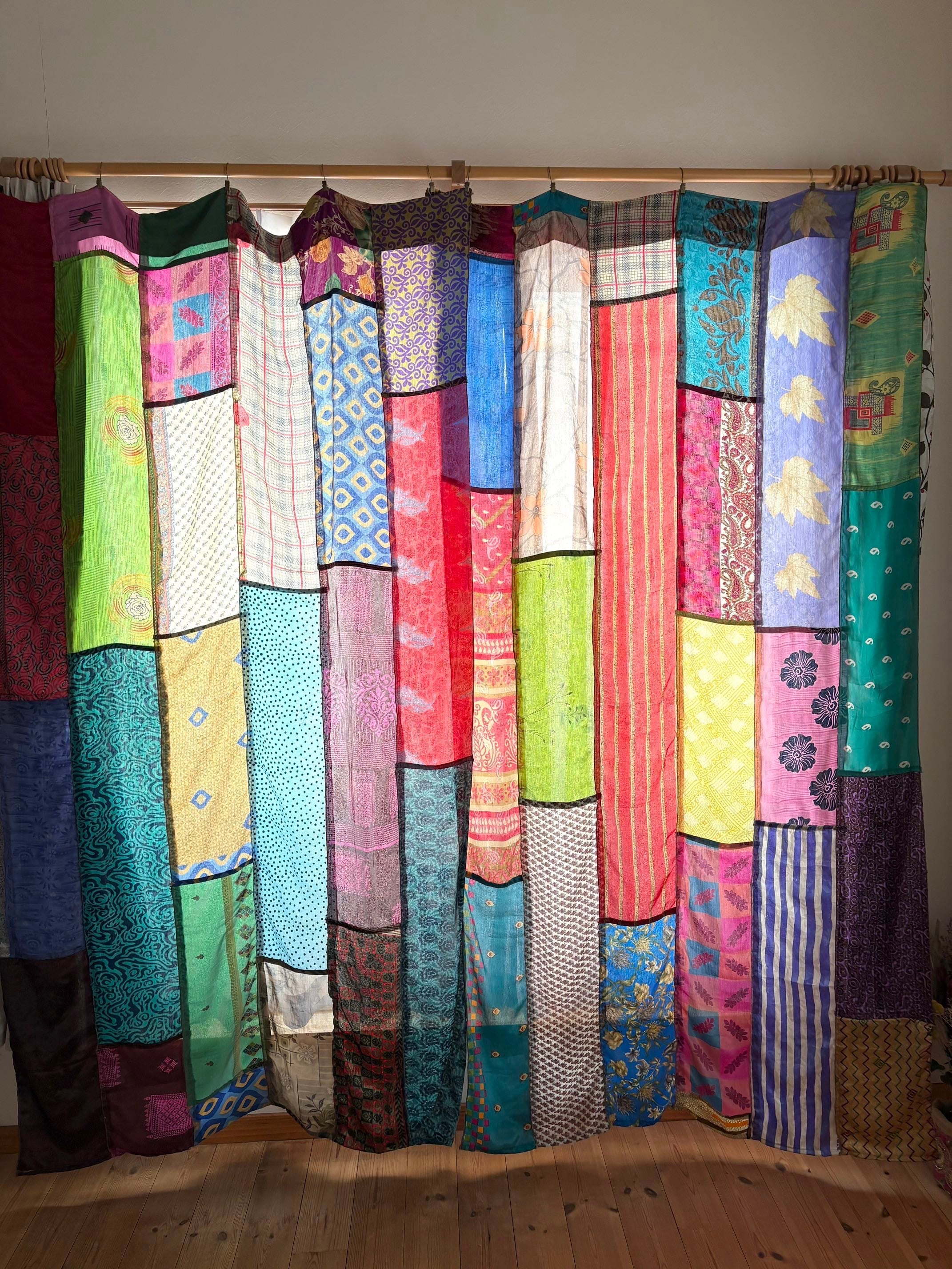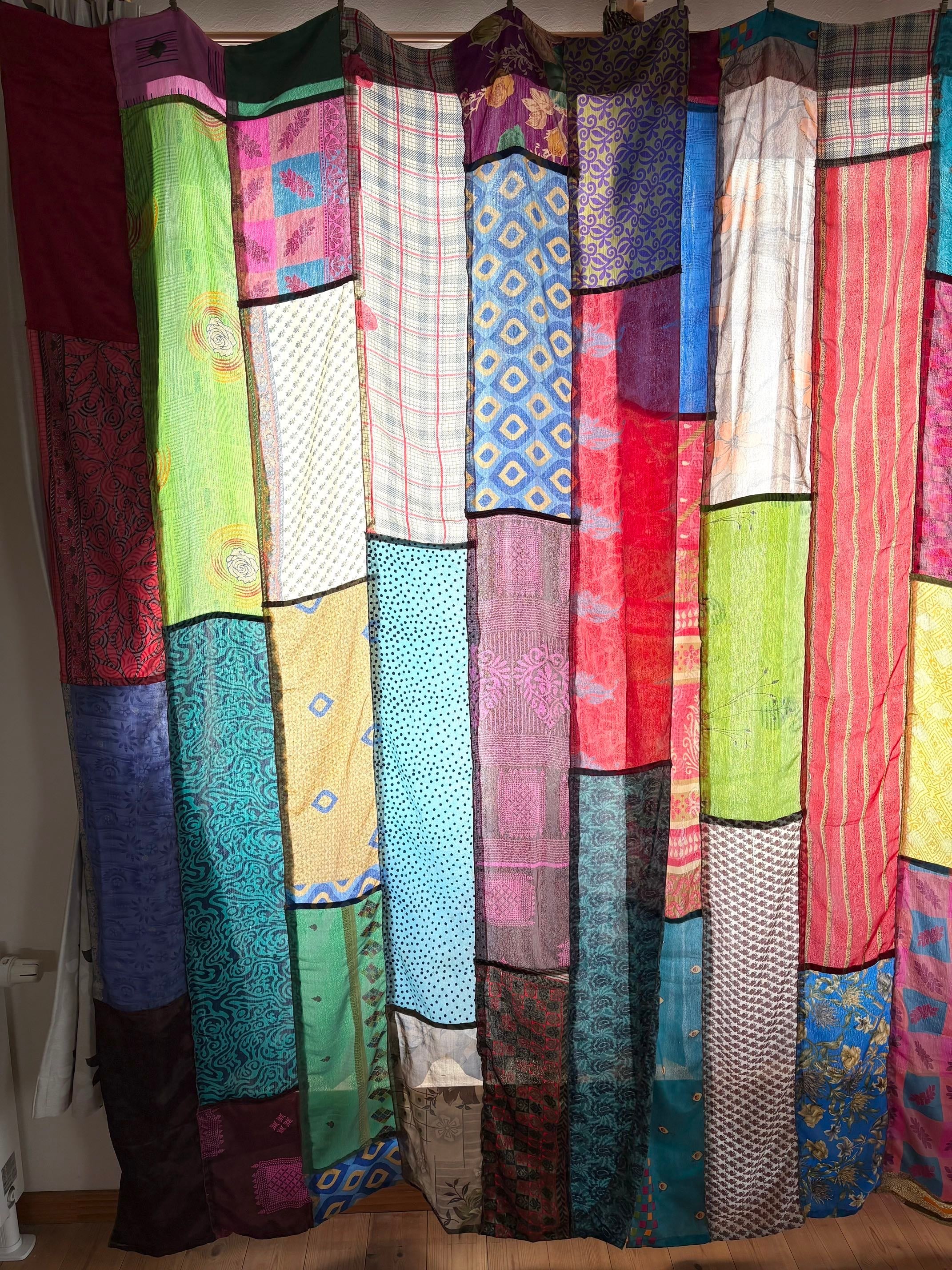 ヴィンテージサリーで出来たパッチワークシルクカーテン