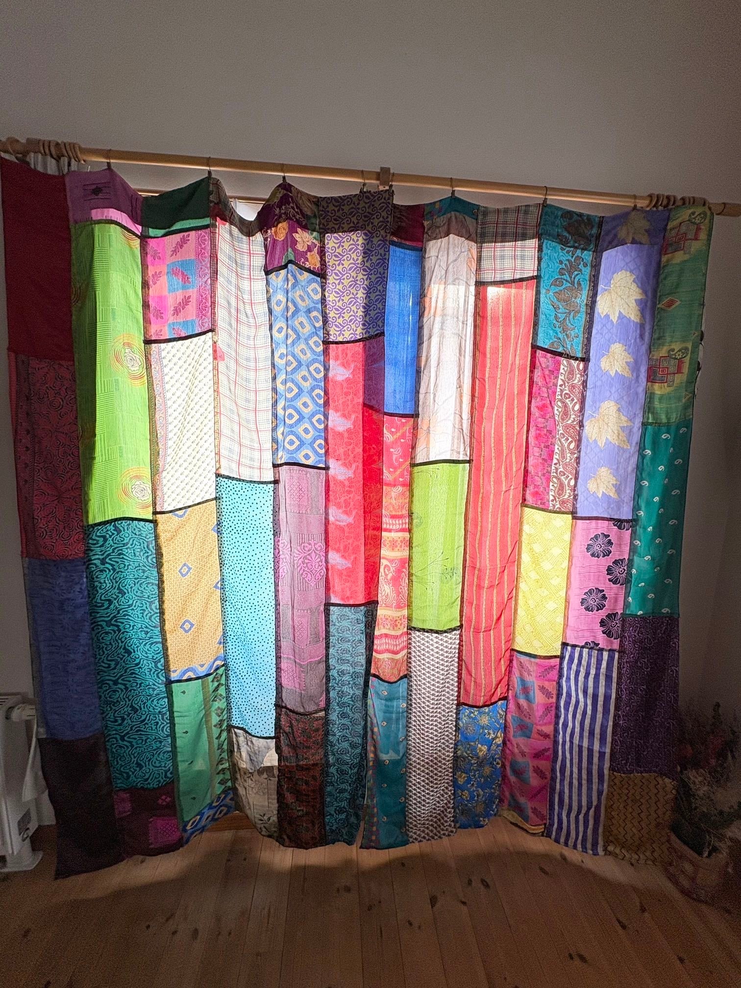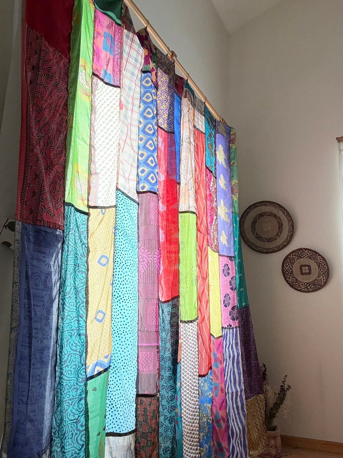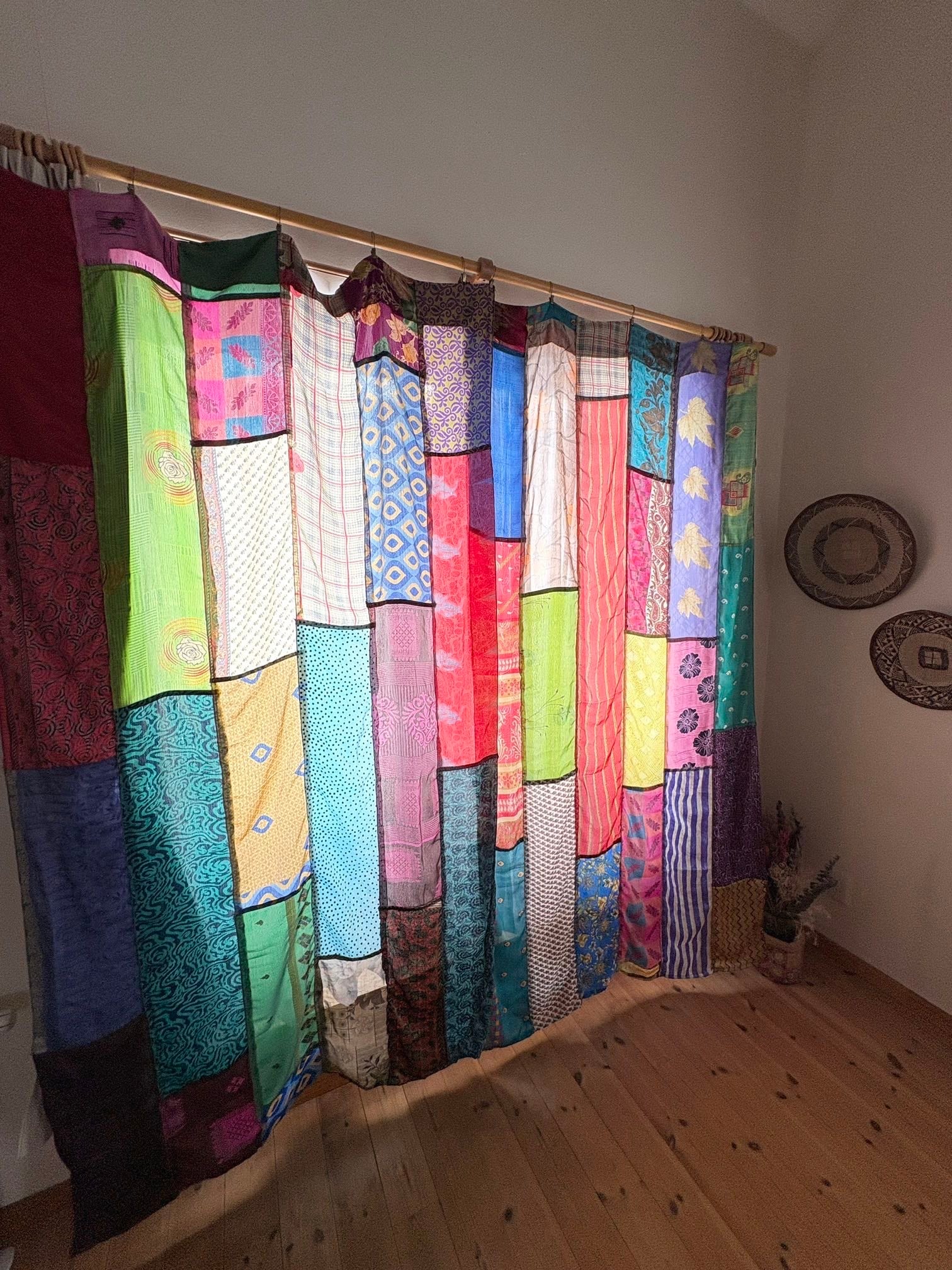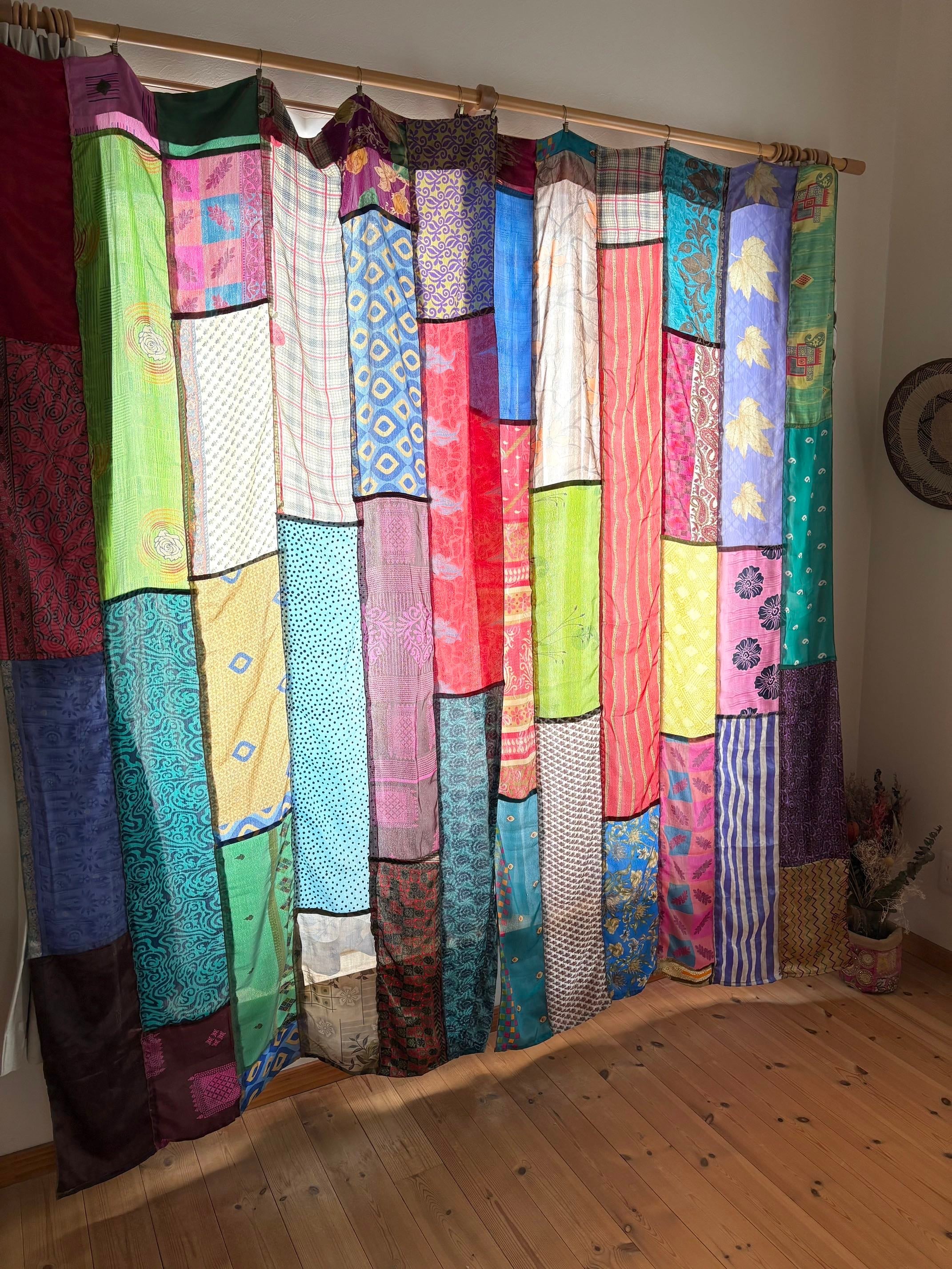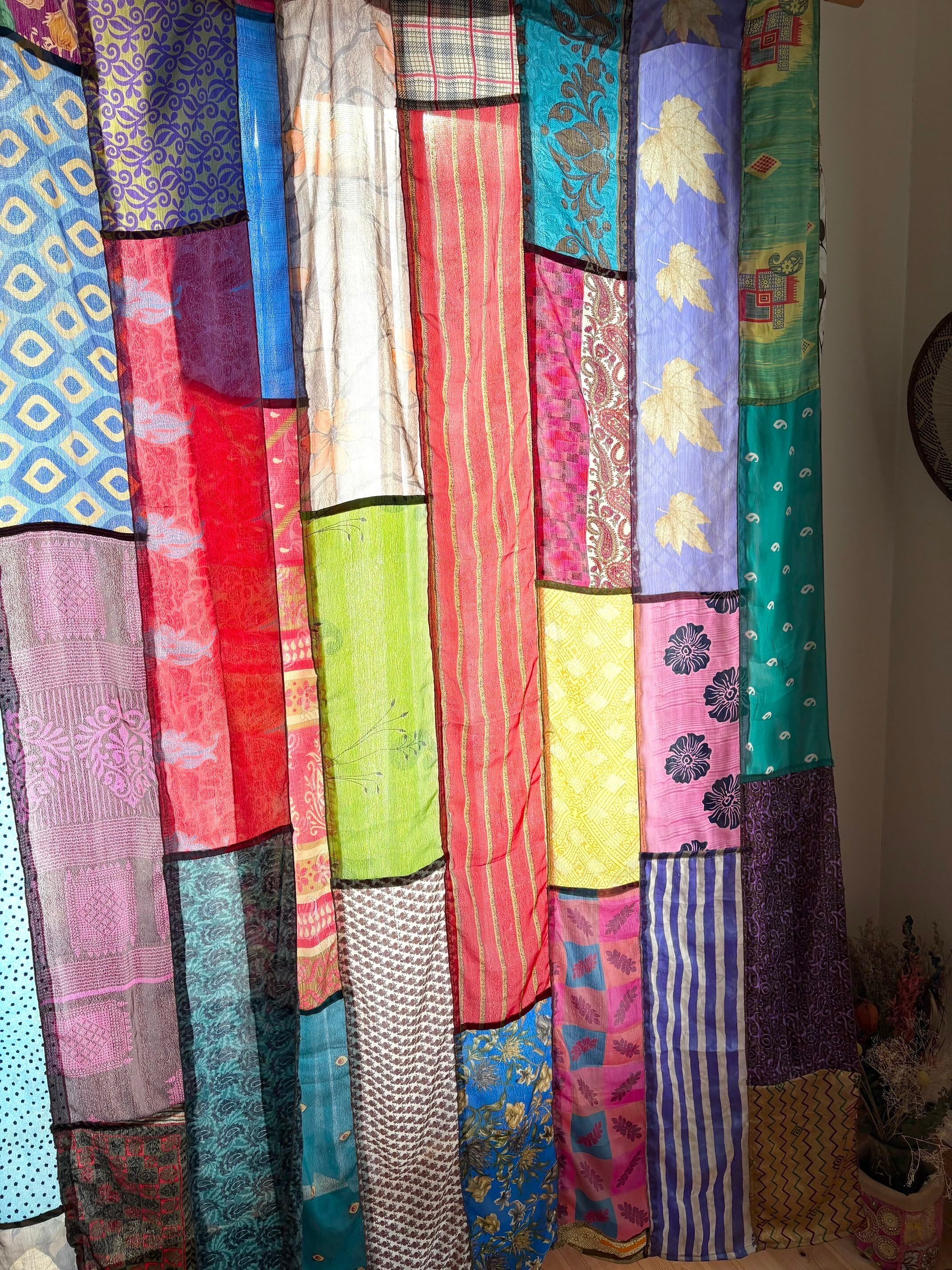 ヴィンテージサリーで出来たパッチワークシルクカーテン