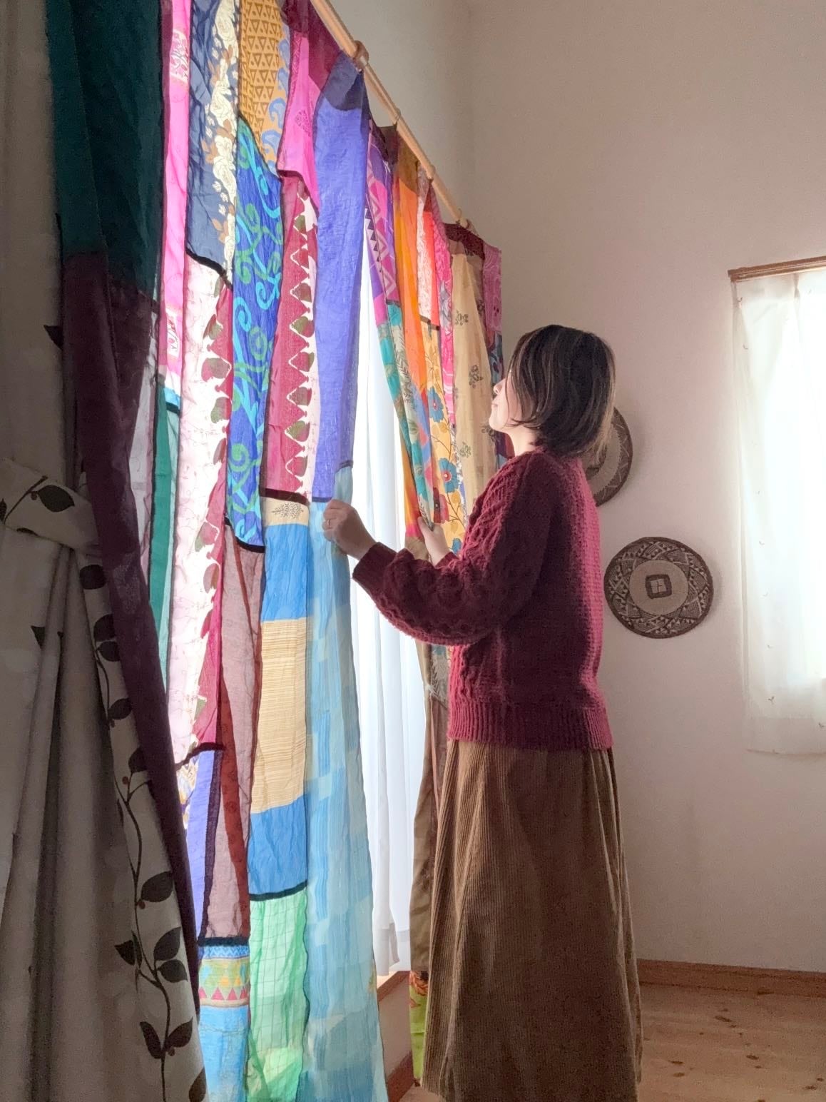 1枚1枚丁寧に繋ぎ合わせ、大変カラフルできれいなパッチワークカーテンにアップサイクルされました!!