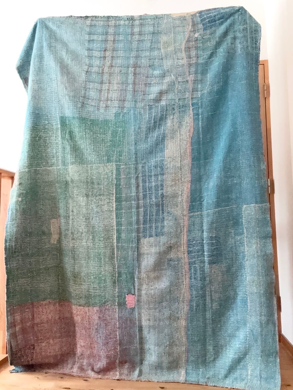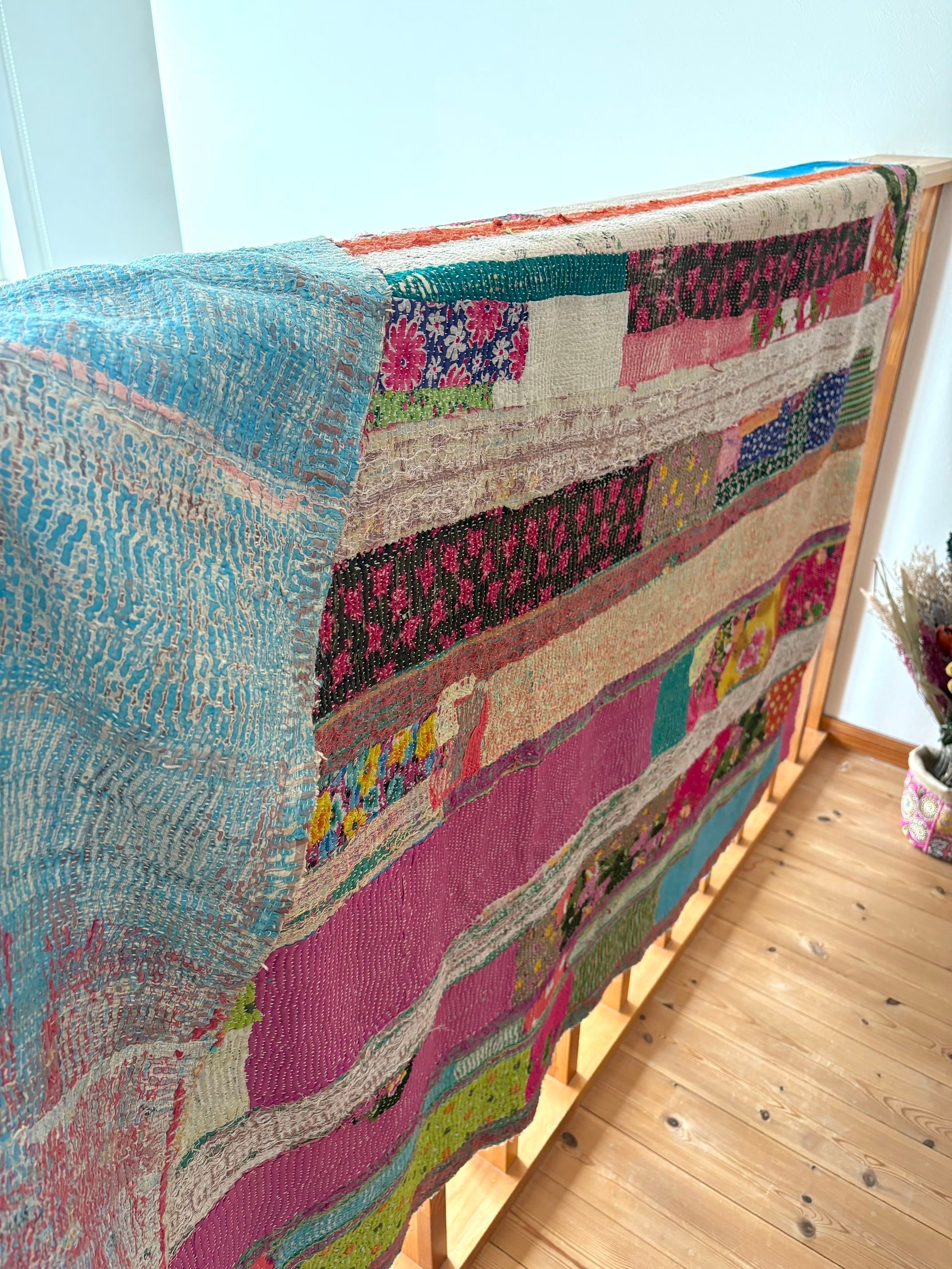 インドの女性たちが、古くなったサリー(布)を丁寧に重ね、ひと針ひと針刺し子を施して仕立てた「カンタキルト」。