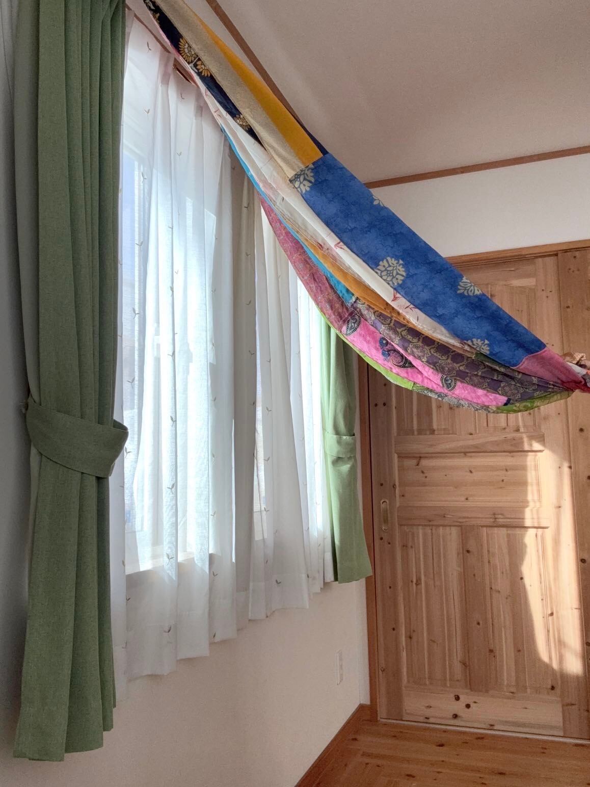 1枚1枚丁寧に繋ぎ合わせ、大変カラフルできれいなパッチワークカーテンにアップサイクルされました!!