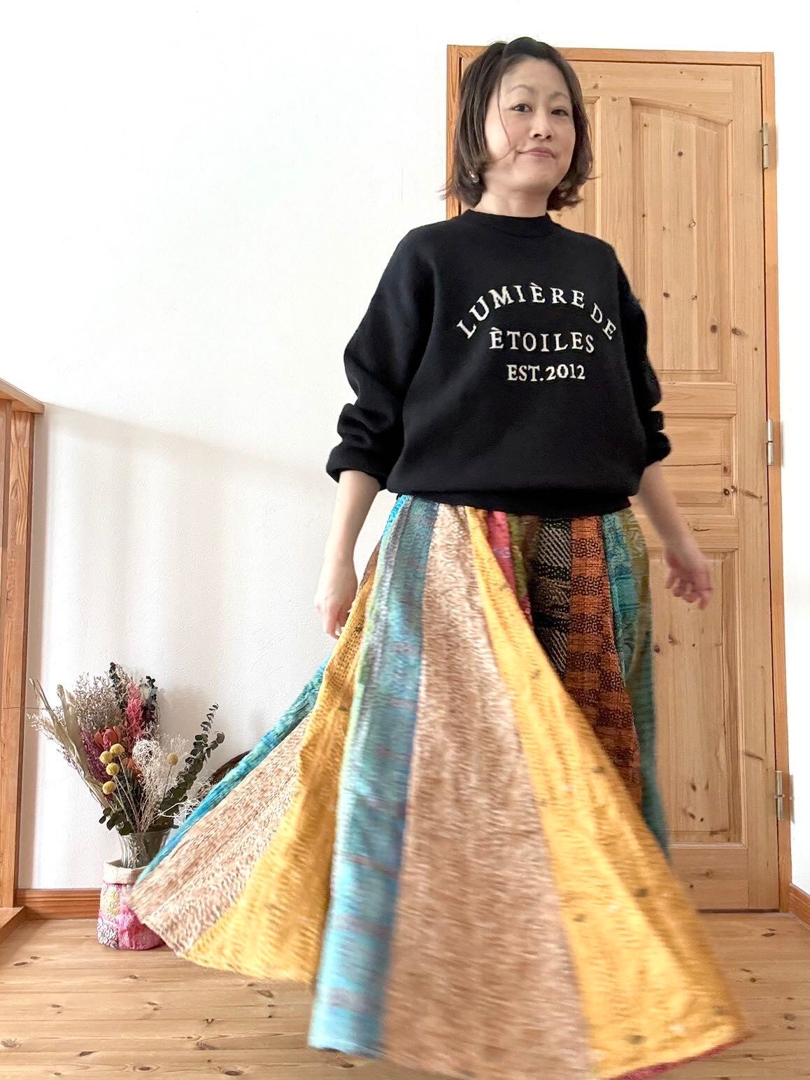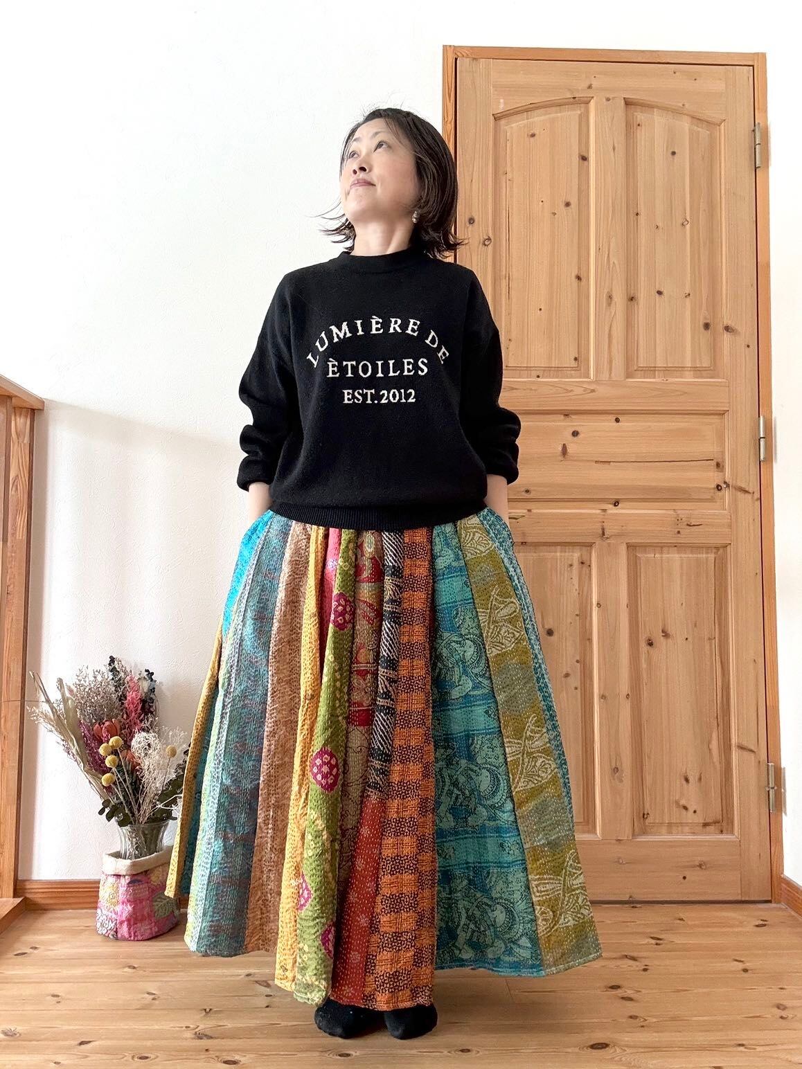 村の女性たちが一針一針カンタ刺繍をしたシルク生地をパッチワークで繋ぎ合わせた唯一無二のスカートです!!