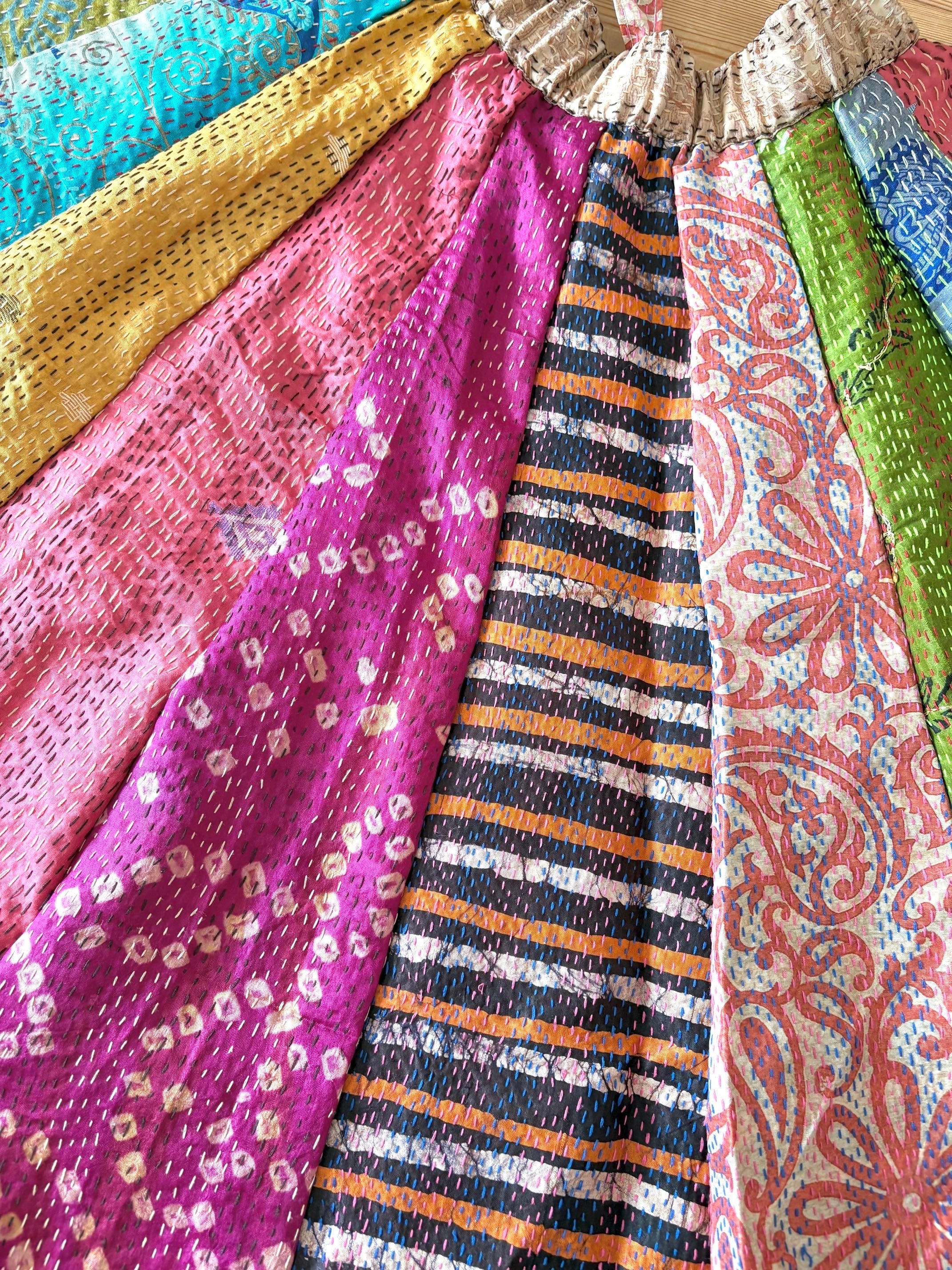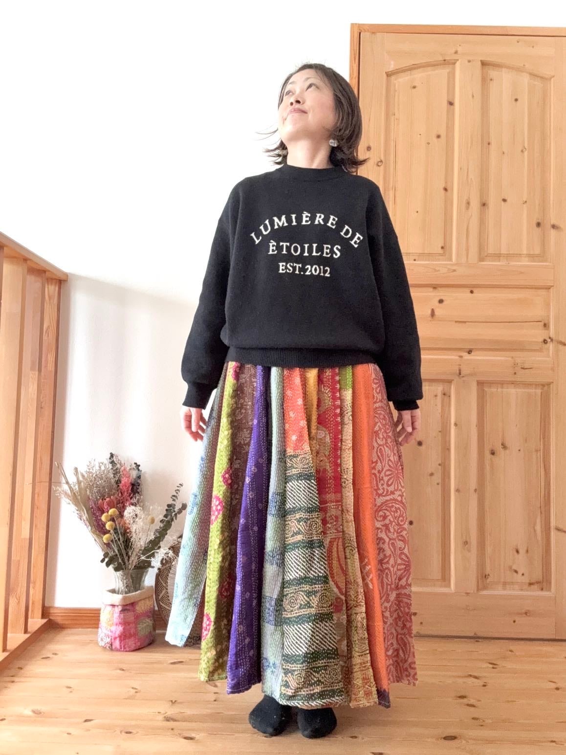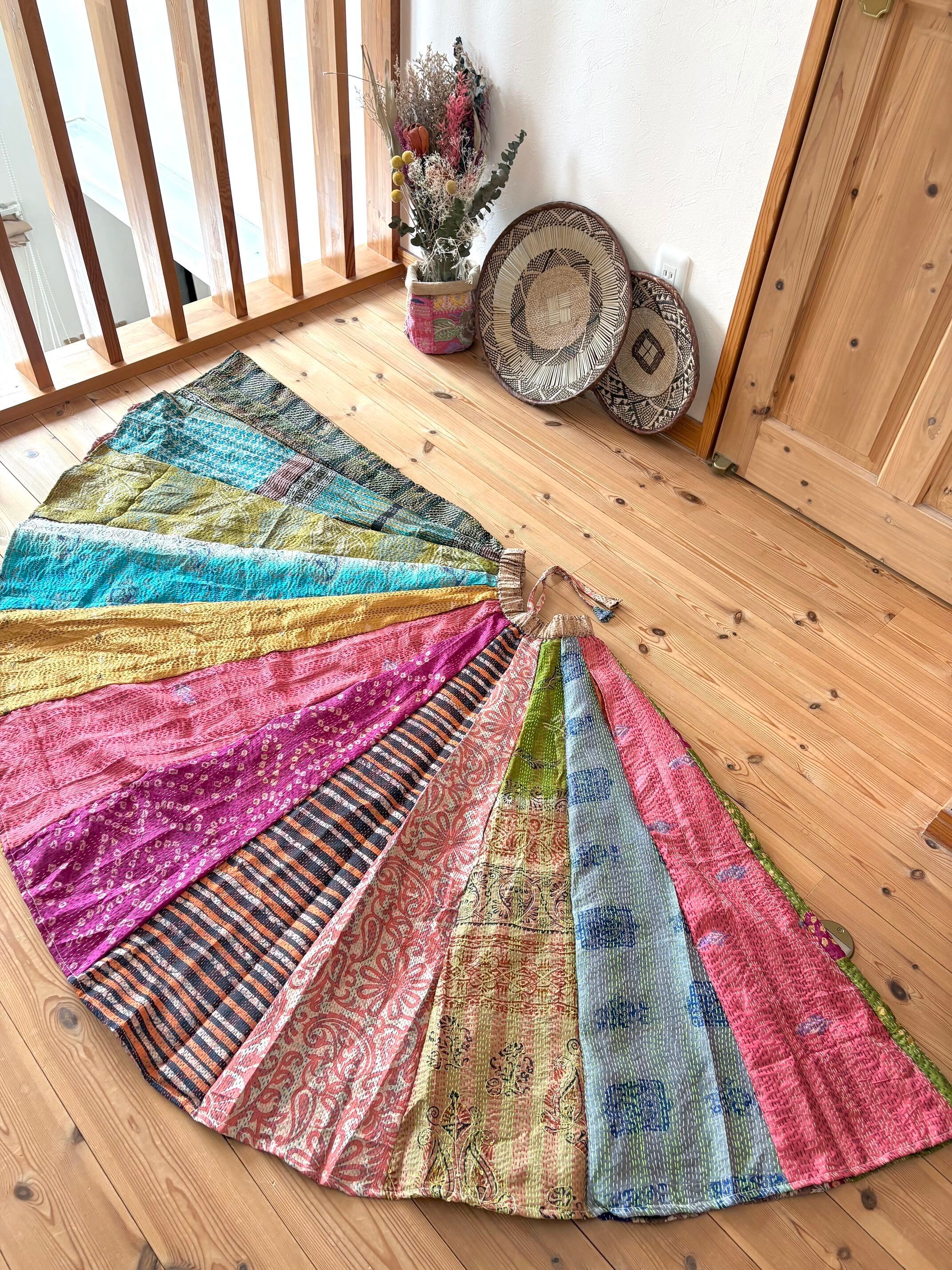 村の女性たちが一針一針カンタ刺繍をしたシルク生地をパッチワークで繋ぎ合わせた唯一無二のスカートです!!