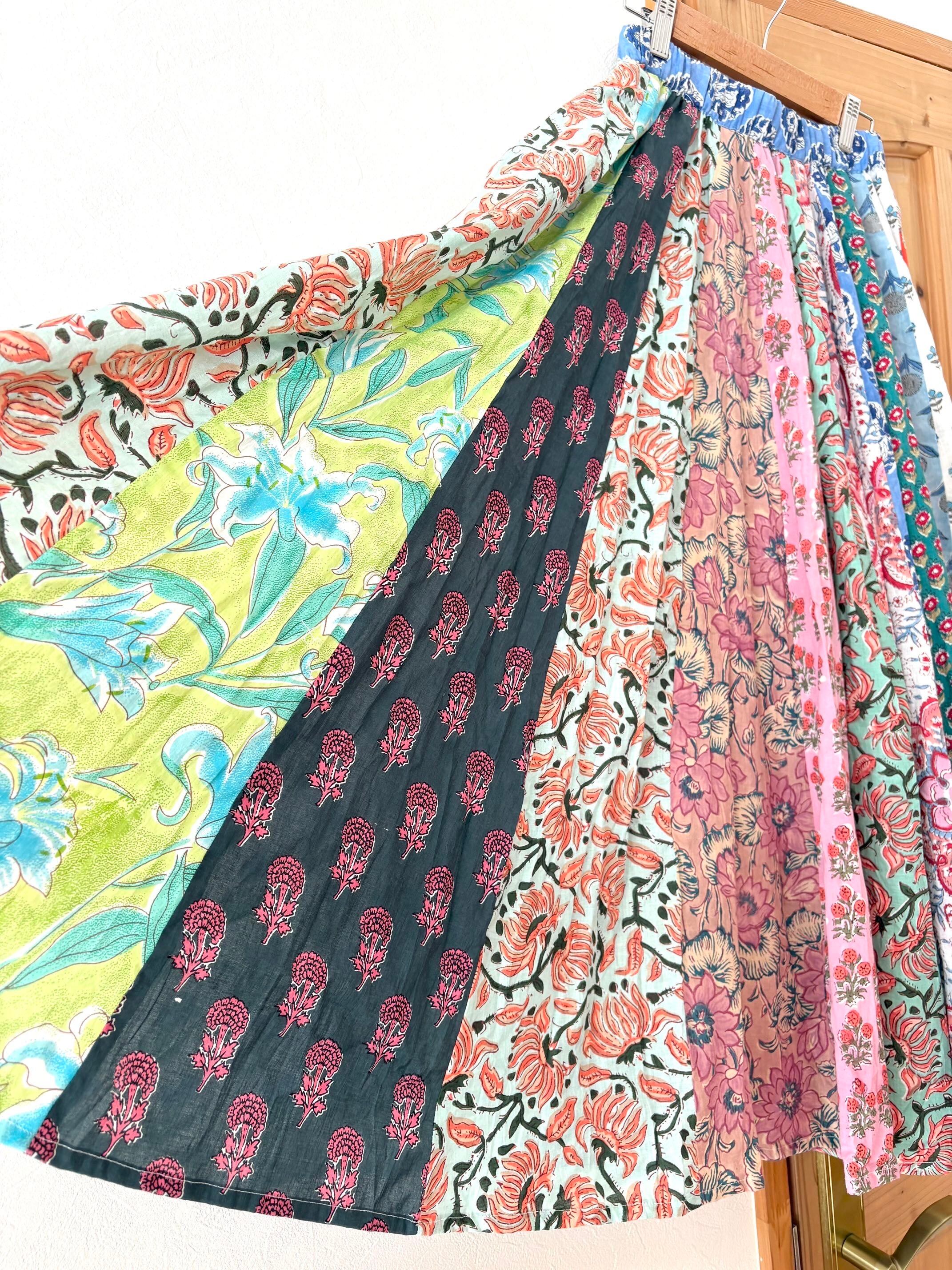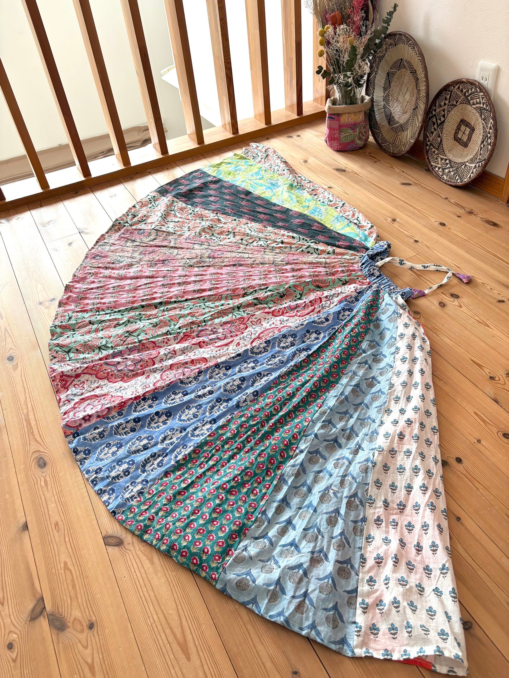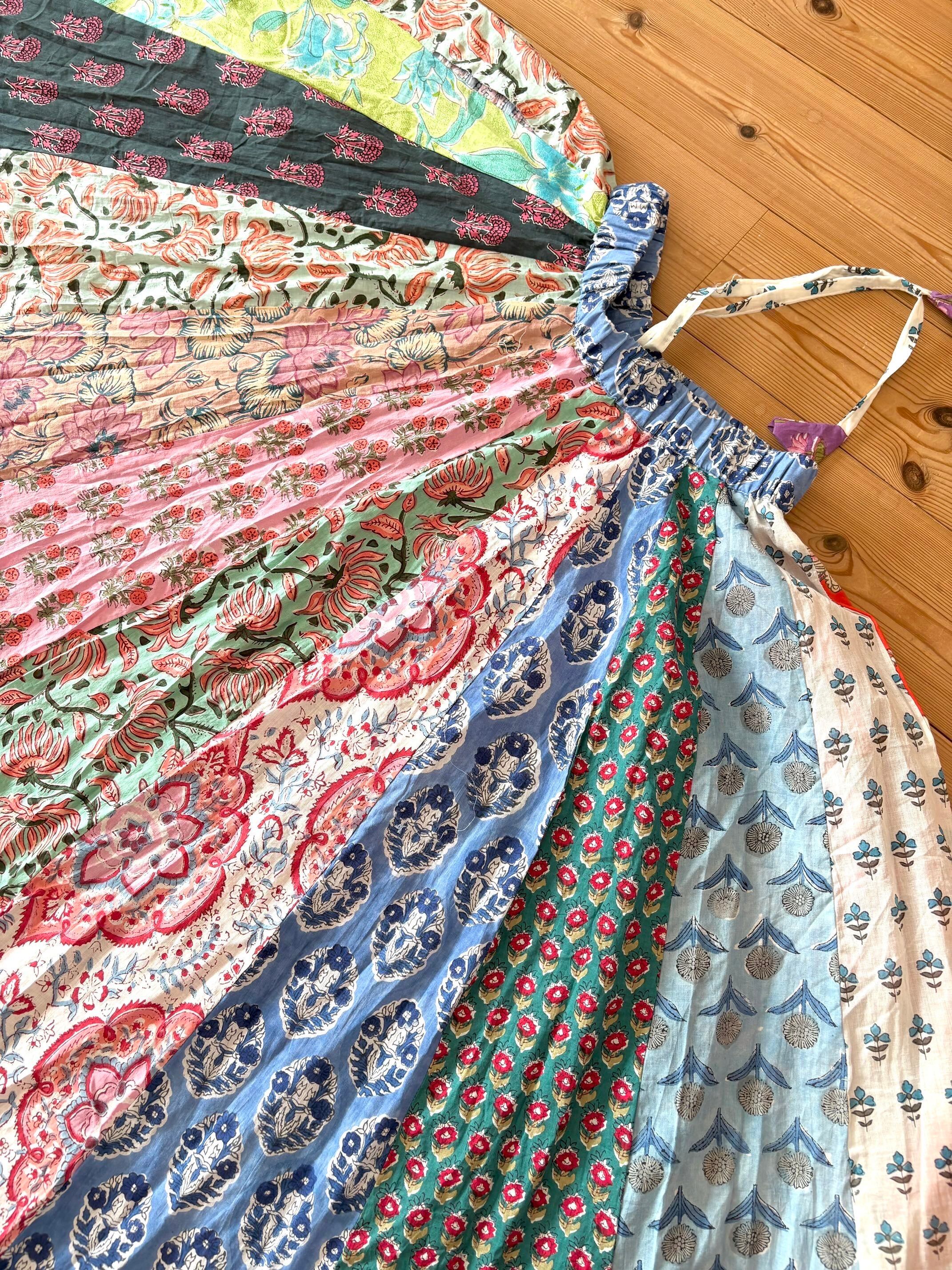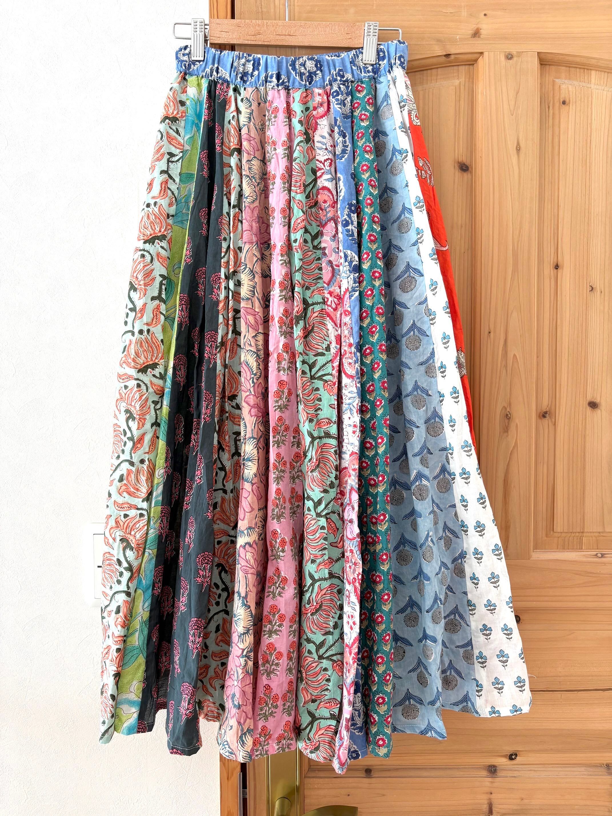 インドの職人さんによる伝統的な「ブロックプリント(木版染め)」で、ひとつひとつ丁寧に手刷りされた布を使った世界でたった一つのパッチワークスカートです。