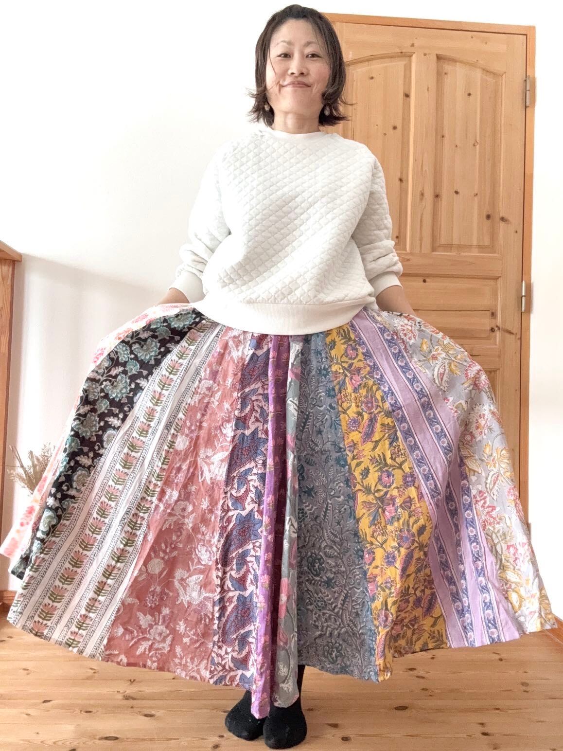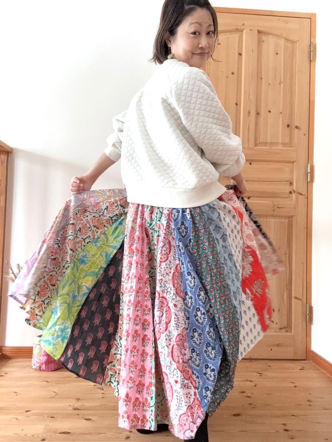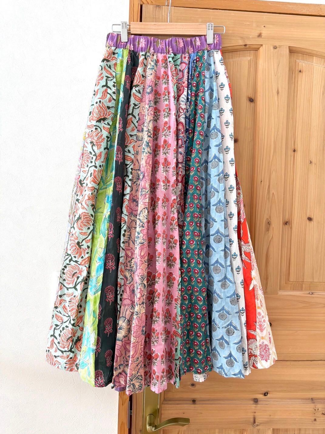インドの職人さんによる伝統的な「ブロックプリント(木版染め)」で、ひとつひとつ丁寧に手刷りされた布を使った世界でたった一つのパッチワークスカートです。