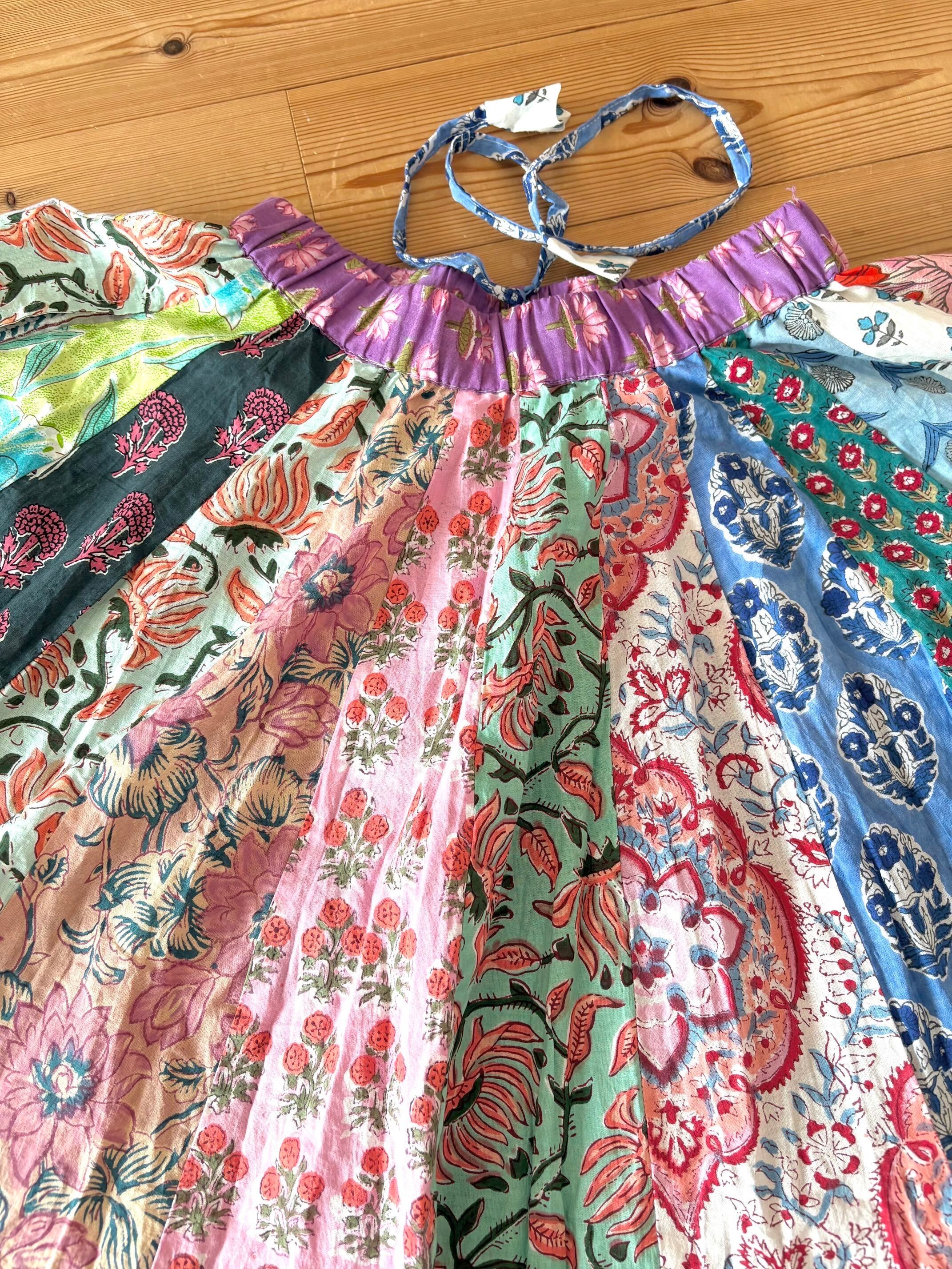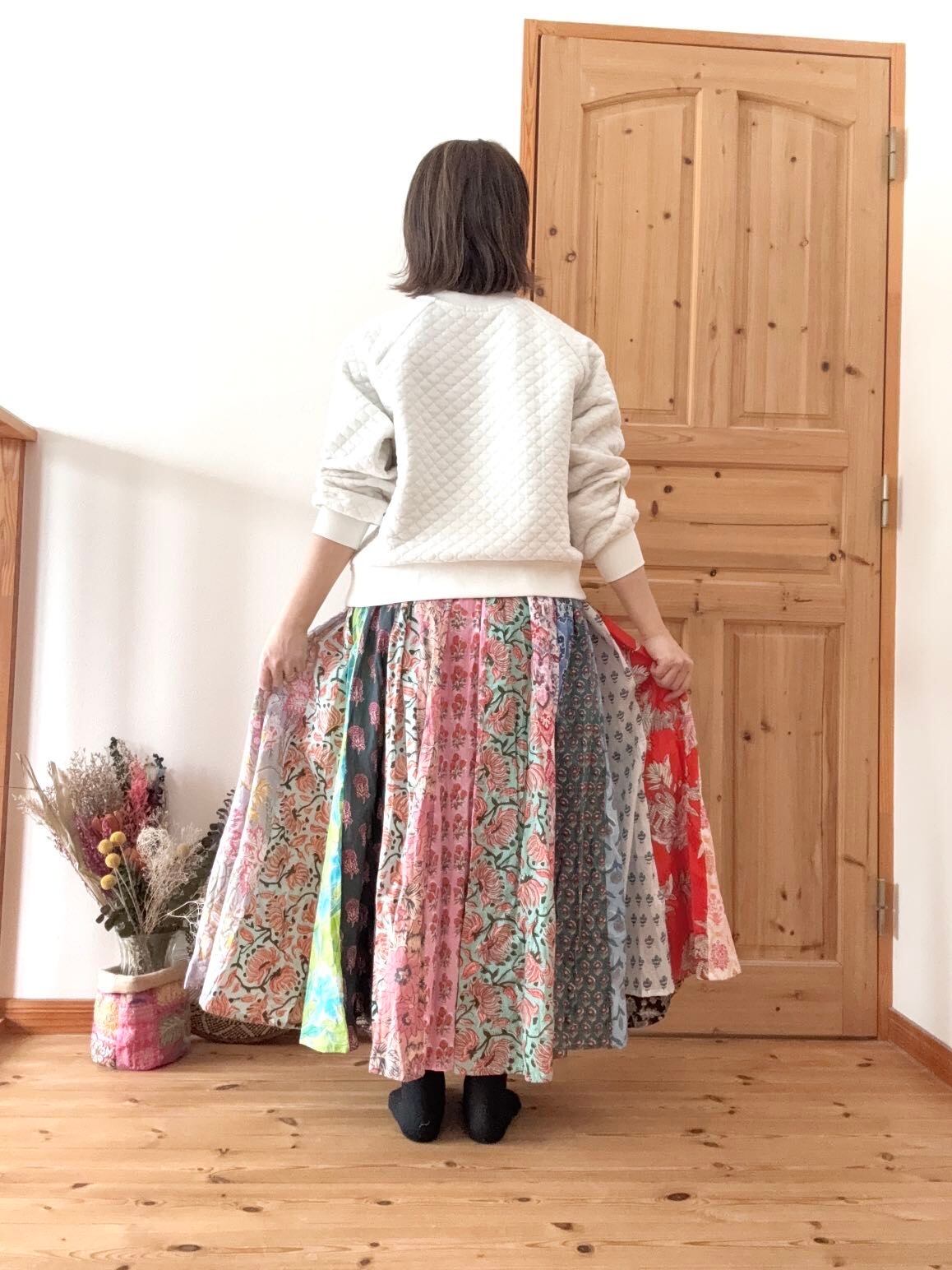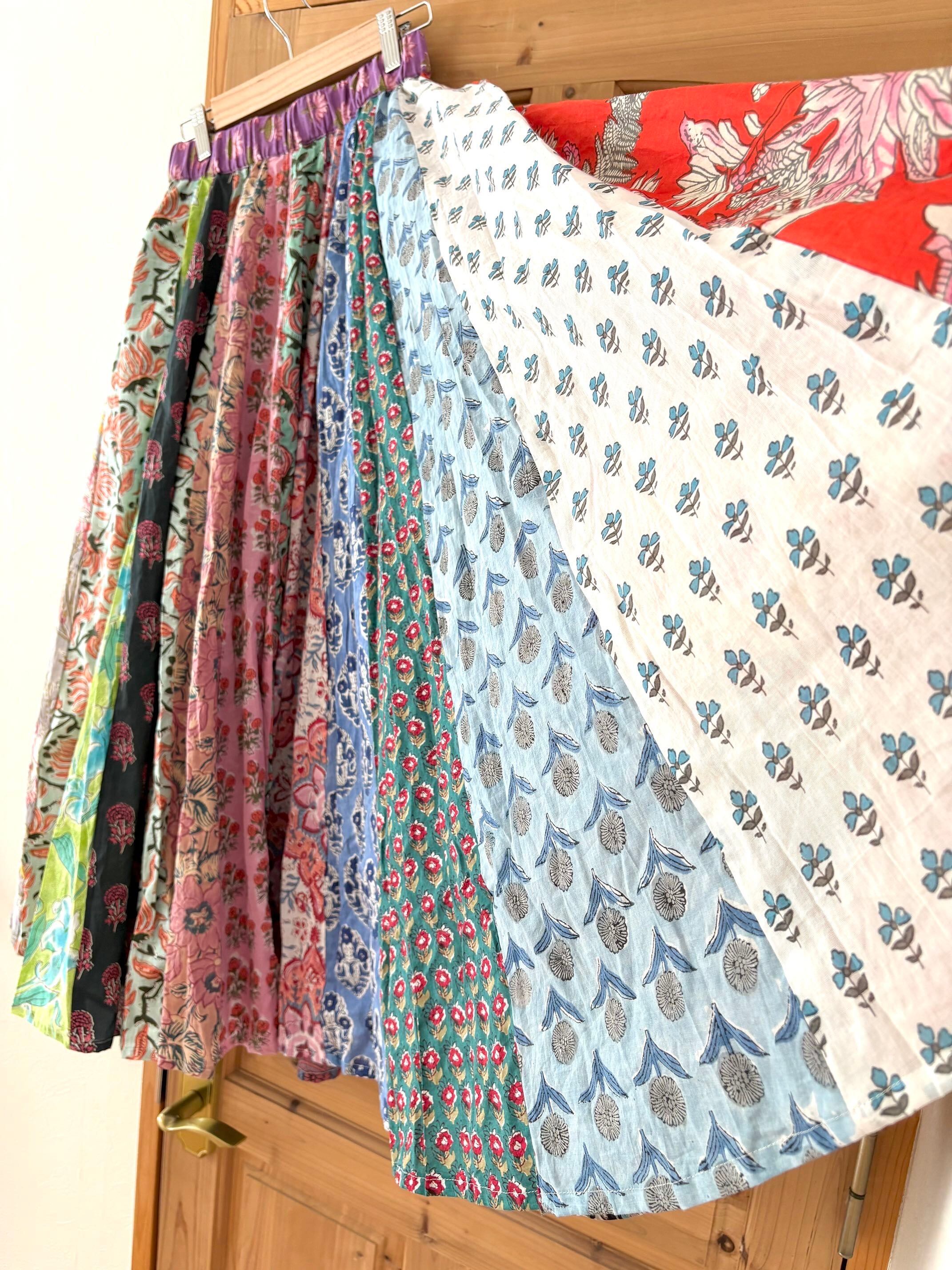 インドの職人さんによる伝統的な「ブロックプリント(木版染め)」で、ひとつひとつ丁寧に手刷りされた布を使った世界でたった一つのパッチワークスカートです。