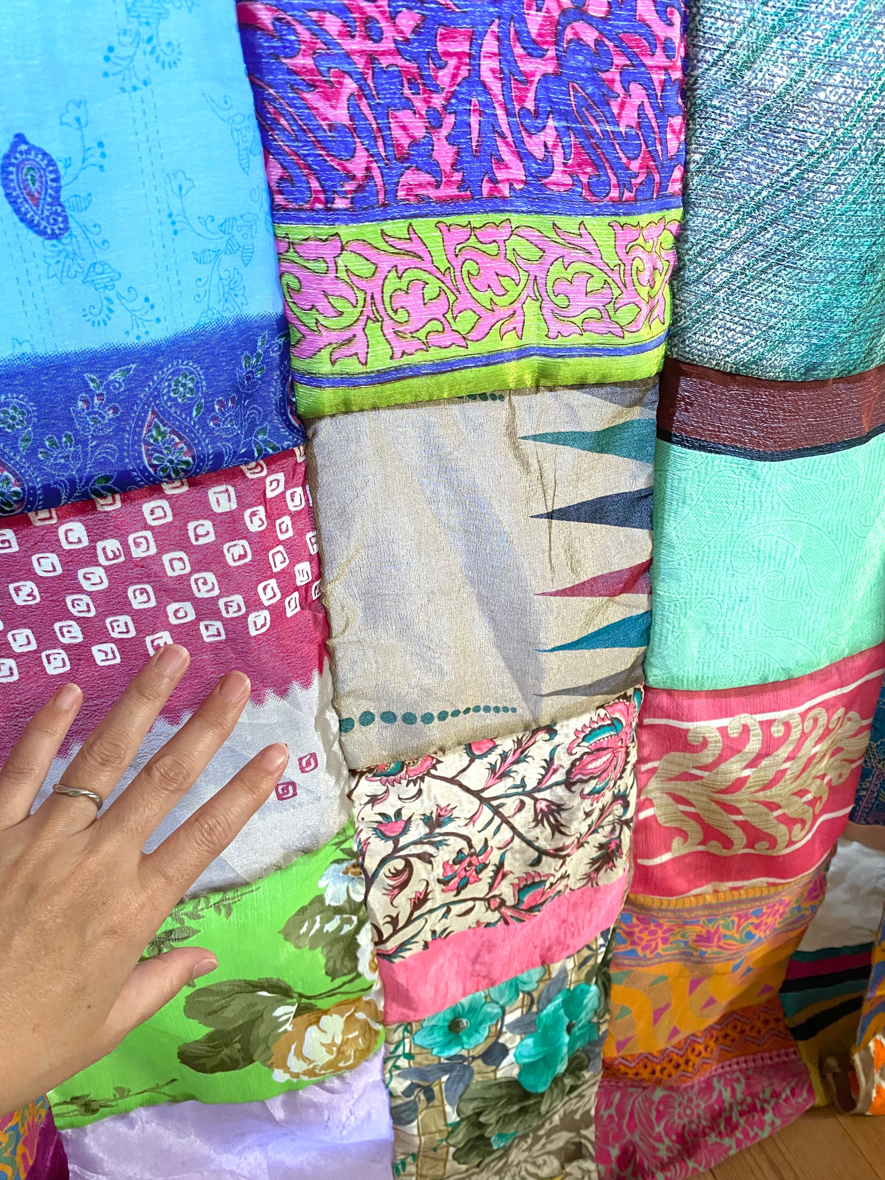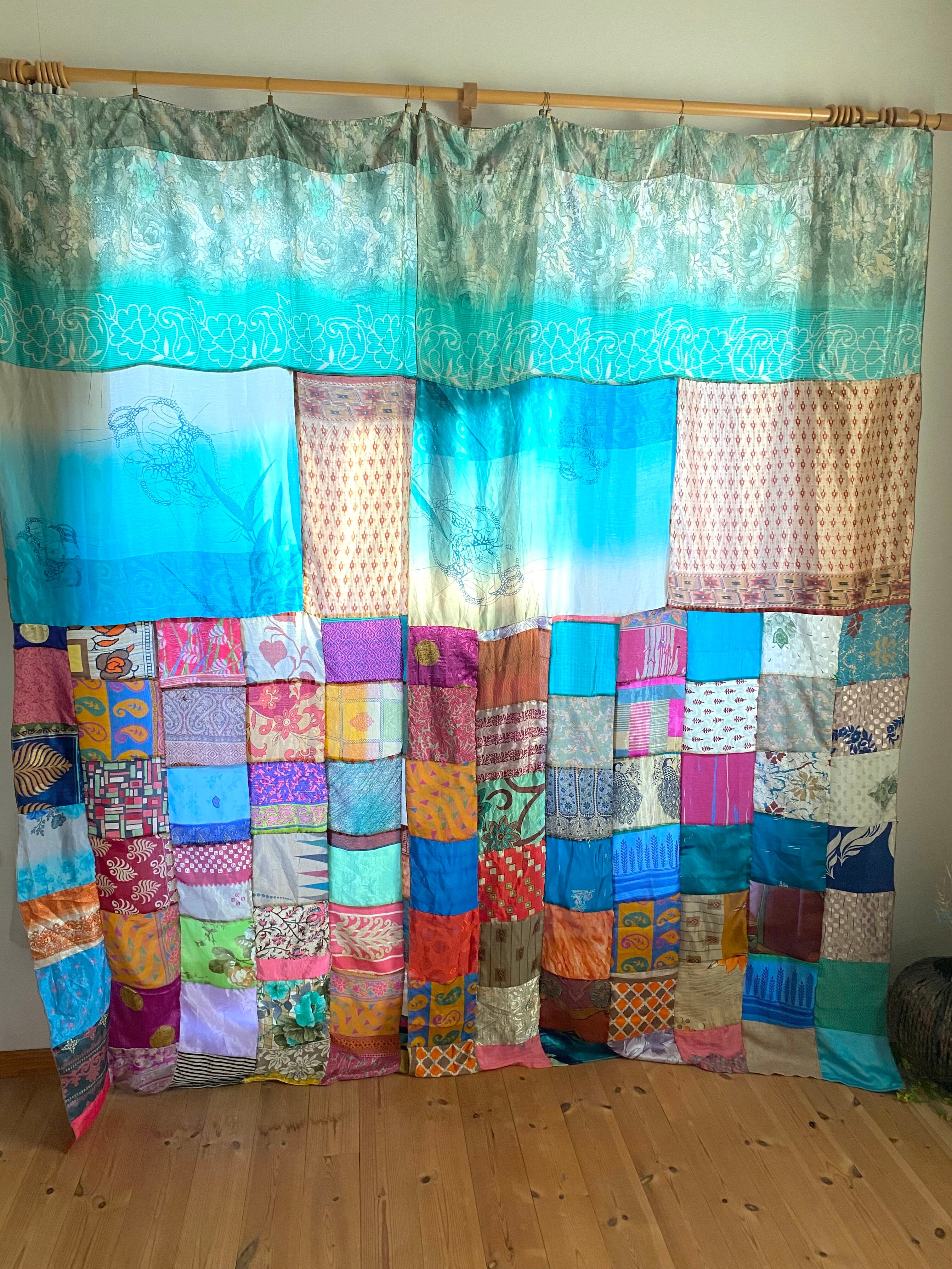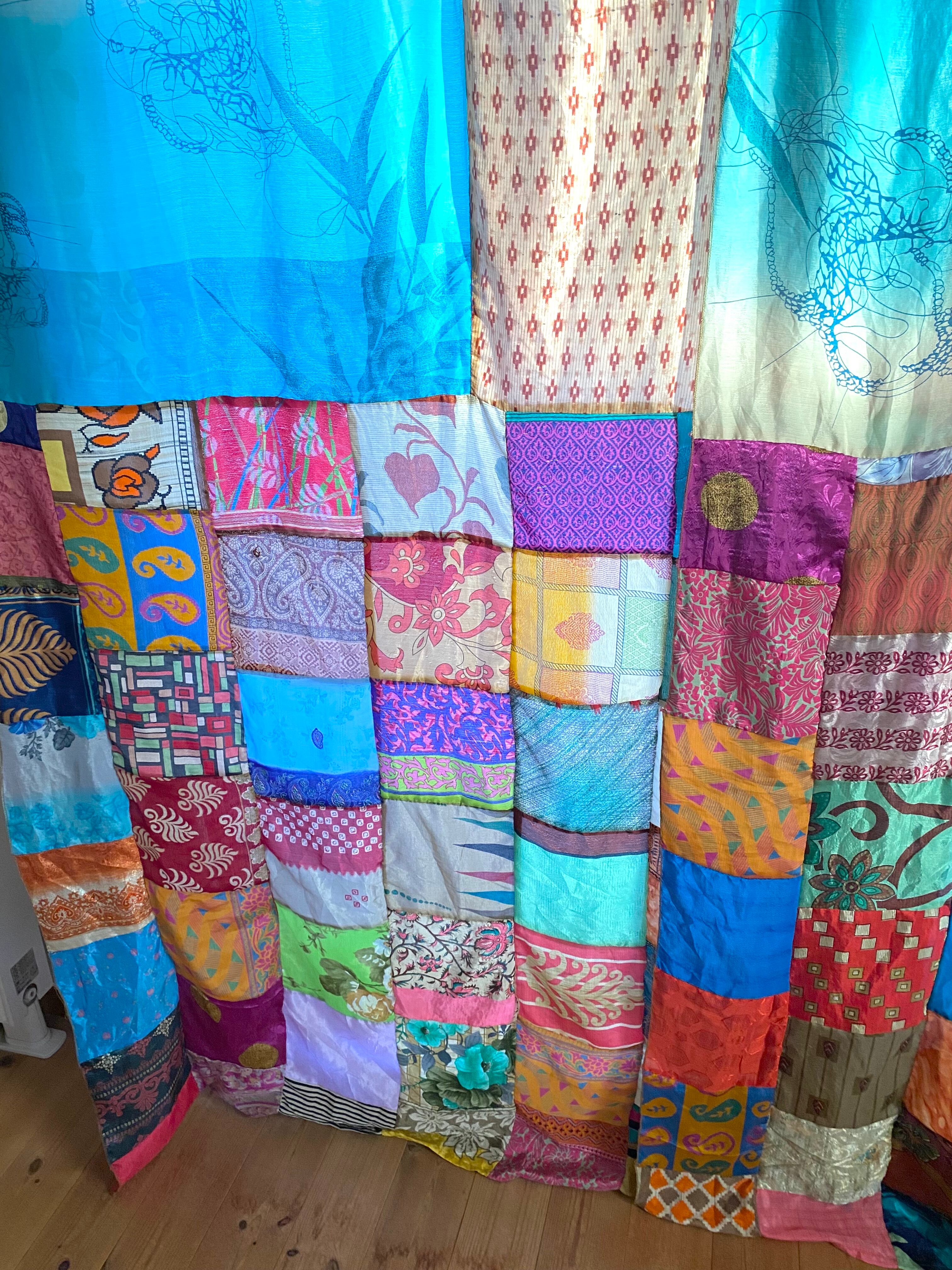 シルクのスカーフを1枚1枚丁寧に繋ぎ合わせ、大変カラフルできれいなパッチワークカーテンにアップサイクルされました!!