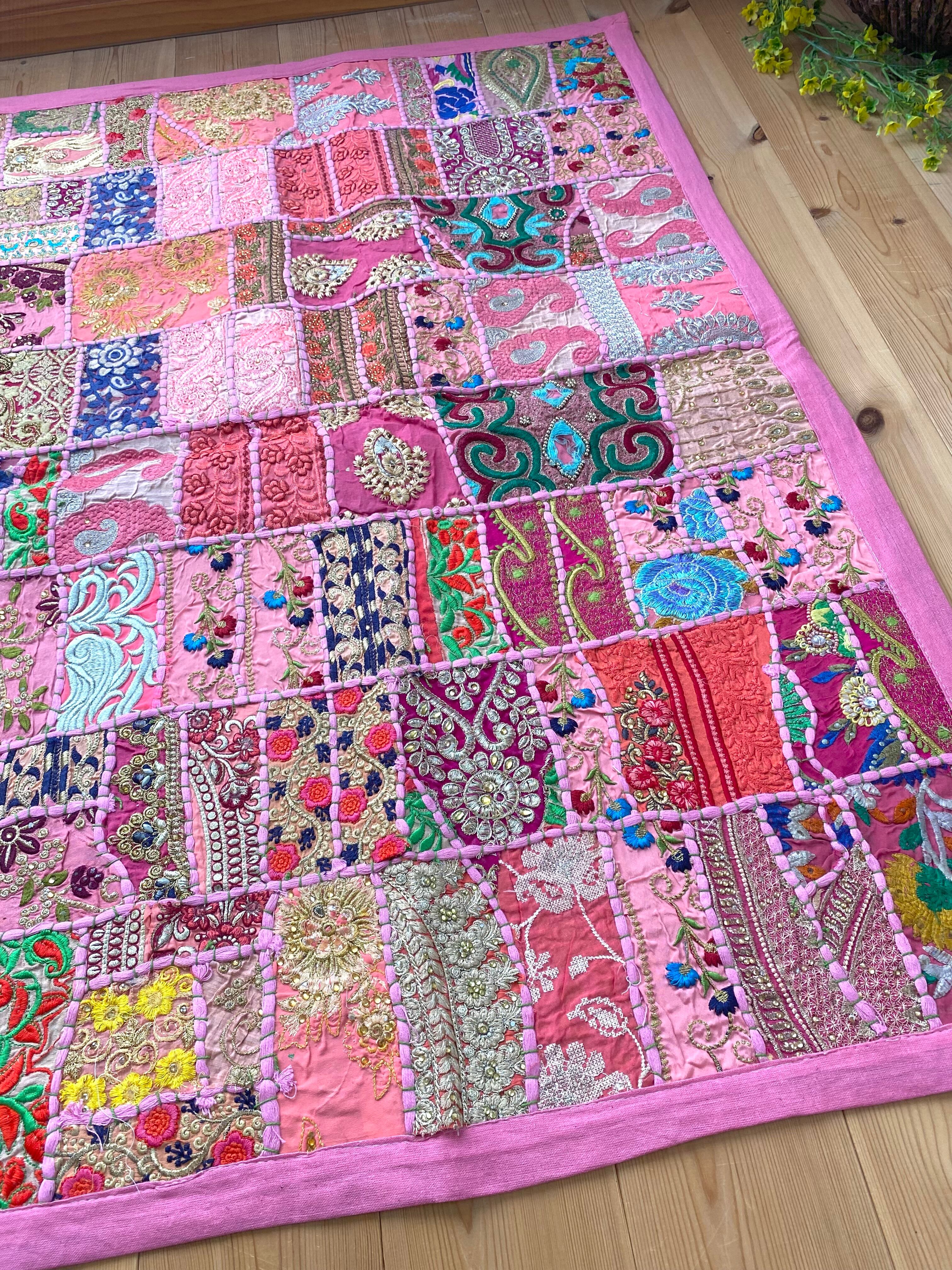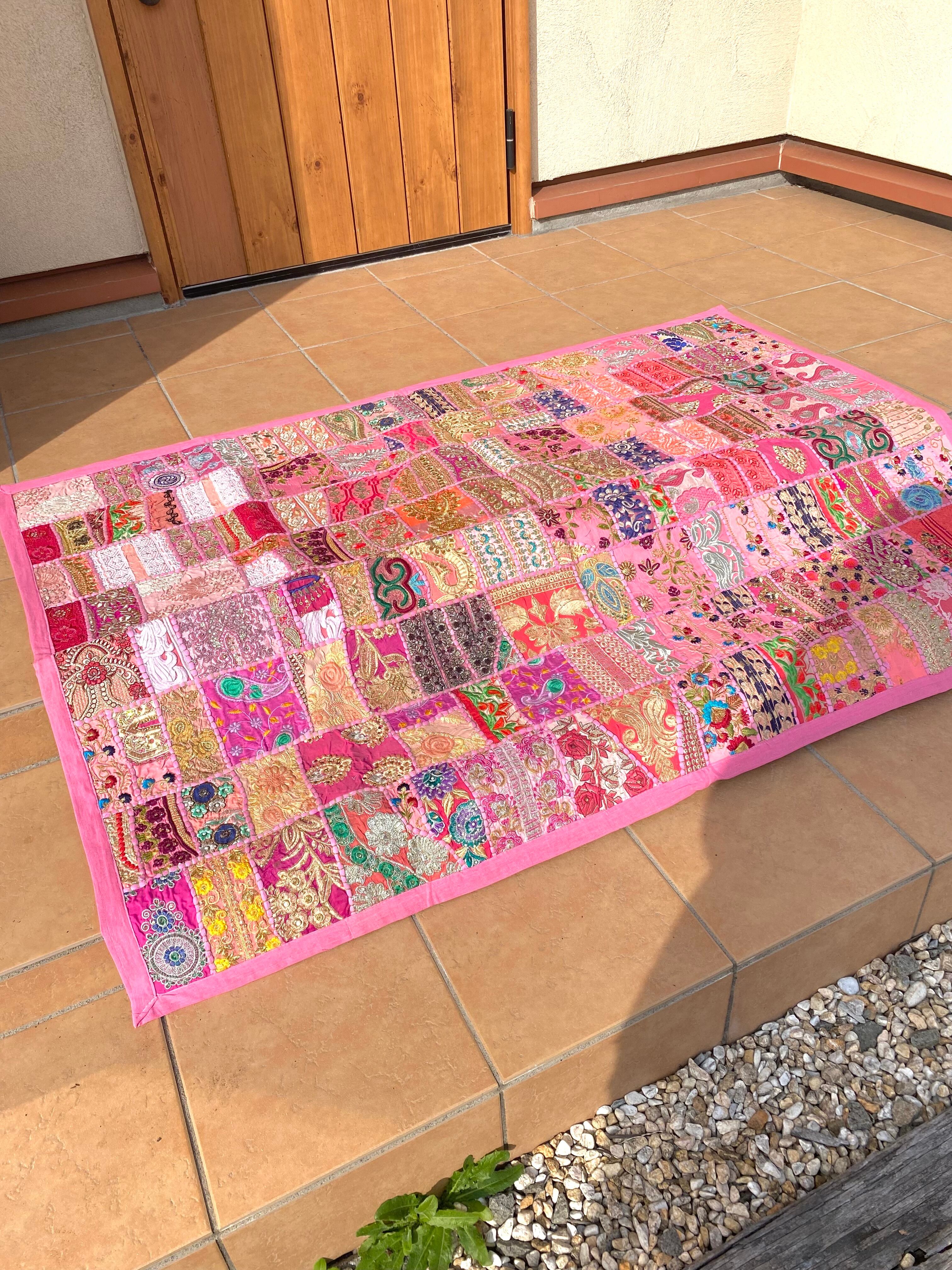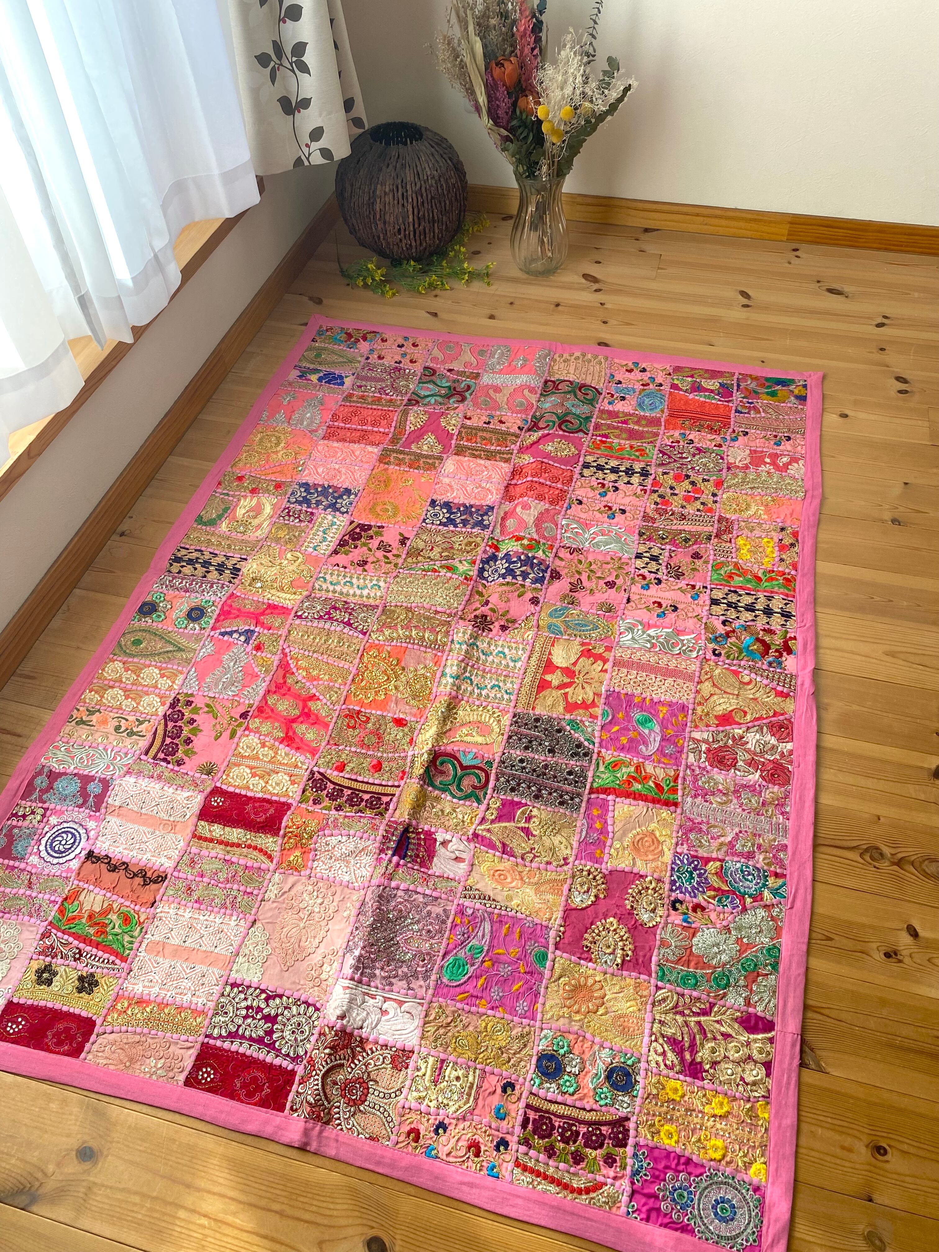 ピンクトルマリン・柄ピンクさん/ザリ刺繍タペストリーラグ