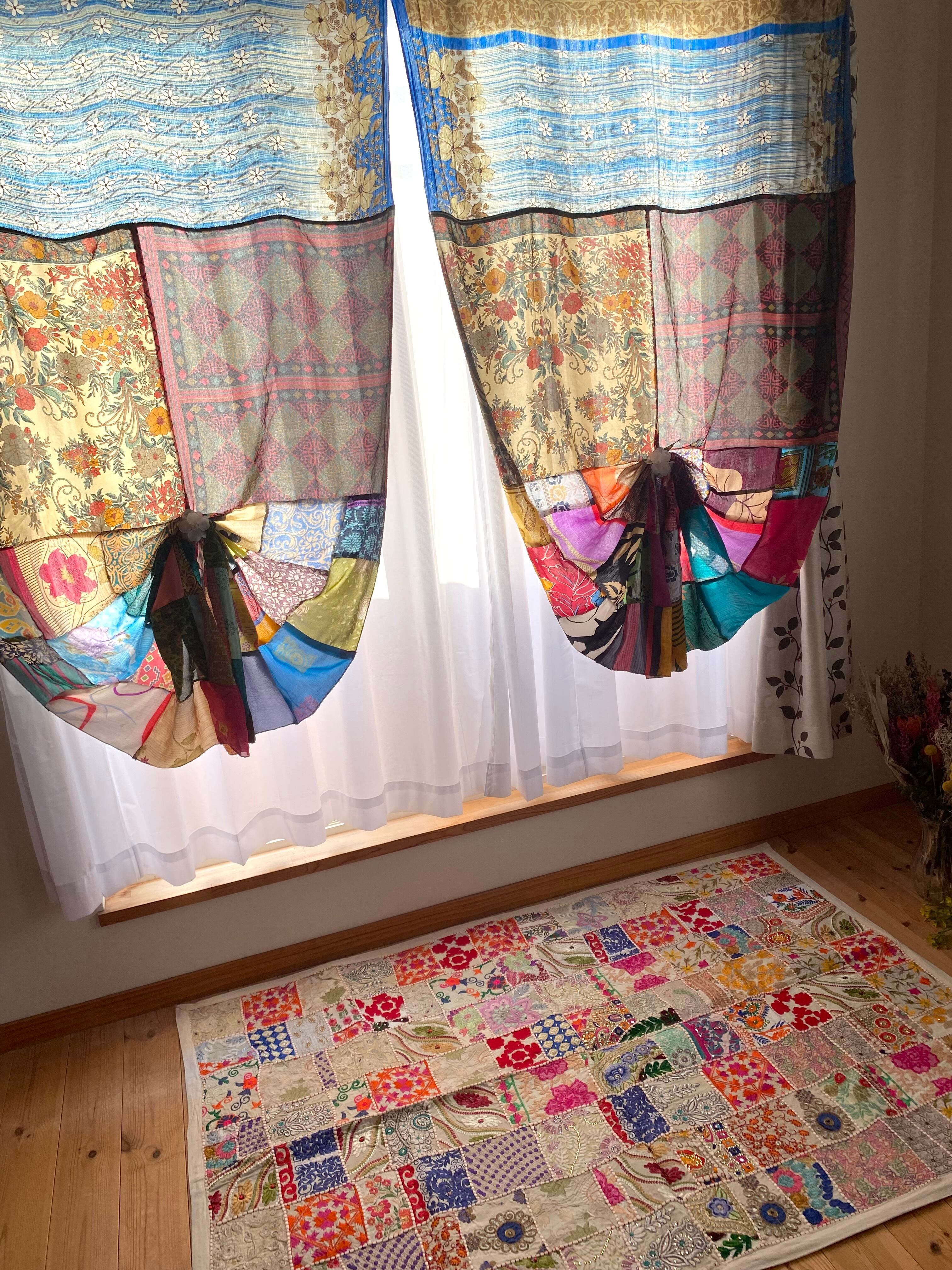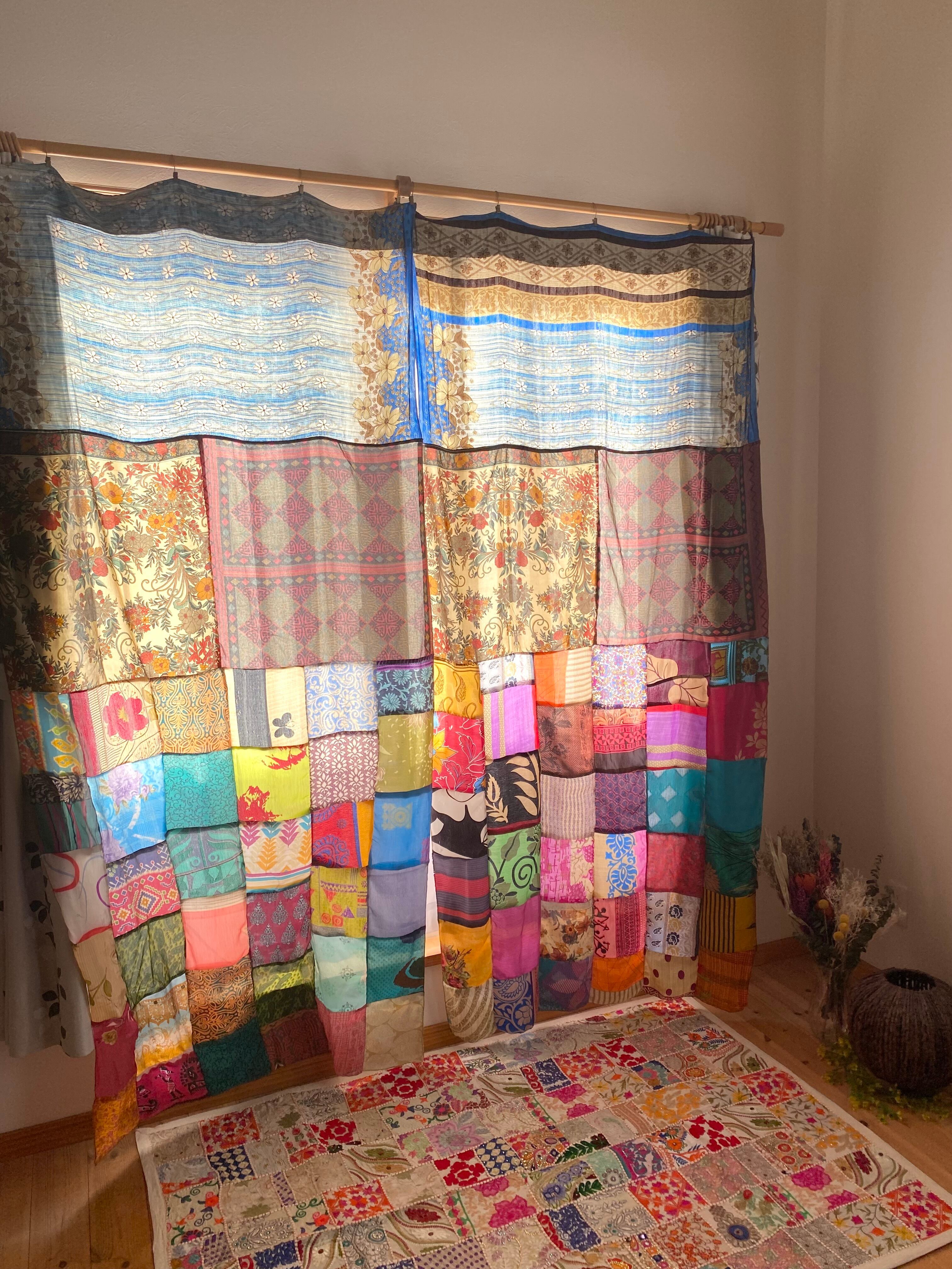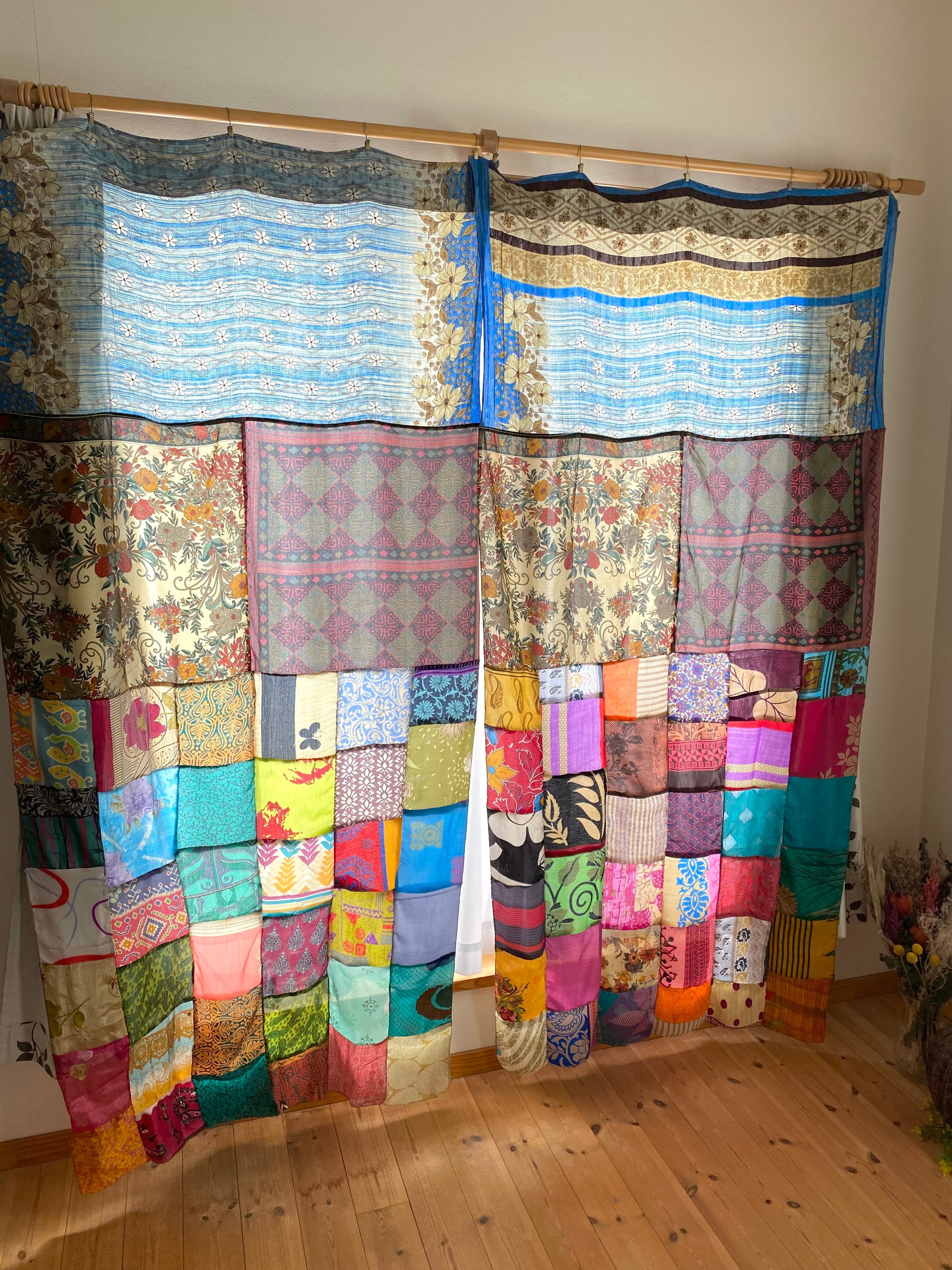 シルクのスカーフを1枚1枚丁寧に繋ぎ合わせ、大変カラフルできれいなパッチワークカーテンにアップサイクルされました!!