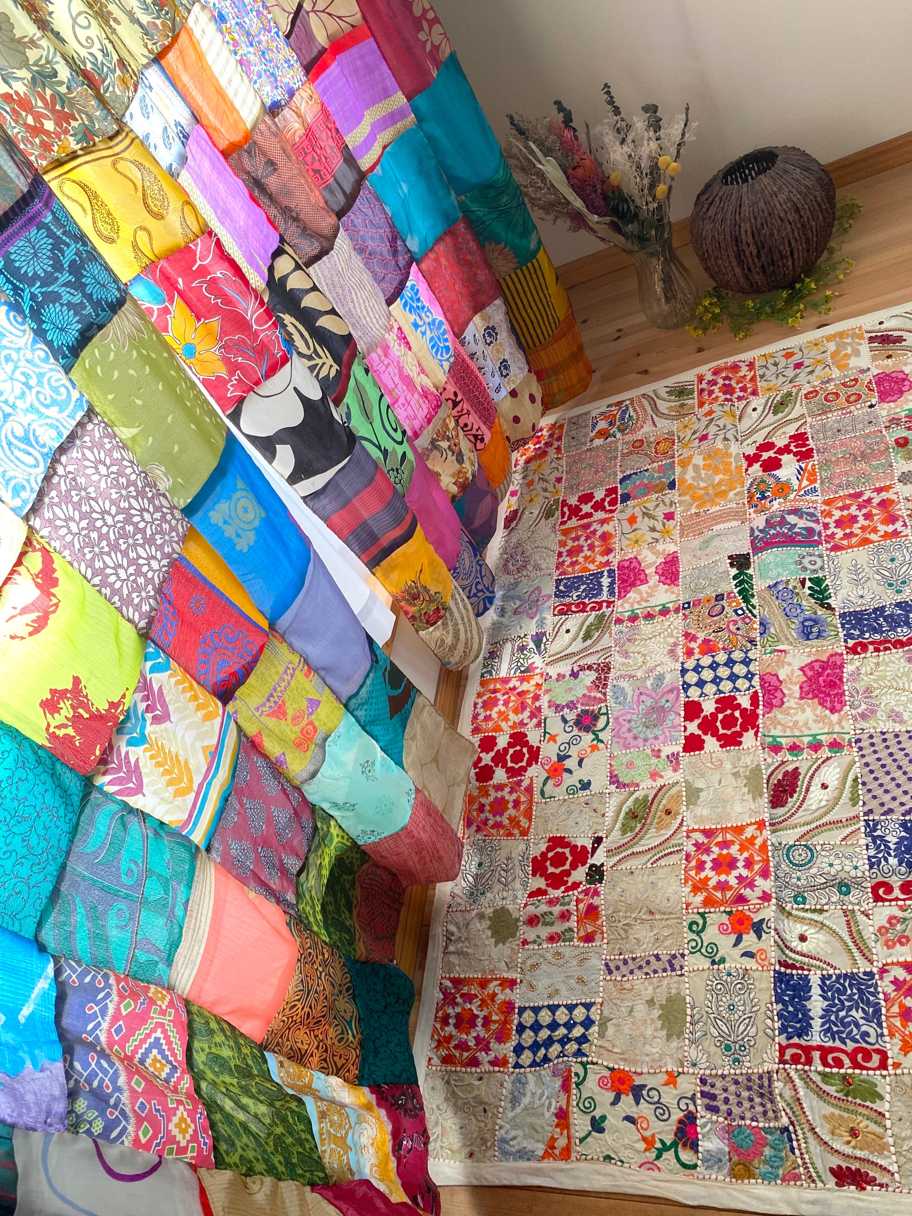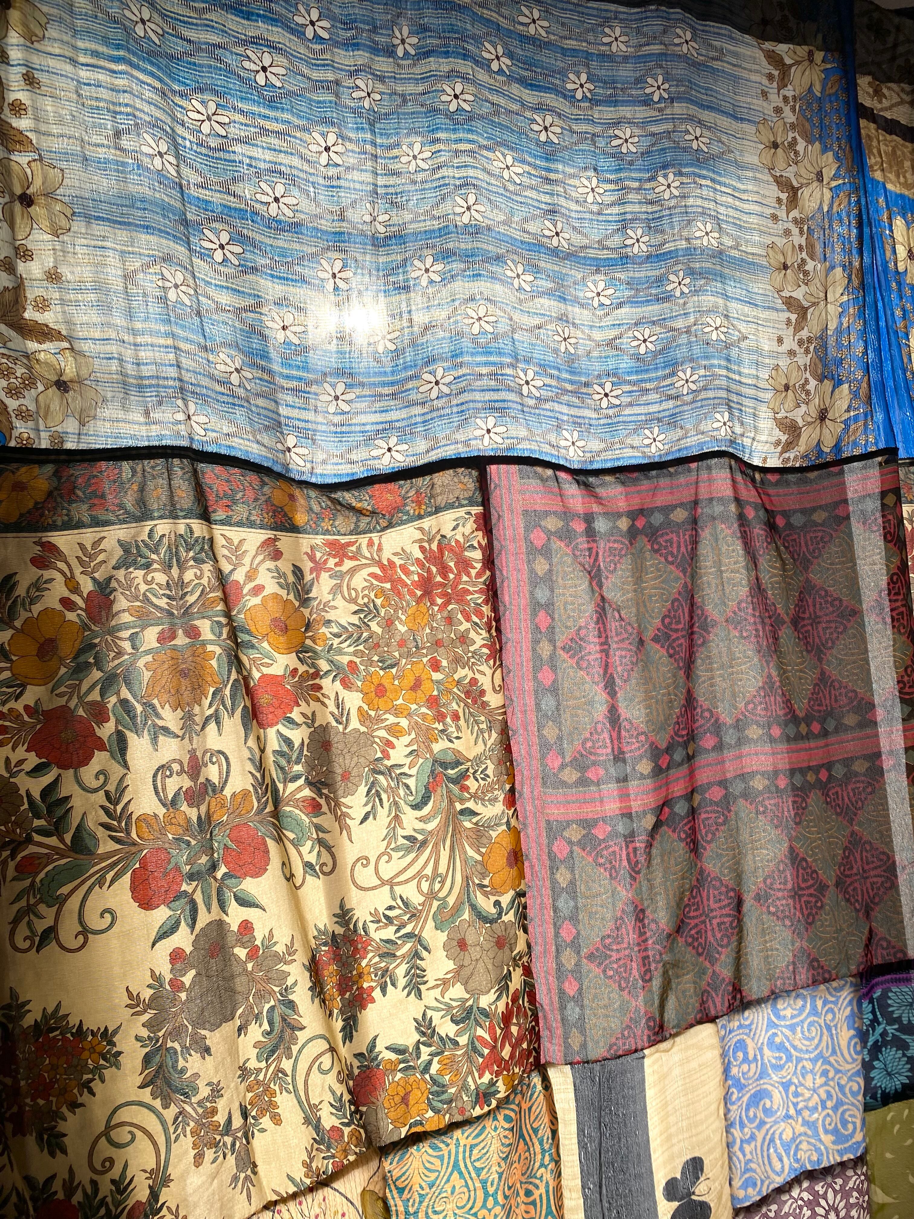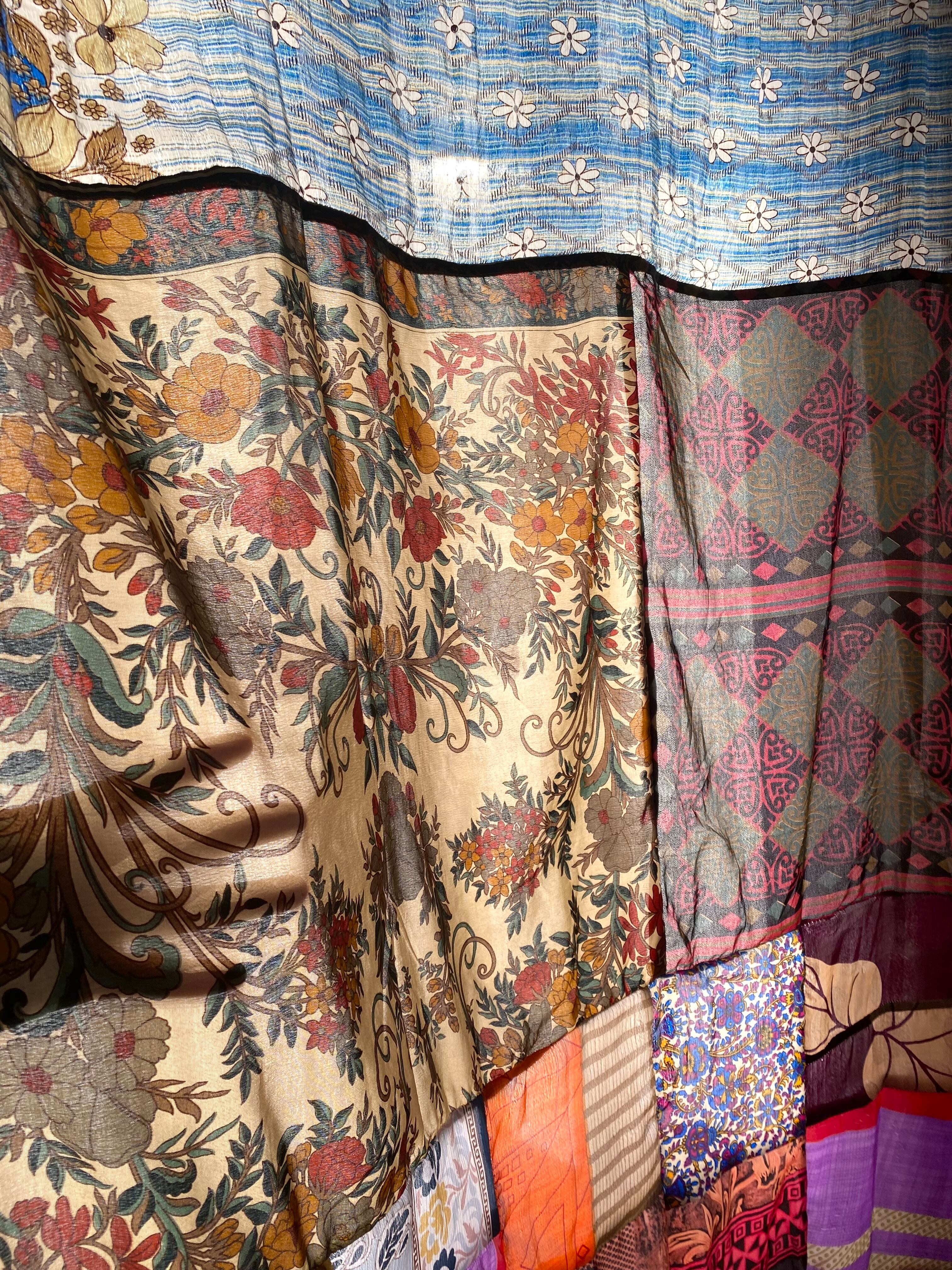 シルクのスカーフを1枚1枚丁寧に繋ぎ合わせ、大変カラフルできれいなパッチワークカーテンにアップサイクルされました!!