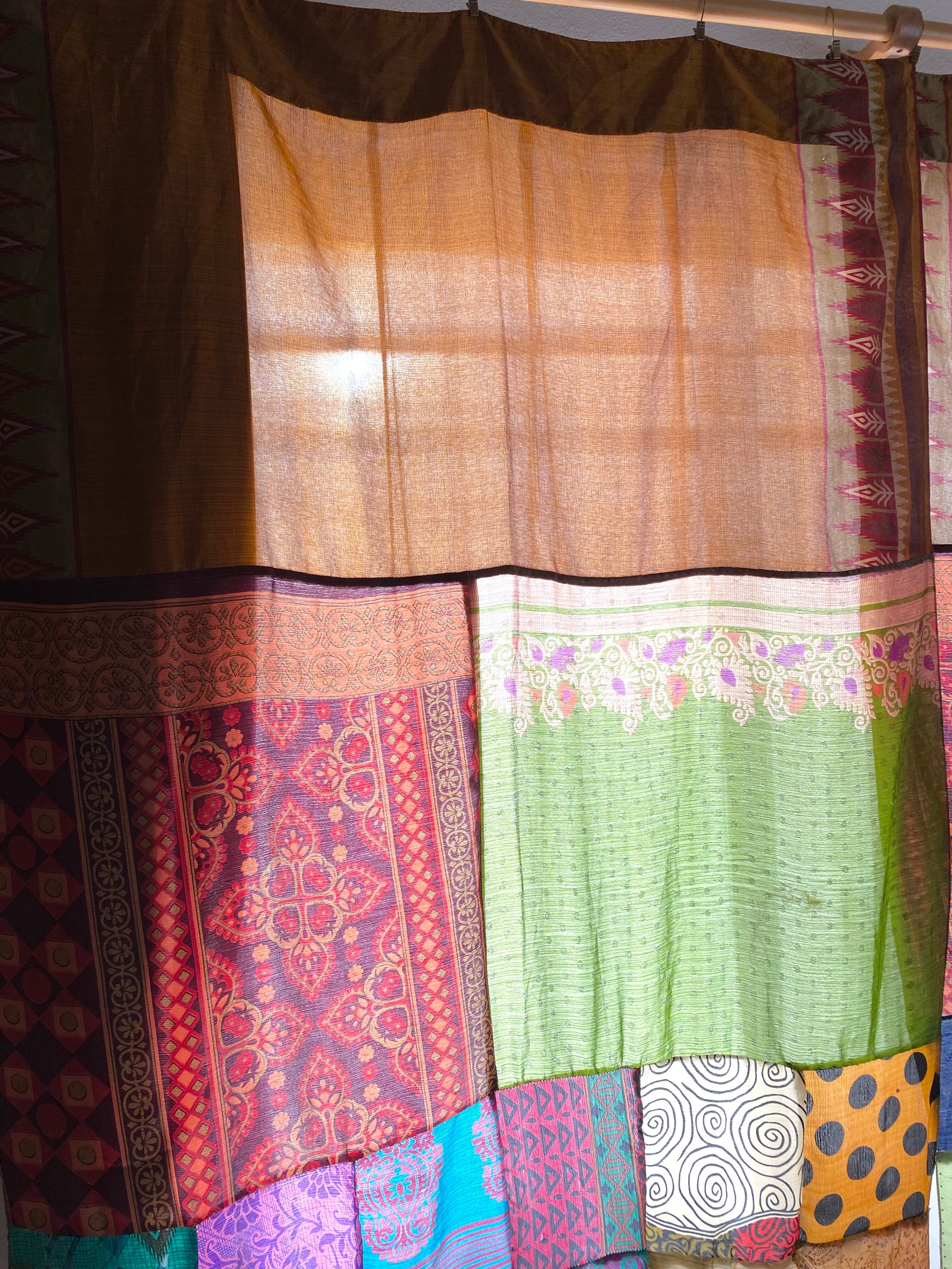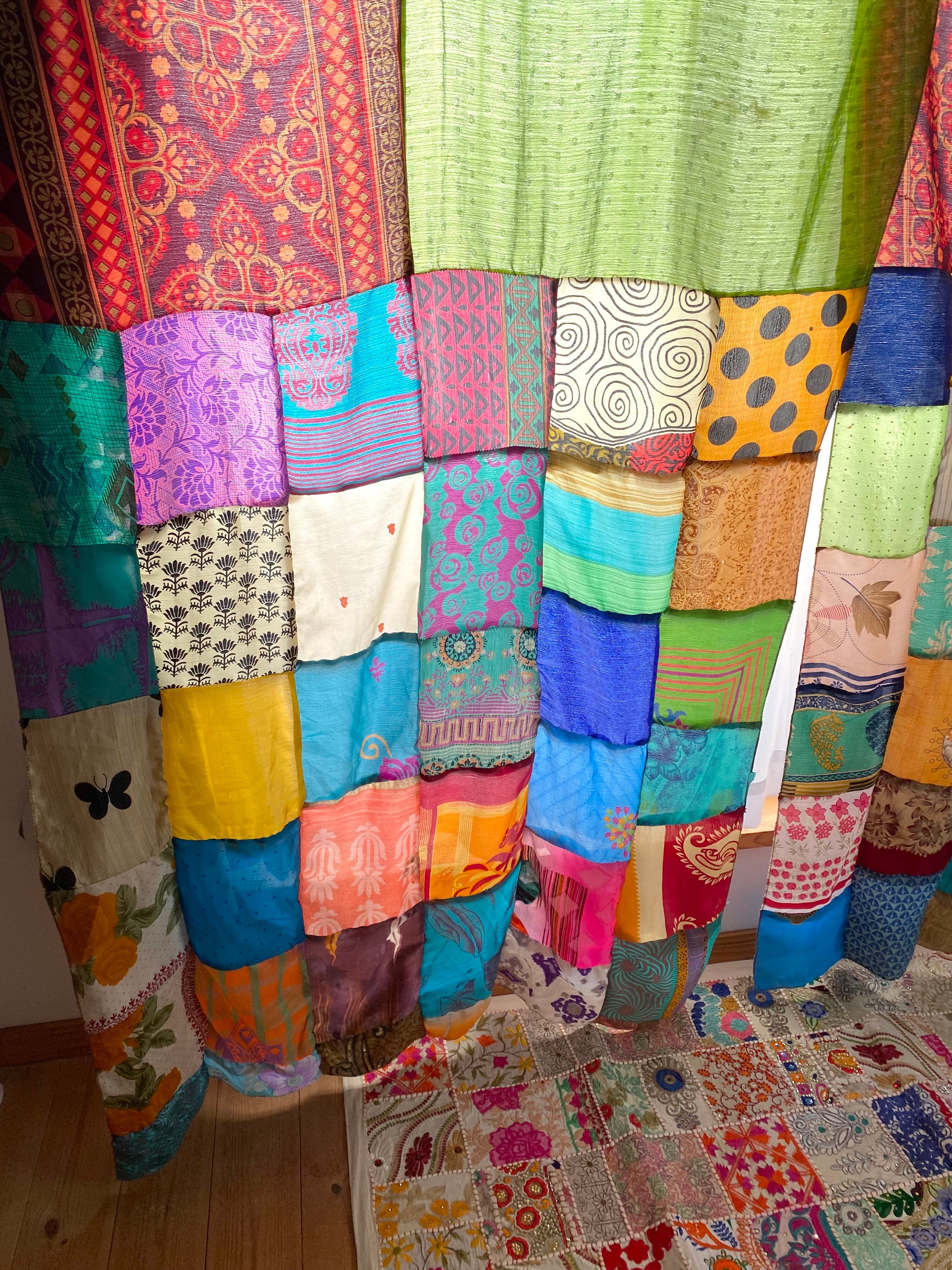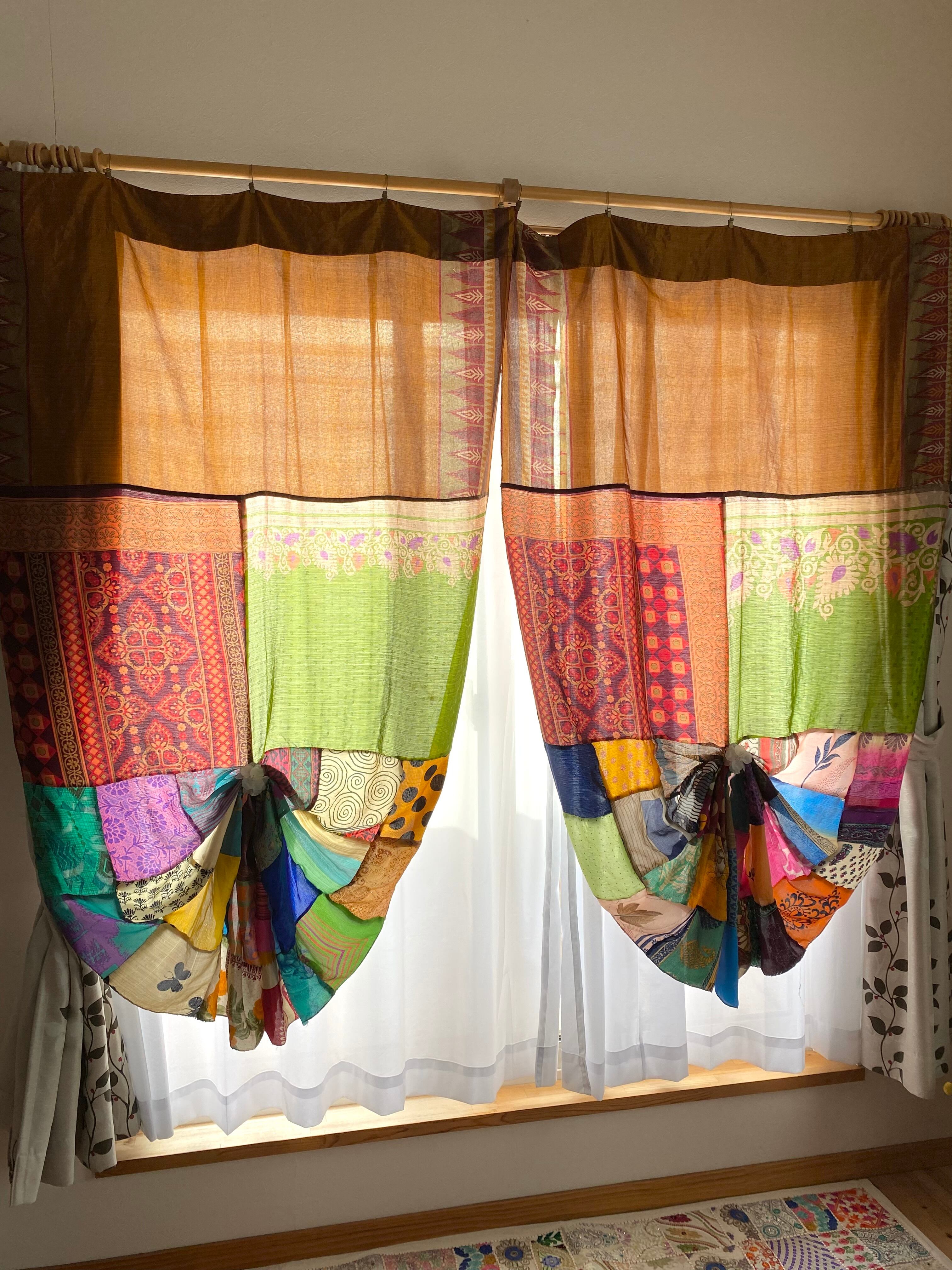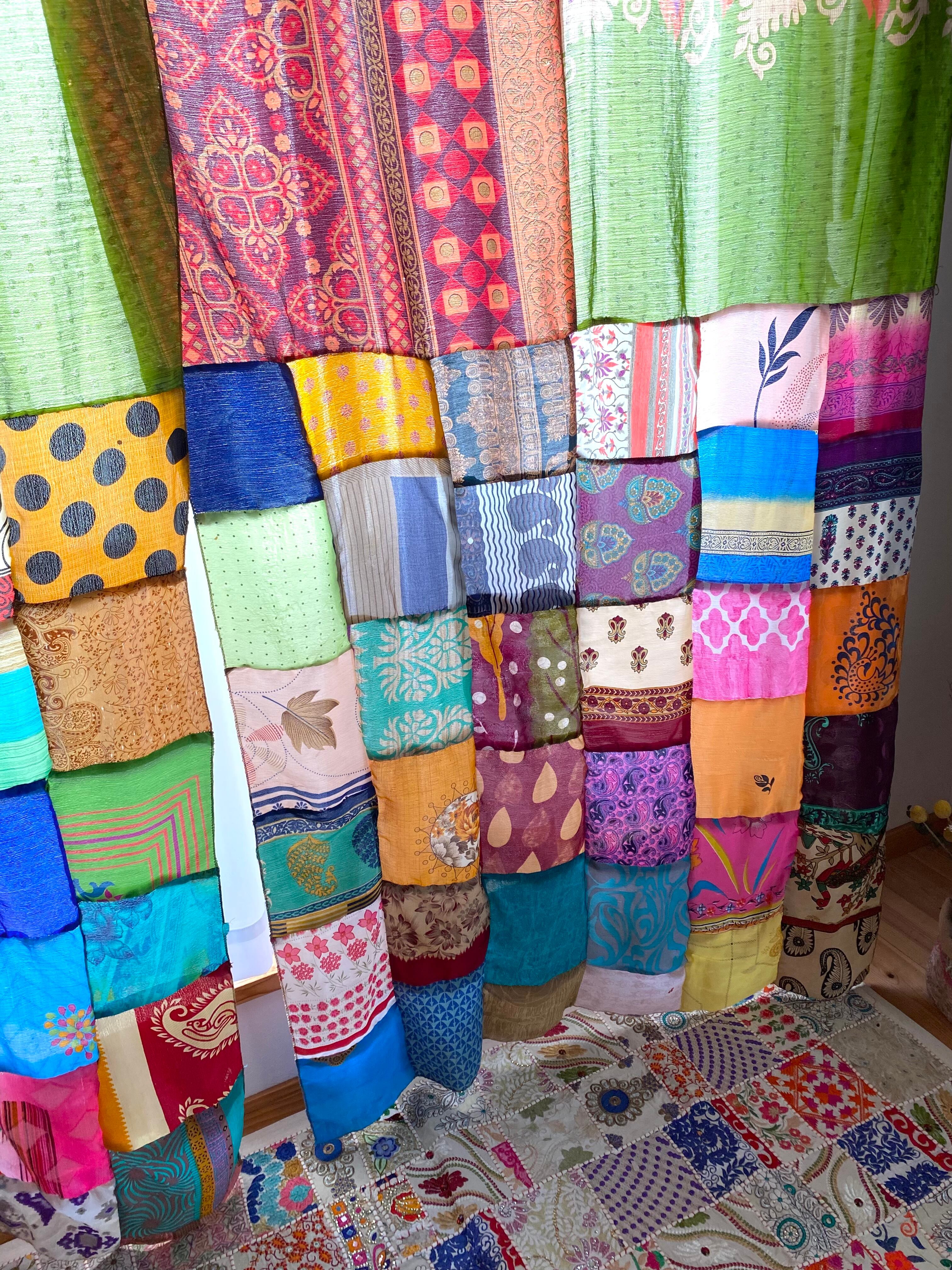 シルクのスカーフを1枚1枚丁寧に繋ぎ合わせ、大変カラフルできれいなパッチワークカーテンにアップサイクルされました!!