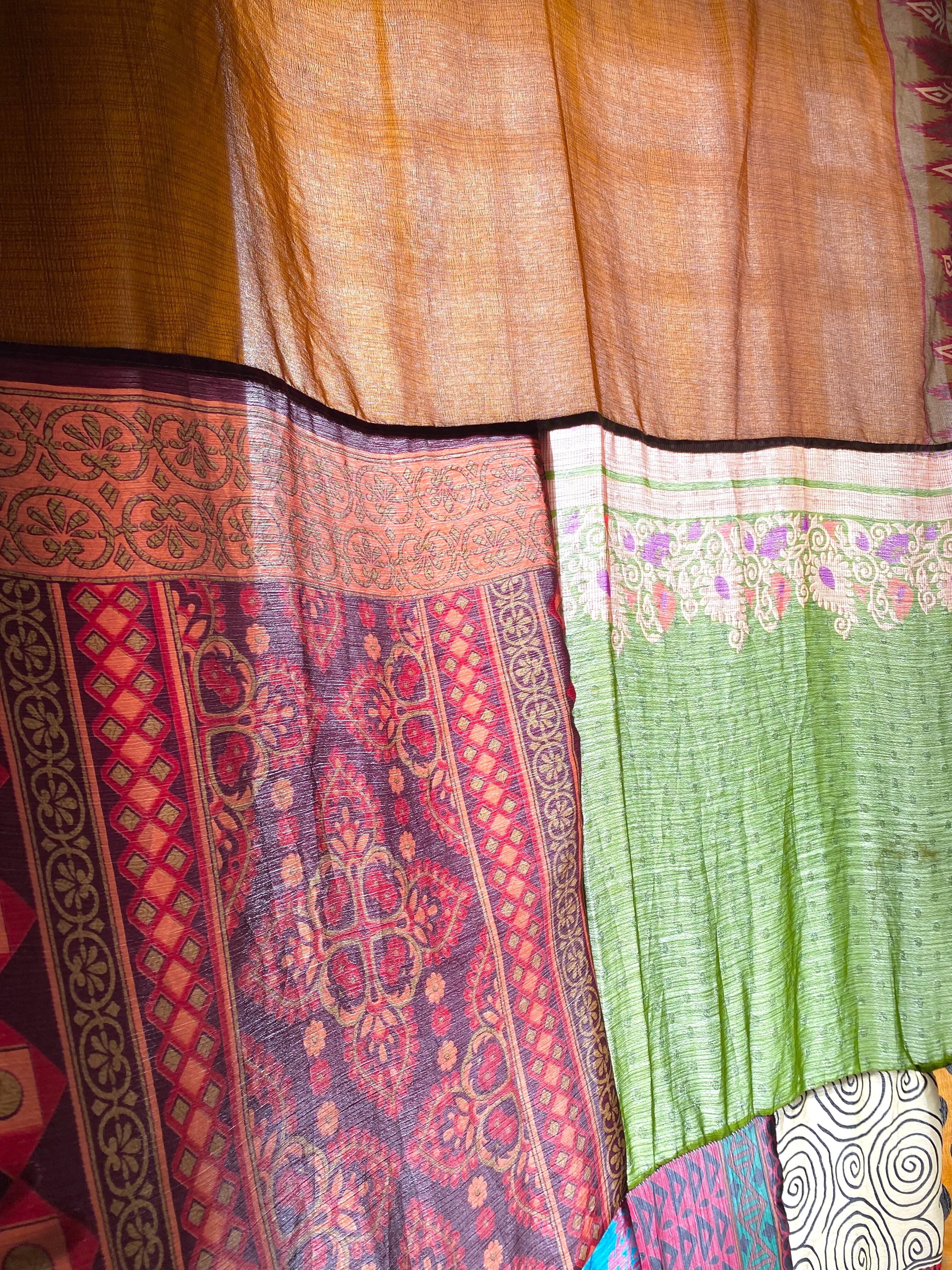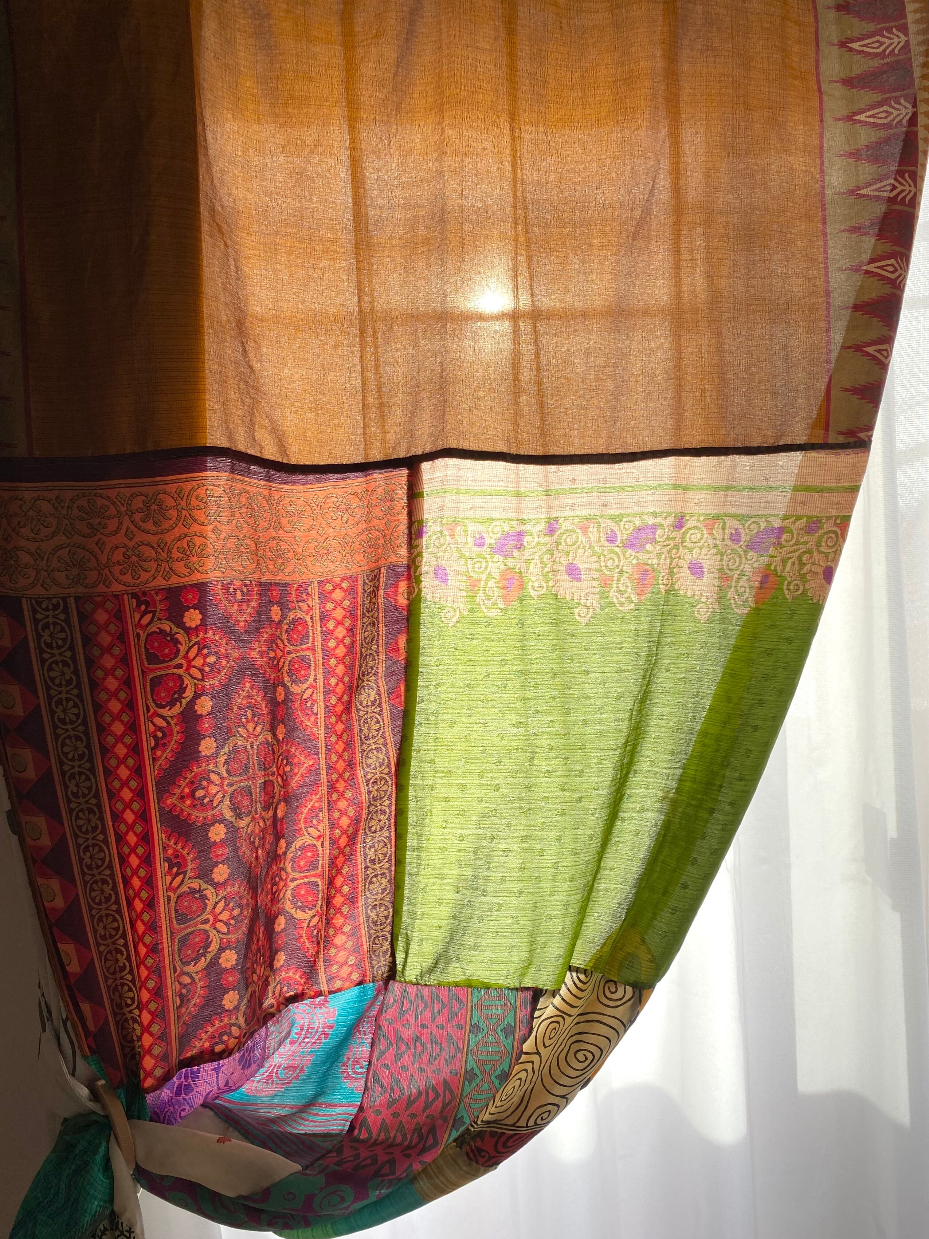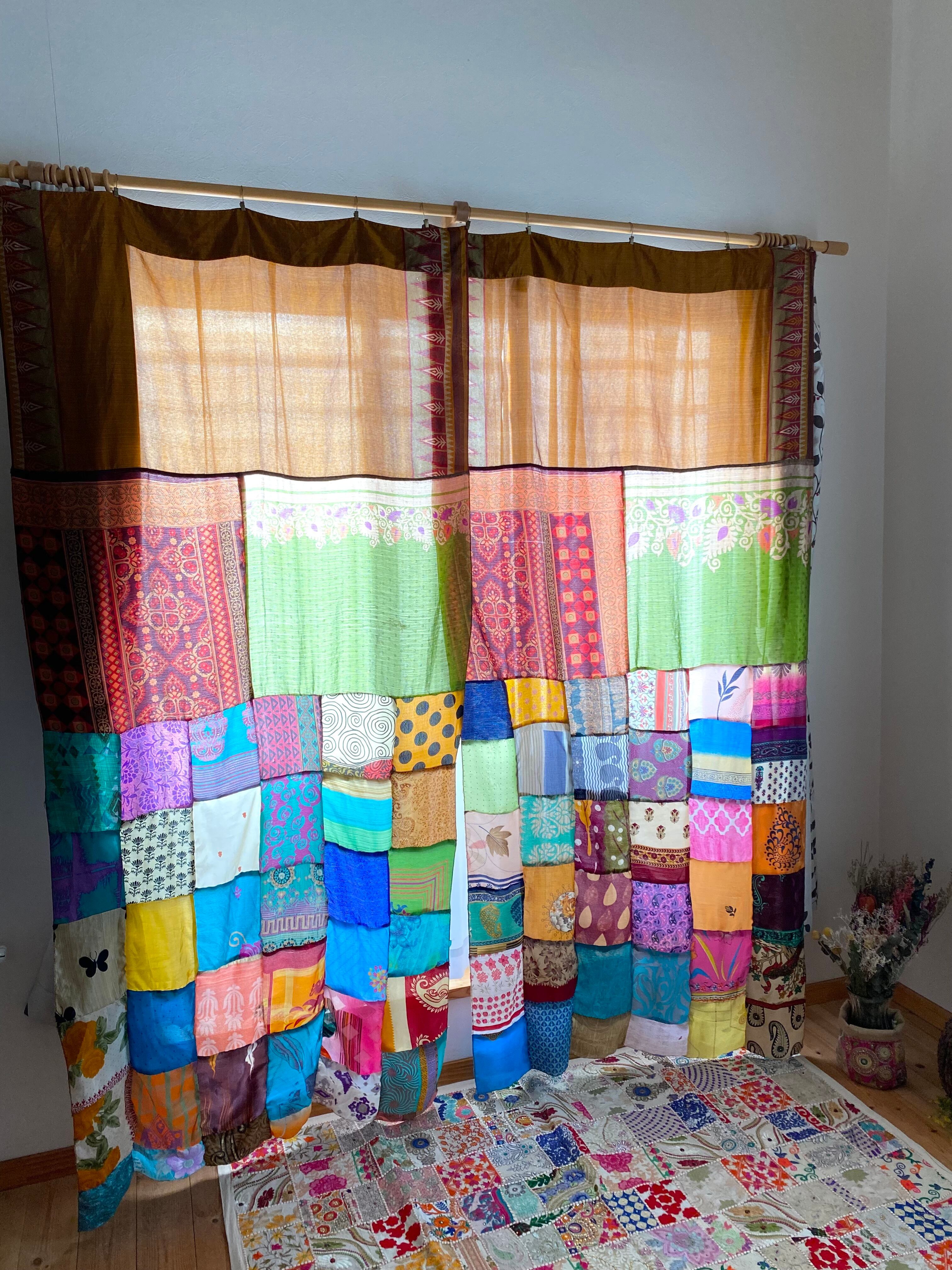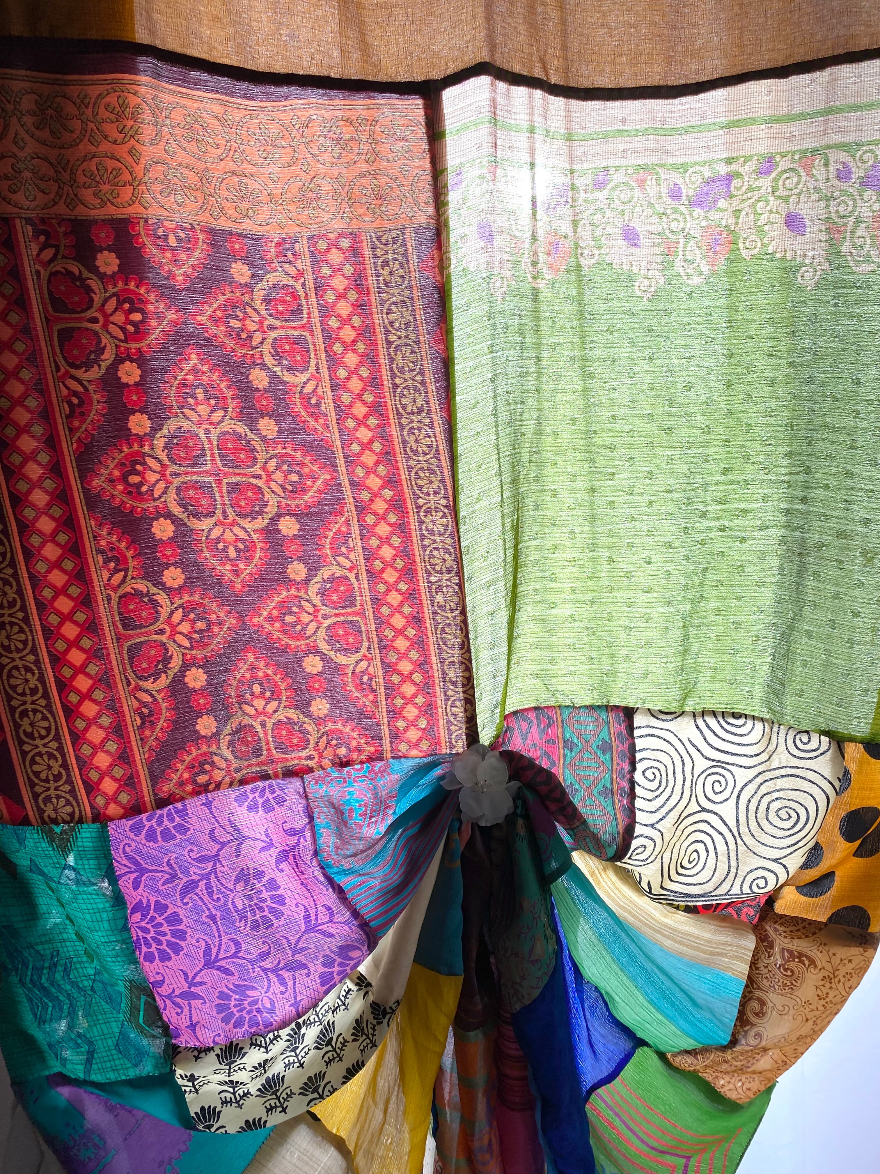 シルクのスカーフを1枚1枚丁寧に繋ぎ合わせ、大変カラフルできれいなパッチワークカーテンにアップサイクルされました!!